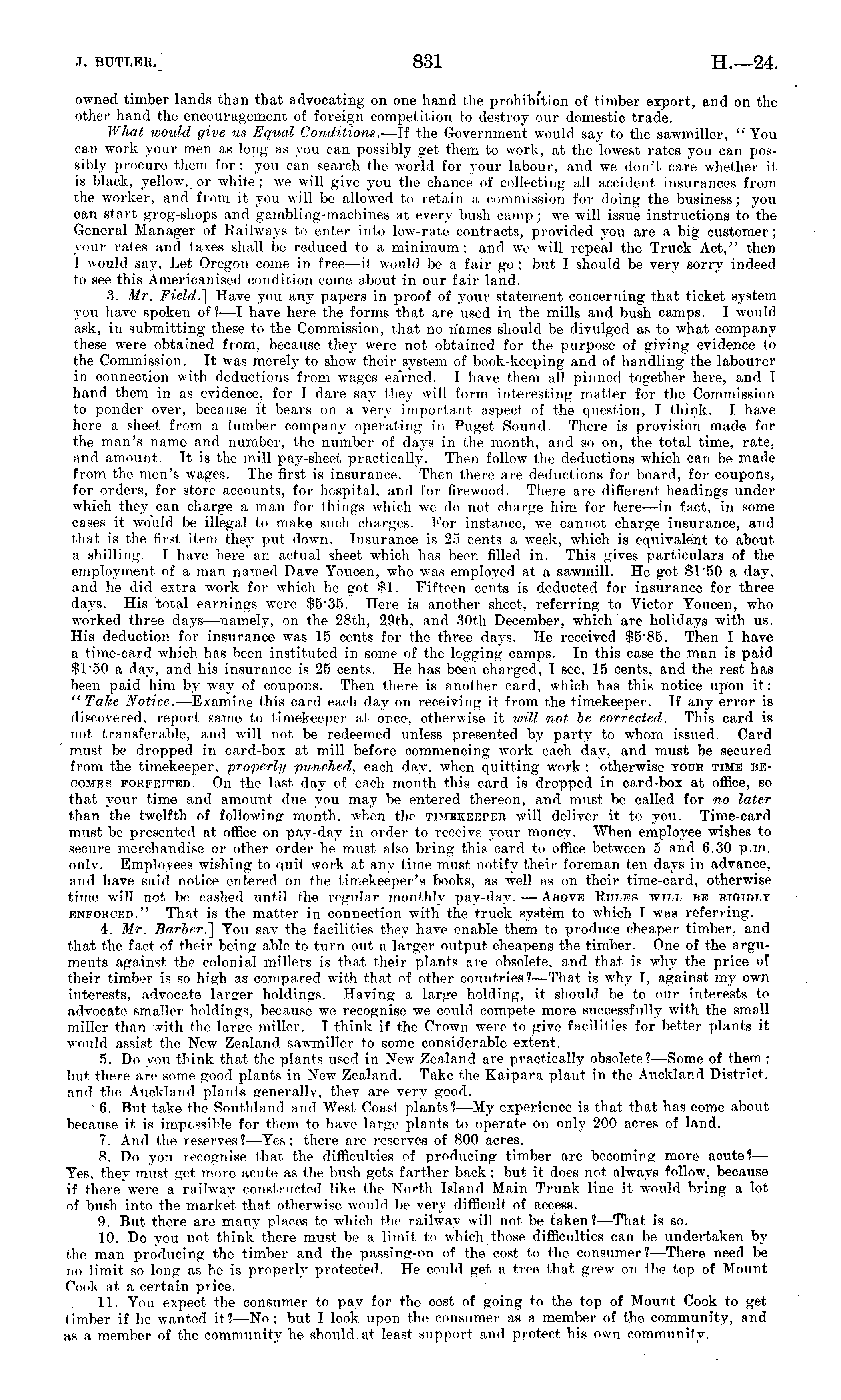 owned timber lands than that advocating on one hand the prohibition of timber export, and on the other hand the encouragement of foreign competition to destroy our domestic trade. What would give us Equal Conditions. —lf the Government would say to the sawmiller, " You can work your men as long as you can possibly get them to work, at the lowest rates you can possibly procure them for; you can search the world for your labour, and we don't care whether it is black, yellow, or white ; we will give you the chance of collecting all accident insurances from the worker, and from it you will be allowed to retain a commission for doing the business; you can start grog-shops and gambling-machines at every bush camp; we will issue instructions to the General Manager of Railways to enter into low-rate contracts, provided you are a big customer; your rates and taxes shall be reduced to a minimum; and we will repeal the Truck Act," then I would say, Let Oregon come in free—it would lie a fair go ; but I should be very sorry indeed to see this Americanised condition come about in our fair land. 3. Mr. Field.~\ Have you any papers in proof of your statement concerning that ticket system you have spoken of?—I have here the forms that are used in the mills and bush camps. I would ask, in submitting these to the Commission, that no names should be divulged as to what company these were obtained from, because they were not obtained for the purpose of giving evidence to the Commission. It was merely to show their system of book-keeping and of handling the labourer in connection with deductions from wages earned. T have them all pinned together here, and I hand them in as evidence, for T dare say they will form interesting matter for the Commission to ponder over, because it bears on a very important aspect of the question, I think. I have here a sheet from a lumber company operating in Puget Sound. There is provision made for the man's name and number, the number of days in the month, and so on, the total time, rate, and amount. It is the mill pay-sheet practically. Then follow the deductions which can be made from the men's wages. The first is insurance. Then there are deductions for board, for coupons, for orders, for store accounts, for hospital, and for firewood. There are different headings under which they can charge a man for things which we do not charge him for here—in fact, in some cases it would be illegal to make such charges. For instance, we cannot charge insurance, and that is the first item they put down. Insurance is 25 cents a week, which is equivalent to about a shilling. I have here an actual sheet which has been filled in. This gives particulars of the employment of a man named Dave Youcen, who was employed at a sawmill. He got $I*so a day, and he did extra work for which he got $1. Fifteen cents is deducted for insurance for three days. His total earnings were $5*35. Here is another sheet, referring to Victor Youcen, who worked three days—namely, on the 28th, 2.9 th, and 30th December, which are holidays with us. His deduction for insurance was 15 cents for the three days. He received $585. Then I have a time-card which has been instituted in some of the logging camps. In this case the man is paid $l"50 a day, and his insurance is 25 cents. He has been charged, I see, 15 cents, and the rest has been paid him by way of coupons. Then there is another card, which has this notice upon it: " Take Notice. —Examine this card each day on receiving it from the timekeeper. If any error is discovered, report same to timekeeper at once, otherwise it will not he corrected,. This card is not transferable, and will not be redeemed unless presented by party to whom issued. Card must be dropped in card-box at mill before commencing work each day, and must be secured from the timekeeper, properly punched, each day, when quitting work ; otherwise touh time becomes forfeited. On the last day of each month this card is dropped in card-box at office, so that your time and amount due you may be entered thereon, and must be called for no later than the twelfth of following month, when the timekeeper will deliver it to you. Time-card must be presented at office on pay-day in order to receive your money. When employee wishes to secure merchandise or other order he must also bring this card to office between 5 and 6.30 p.m. only. Employees wishing to quit work at any time must notify their foreman ten days in advance, and have said notice entered on the timekeeper's books, as well as on their time-card, otherwise time will not be cashed until the regular monthly pay-day. — Above T?uler will be rigidly enforced." That is the matter in connection with the truck system to which I was referring. 4. Mr. Barber.] You say the facilities they have enable them to produce cheaper timber, and that the fact of their being able to turn out a larger output cheapens the timber. One of the arguments against the colonial millers is that their plants are obsolete, and that is why the price of their timber is so high as compared with that of other countries? —That is why I, against my own interests, advocate larger holdings. Having a large holding, it should be to our interests to advocate smaller holdings, because we recognise we could compete more successfully with the small miller than with the large miller. I think if the Crown were to give facilities for better plants it would assist the New Zealand sawmiller to some considerable extent. 5. Do you think that the plants used in New Zealand are practically obsolete?— Some of them ; but there are some good plants in New Zealand. Take the Kaipara plant in the Auckland District, and the Auckland plants generally, they are very good. 6. But take the Southland and West Coast plants?—My experience is that that has come about because it is impossible for them to have large plants to operate on only 200 acres of land. 7. And the reserves? —Yes; there are reserves