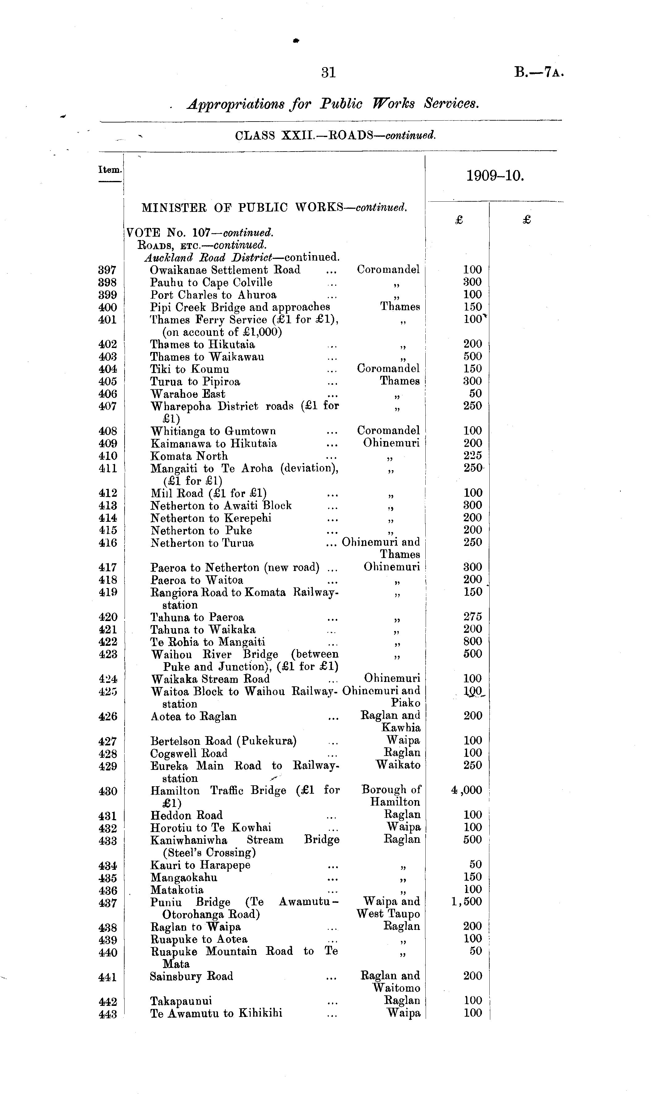 tarn. 1909-10. MINISTER OF PUBLIC WOEKS— continued. VOTE No. 107— continued. Roads, etc. — continued. Auckland Boad District —continued. Owaikanae Settlement Road ... Coromandel Pauhu to Cape Colville ... „ Port Charles to Ahuroa ... „ Pipi Creek Bridge and approaches Thames Thames Ferry Service (£1 for £1), „ (on account of £1,000) Thames to Hikutaia .. ,, Thames to Waikawau ... „ Tiki to Koumu ... Coromandel Turua to Pipiroa ... Thames Warahoe East ... „ Wharepoha District roads (£1 for „ £1) Whitianga to Gumtown ... Coromandel Kaimanawa to Hikutaia ... Ohinemuri Komata North ... ,, Mangaiti to Te Aroha (deviation), „ (£1 for £1) Mill Road (£1 for £1) Netherton to Awaiti Block ... ,, Netherton to Kerepehi ... „ Netherton to Puke ... „ Netherton to Turua ... Ohinemuri and Thames Paeroa to Netherton (new road) ... Ohinemuri Paeroa to Waitoa ... „ Rangiora Road to Komata Railway- ,, station Tahuna to Paeroa ... „ Tahuna to Waikaka ... „ Te Rohia to Mangaiti ... „ Waihou River Bridge (between ,, Puke and Junction), (£1 for £1) Waikaka Stream Road ... Ohinemuri Waitoa Block to Waihou Railway- Ohinemuri and station Piako Aotea to Raglan ... Raglan and Kawhia Bertelson Road (Pukekura) ... Wai pa Cogswell Road ... Raglan Eureka Main Road to Railway- Waikato station Hamilton Traffic Bridge (£1 for Borough of £1) Hamilton Heddon Road ... Raglan Horotiu to Te Kowhai ... Waipa Kaniwhaniwha Stream Bridge Raglan (Steel's Crossing) Kauri to Harapepe ... „ Mangaokahu ... „ Matakotia ... „ Puniu Bridge (Te Awamutu- Waipa and Otorohanga Road) West Taupo Raglan to Waipa ... Raglan Ruapuke to Aotea ... „ Ruapuke Mountain Road to Te „ Mata Sainsbury Road ... Raglan and Waitomo Takapaunui ... Raglan Te Awamutu to Kihikihi ... Waipa £ 397 398 399 400 401 100 300 100 150 IOC 402 403 404 405 406 407 200 500 150 300 50 250 408 409 410 411 100 200 225 250 412 413 414 415 416 100 300 200 200 250 417 418 419 300 200 150 ' 420 421 422 423 275 200 800 500 424 425 100 100 426 200 427 428 429 100 100 250 430 4,000 431 432 433 100 100 500 434 435 436 437 50 150 100 1,500 438 439 440 200 100 50 441 200 442 443 100 100