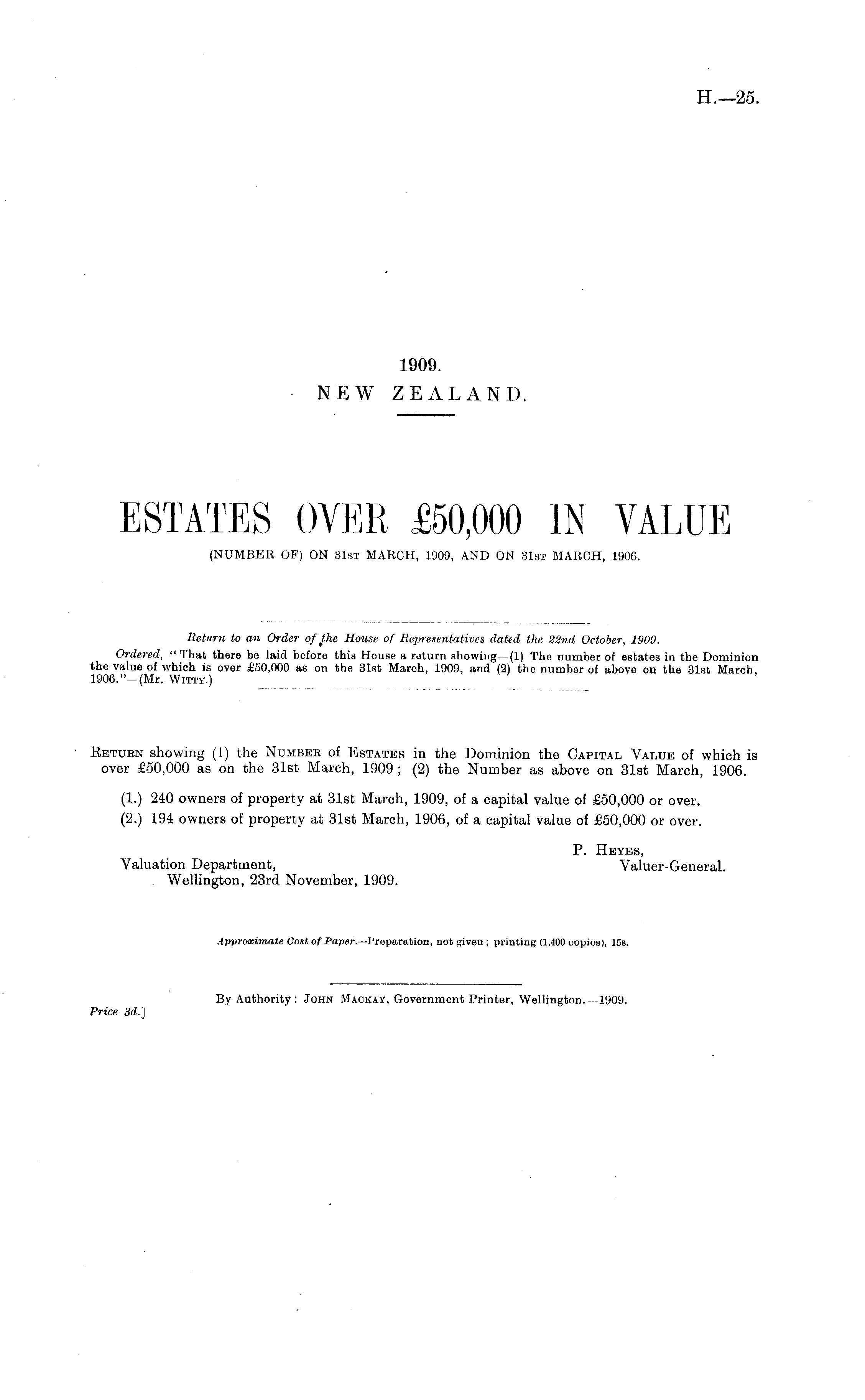 Eeturn showing (1) the Number of Estates in the Dominion the Capital Value of which is over £50,000 as on the 31st March, 1909 ; (2) the Number as above on 31st March, 1906. (1.) 240 owners of property at 31st March, 1909, of a capital value of £50,000 or over. (2.) 194 owners of property at 31st March, 1906, of a capital value of £50,000 or over. P. Heyes, Valuation Department, Valuer-General. Wellington, 23rd November, 1909.