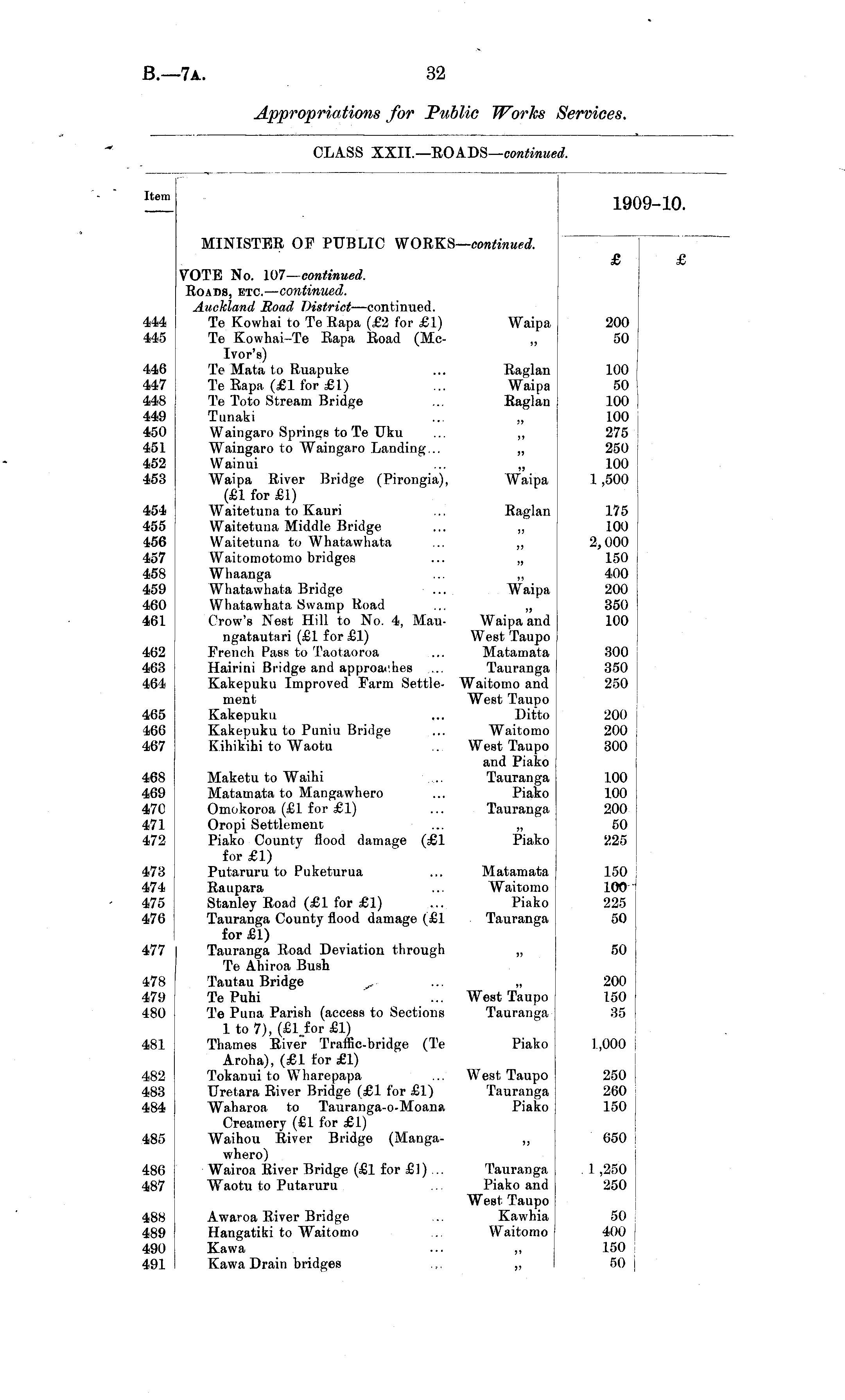 Item 1909-10. MINISTER OF PUBLIC WORKS— continued. VOTE No. 107— continued. Roads, etc. — continued. Auckland Road District —continued. Te Kowhai to Te Rapa (£2 for £1) Waipa Te Kowhai-Te Bapa Road (McIvor's) Te Mata to Ruapuke ... Raglan Te Rapa (£1 for £1) ... Waipa Te Toto Stream Bridge ... Raglan Tunaki Waingaro Springs to Te Uku ... ,, Waingaro to Waingaro Landing... „ Wainui ... „ Waipa River Bridge (Pirongia), Waipa (£1 for £1) Waitetuna to Kauri ... Raglan Waitetuna Middle Bridge ... „ Waitetuna to Whatawhata ... ,, Waitomotomo bridges ... „ Whaanga ... ,, Whatawhata Bridge ... Waipa Whatawhata Swamp Road ... „ Crow's Nest Hill to No. 4, Mau- Waipa and ngatautari (£1 for £1) West Taupo French Pass to Taotaoroa ... Matamata Hairini Bridge and approaches ... Tauranga Kakepuku Improved Farm Settle- Waitomo and ment West Taupo Kakepuku ... Ditto Kakepuku to Puniu Bridge ... Waitomo Kihikihi to Waotu ... West Taupo and Piako Maketu to Waihi ... Tauranga Matamata to Mangawhero ... Piako Omokoroa (£1 for £1) ... Tauranga Oropi Settlement ... „ Piako County flood damage (£1 Piako for £1) Putaruru to Puketurua ... Matamata Raupara ... Waitomo Stanley Road (£1 for £1) ... Piako Tauranga County flood damage (£1 Tauranga for £1) Tauranga Road Deviation through „ Te Ahiroa Bush Tautau Bridge ... „ TePuhi ... West Taupo Te Puna Parish (access to Sections Tauranga 1 to 7), (£l_for £1) Thames River Traffic-bridge (Te Piako Aroha), (£1 for £1) Tokanui to Wharepapa ... West Taupo Uretara River Bridge (£1 for £1) Tauranga Waharoa to Tauranga-o-Moana Piako Creamery (£1 for £1) Waihou River Bridge (Manga- ,, whero) Wairoa River Bridge (£1 for £])... Tauranga Waotu to Putaruru .. Piako and West Taupo Awaroa River Bridge ... Kawhia Hangatiki to Waitomo ... Waitomo Kawa ... ,, Kawa Drain bridges ... „ £ 444 445 200 50 446 447 448 449 450 451 452 453 100 50 100 100 275 250 100 1,500 454 455 456 457 458 459 460 461 175 100 2,000 150 400 200 350 100 462 463 464 300 350 250 465 466 467 200 200 300 468 469 470 471 472 100 100 200 50 225 473 474 475 476 150 100 225 50 477 50 478 479 480 200 150 35 481 1,000 482 483 484 250 260 150 485 650 486 487 . 1 ,250 250 488 489 490 491 50 400 150 50
