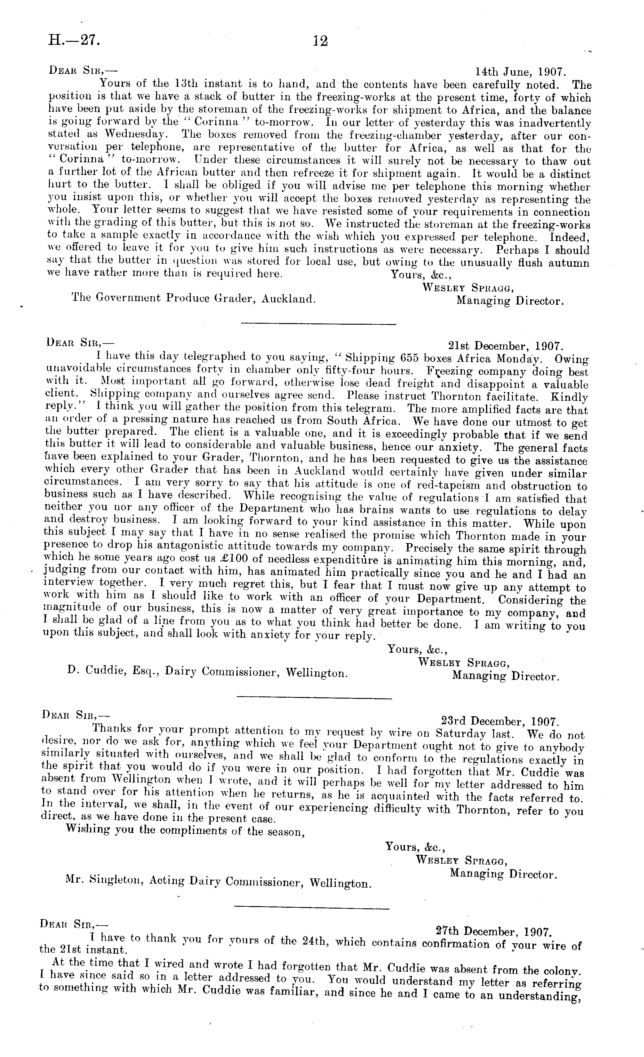 Dear Sir,— 14th June, 1907. Yours of the 13th instant is to hand, and the contents have been carefully noted. The position is that we have a stack of butter in the freezing-works at the present time, forty of which have been put aside by the storeman of the freezing-works for shipment to Africa, and the balance is going forward by the " Corinna " to-morrow. In our letter of yesterday this was inadvertently stated as Wednesday. The bo.xes removed from the freezing-chamber yesterday, after our conversation per telephone, are representative of the butter for Africa, as well as that for the "Corinna" to-morrow. Under these circumstances it will surely not be necessary to thaw out a further lot of the African butter raid then refreeze it for shipment again. It would be a distinct hurt to the butter. 1 shall be obliged if you will advise me per telephone this morning whether you insist upon this, or whether you will accept the boxes removed yesterday as representing the whole. Your letter seems to suggest that we have resisted some of your requirements in connection with the grading of this butter, but this is not so. We instructed the storeman at the freezing-works to take a sample exactly in accordance with the wish which you expressed per telephone. Indeed, we offered to leave it for you to give him such instructions as were necessary. Perhaps I should say that the butter in question was stored for local use, but owing to the unusually flush autumn we have rather more than is required here. Yours, &c, Wesley Spragg, The Government Produce Grader, Auckland. Managing Director.