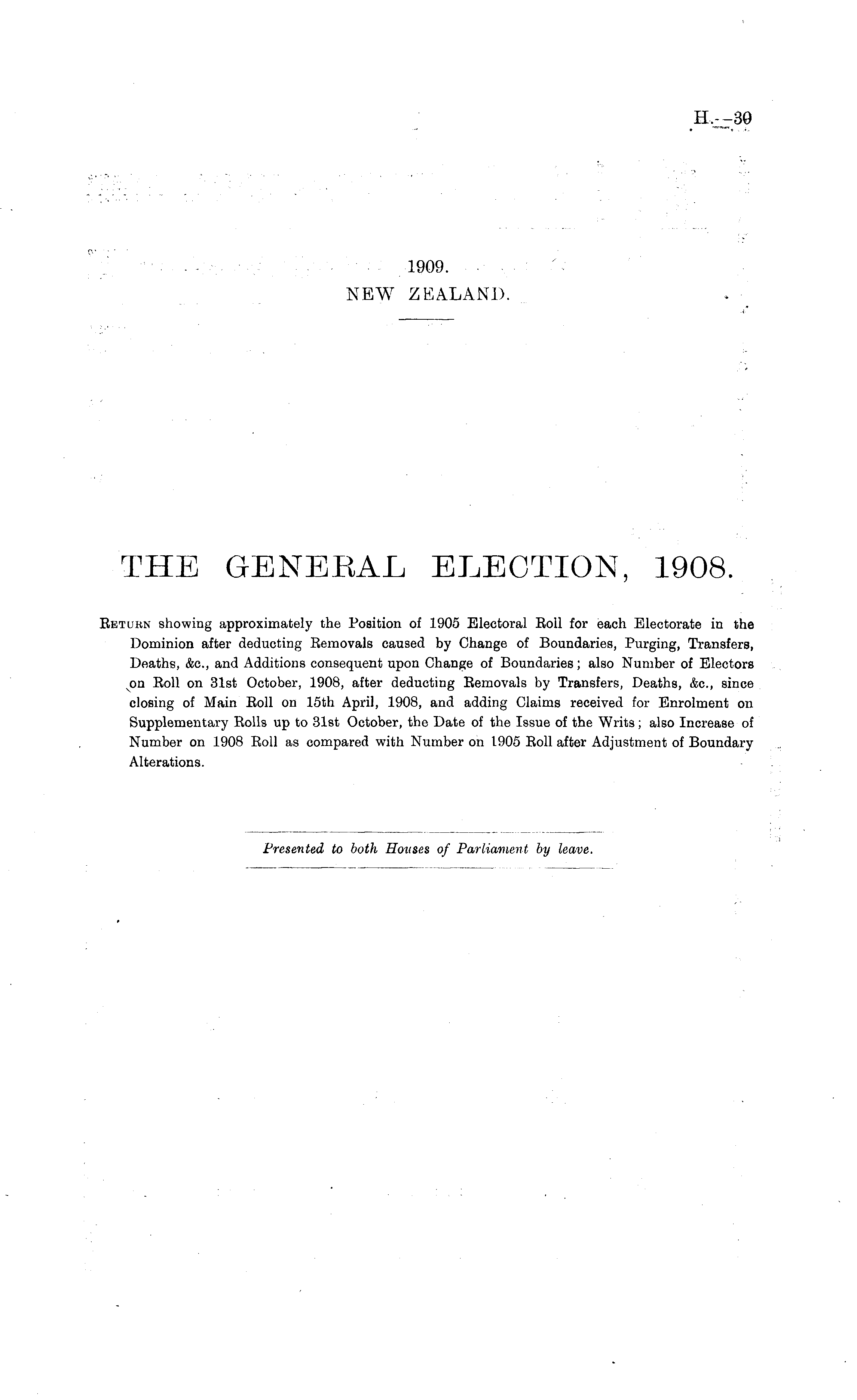 Return showing approximately the Position of 1905 Electoral Roll for each Electorate in the Dominion after deducting Removals caused by Change of Boundaries, Purging, Transfers, Deaths, &c, and Additions consequent upon Change of Boundaries; also Number of Electors on Roll on 31st October, 1908, after deducting Removals by Transfers, Deaths, &c, since closing of Main Roll on 15th April, 1908, and adding Claims received for Enrolment on Supplementary Rolls up to 31st October, the Date of the Issue of the Writs; also Increase of Number on 1908 Roll as compared with Number on 1905 Roll after Adjustment of Boundary Alterations.