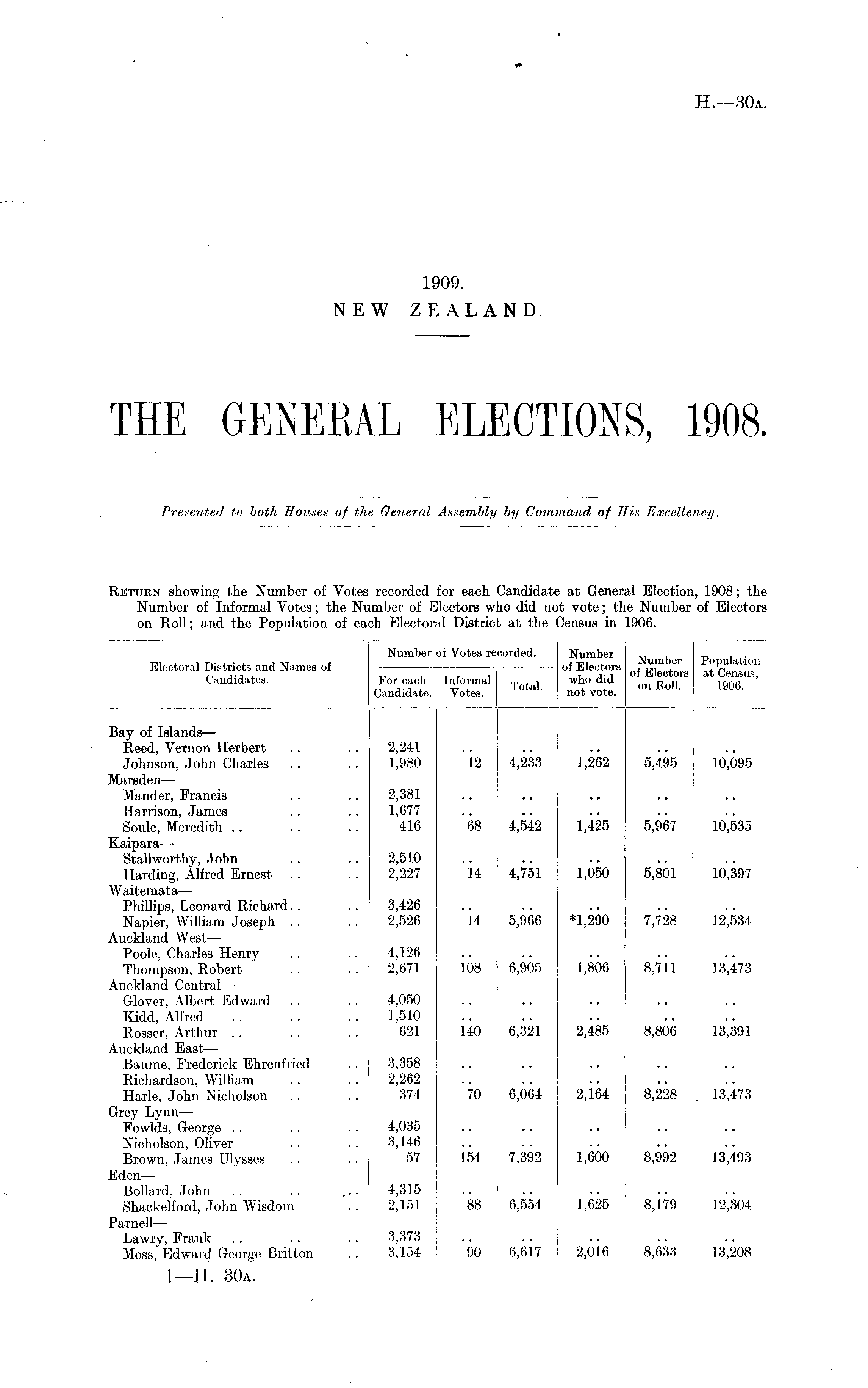 Return showing the Number of Votes recorded for each Candidate at General Election, 1908; the Number of Informal Votes; the Number of Electors who did not vote; the Number of Electors on Roll; and the Population of each Electoral District at the Census in 1906.