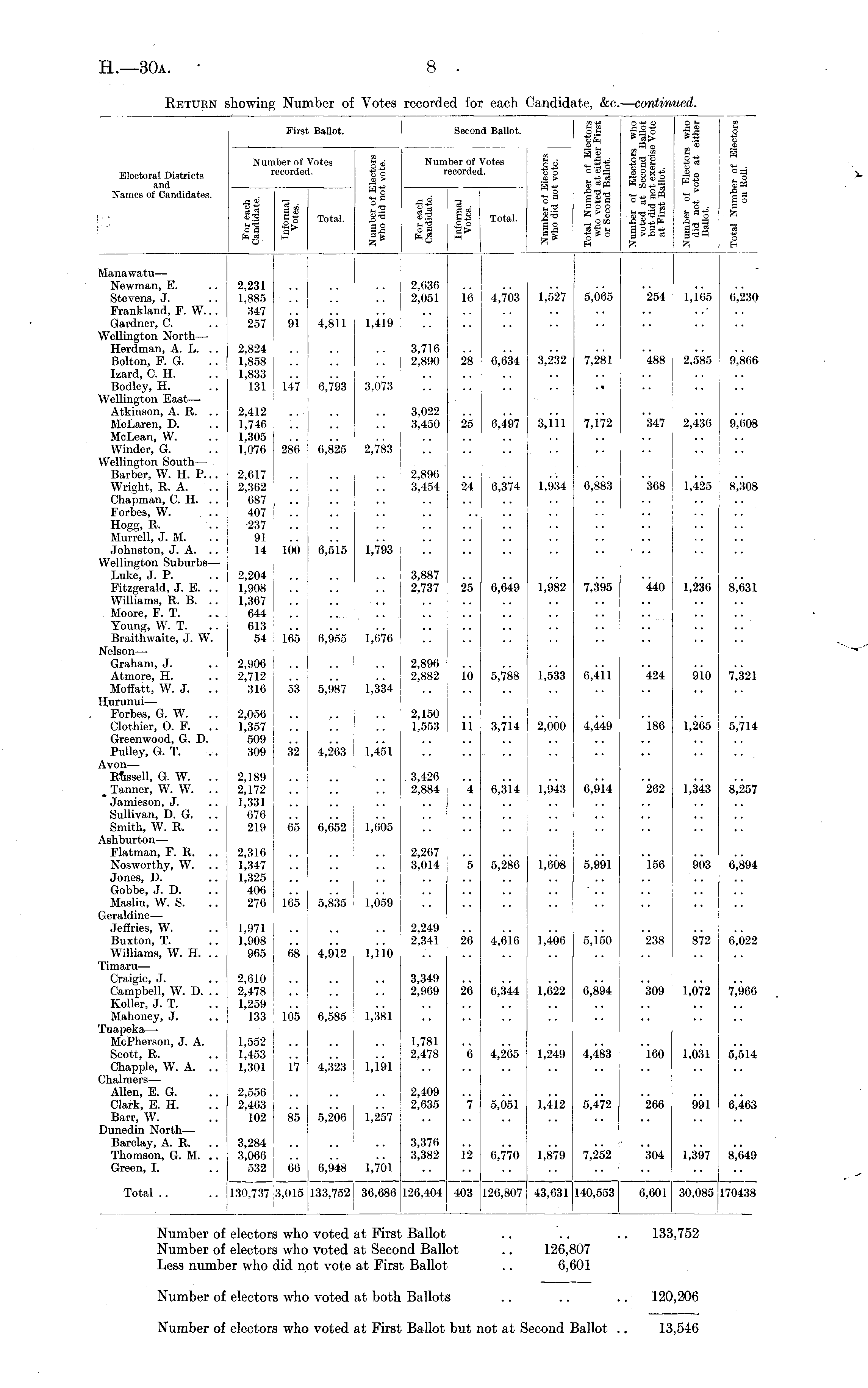 Electoral Districts and Names of Candidates. \m iber of ■ecordei Firsl Ballot. O O n Numi rt Second Ballot. of Votes icorded. I! Ji H E| oil gtsg 5 p o S "* CD ill Q P £ o 3 j= J ■ " it w o ** '* ill £ o 1 I" fi ft, I II Total. ll Ii § £ Total. 1 o H Manawatu— Newman, E. Stevens, J. Frankland, F. W... Gardner, C. Wellington North — Herdman, A. L. Bolton, F. G. Izard, C. H. Bodley, H. Wellington East—■ Atkinson, A. R. McLaren, D. McLean, W. Winder, G. Wellington South— Barber, W. H. P... Wright, R. A. Chapman, C. H. Forbes, W. Hogg, R. Murrell, J. M. Johnston, J. A. Wellington Suburbs— Luke, J. P. Fitzgerald, J. E. Williams, R. B. Moore, F. T. Young, W. T. Braithwaite, J. W. Nelson— Graham, J. Atmore, H. Moffatt, W. J. .. Hurunui — Forbes, G. W. Clothier, 0. F. Greenwood, G. D. Pulley, G. T. :\von— Rtssell, G. W. .. . Tanner, W. W. Jamieson, J. Sullivan, D. G. Smith, W. R. i\shburton— Flatman, F. R. Nosworthy, W. Jones, D. Gobbe, J. D. Maalin, W. S. GJeraldine— Jeffries, W. Buxton, T. Williams, W. H. 2,231 1,885 347 257 2,824 1,858 1,833 131 2,412 1,746 1,305 1,076 2,617 2,362 687 407 237 91 14 2,204 1,908 1,367 644 613 54 ! 91 147 286 100 4,811 6,793 6,825 6,515 1,419 3,073 2,783 1,793 2,636 2,051 3,716 2,890 3,022 3,450 2,896 3,454 3,887 2,737 Iβ 28 25 24 25 4,703 6,634 6,497 6,374 6,649 1,934 1,982 1,527 3,232 3,111 5,065 7,281 , 4 7J72 6,883 7,395 254 488 .347 '368 440 U65 2,585 2,436 1,425 1,236 6,230 9,866 9,608 8,308 8,631 165 6,955 1,676 2,906 2,712 316 2,896 2,882 io 5,788 1,533 6,411 424 910 7,321 53 5,987 1,334 2,056 1,357 509 309 2,150 1,553 ii 3,7i4 2,000 4,449 186 1,265 5,714 32 4,263 1,451 2,189 2,172 1,331 676 219 I 3,426 2,884 4 6,314 1,943 6,914 262 1,343 8,257 65 6,652 1,605 2,316 1,347 1,325 406 276 2,267 3,014 5 5,286 1,608 5,991 156 903 6,894 165 5,835 1,059 1,971 1,908 965 2,249 2,341 26 4,616 1,406 5,150 238 872 6,022 68 4,9i2 1,110 rimaru— Craigie, J. Campbell, W. D. .. Koller, J. T. Mahoney, J. fuapeka— McPherson, J. A. Scott, R. Chappie, W. A. .. Chalmers— Allen, E. G. Clark, E. H. Barr, W. Dunedin North— Barclay, A. R. Thomson, G. M. Green, I. 2,610 2,478 1,259 133 1,552 1,453 1,301 105 17 6,585 4,323 1,381 l.iei 3,349 2,969 1,781 2,478 26 6 6,344 4,265 1,022 1,249 6,894 4,483 309 160 1,072 1,031 7,966 5,514 2,556 2,463 I 102 2,409 2,635 7 5,051 i,4is 5,472 266 991 6,463 85 5,206 1,257 3,284 3,066 532 3,376 3,382 12 6,770 1,879 7,252 304 1,397 8,649 66 6,948 1,701 Total 130,737 ; 43,631 140,553 3,015 133,752 36,686 126,404 403 126,807 6,60i 30,085 170438