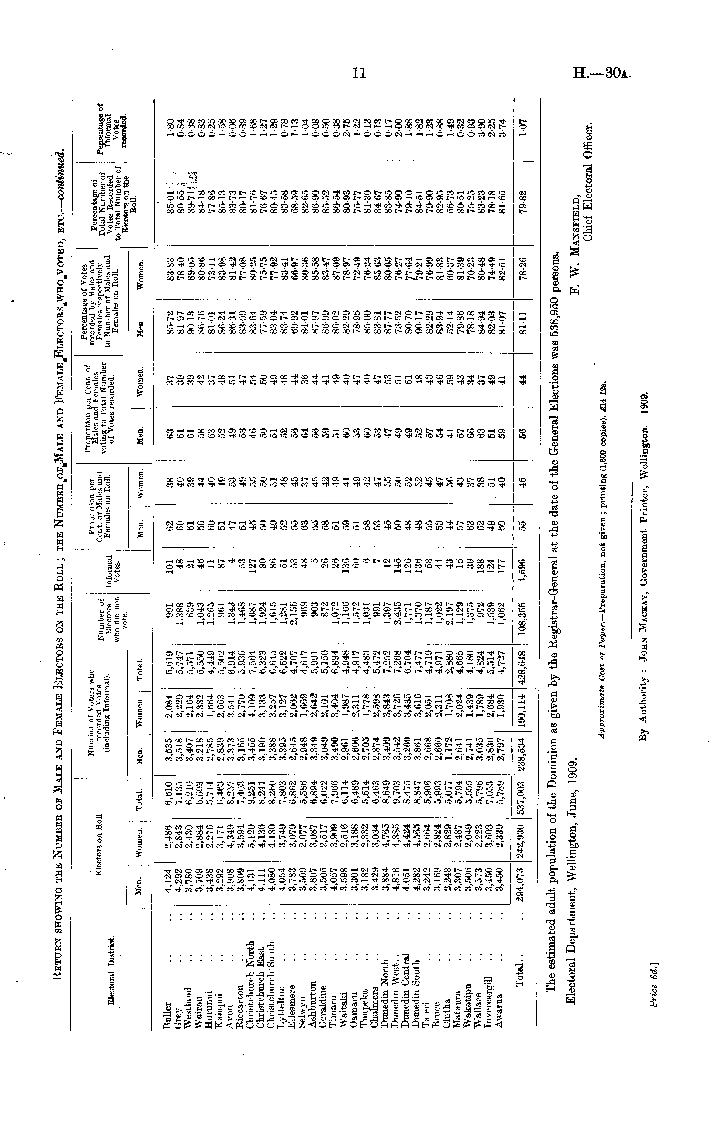 The estimated adult population of the Dominion as given by the Registrar-General at the date of the General Elections was 538,950 persons. Electoral Department, Wellington, June, 1909. F. \V. Mansfield, Chief Electoral Officer. Approximate Cost of Paper.— Preparation, not given ; printing (1,600 copies), £14 12s.