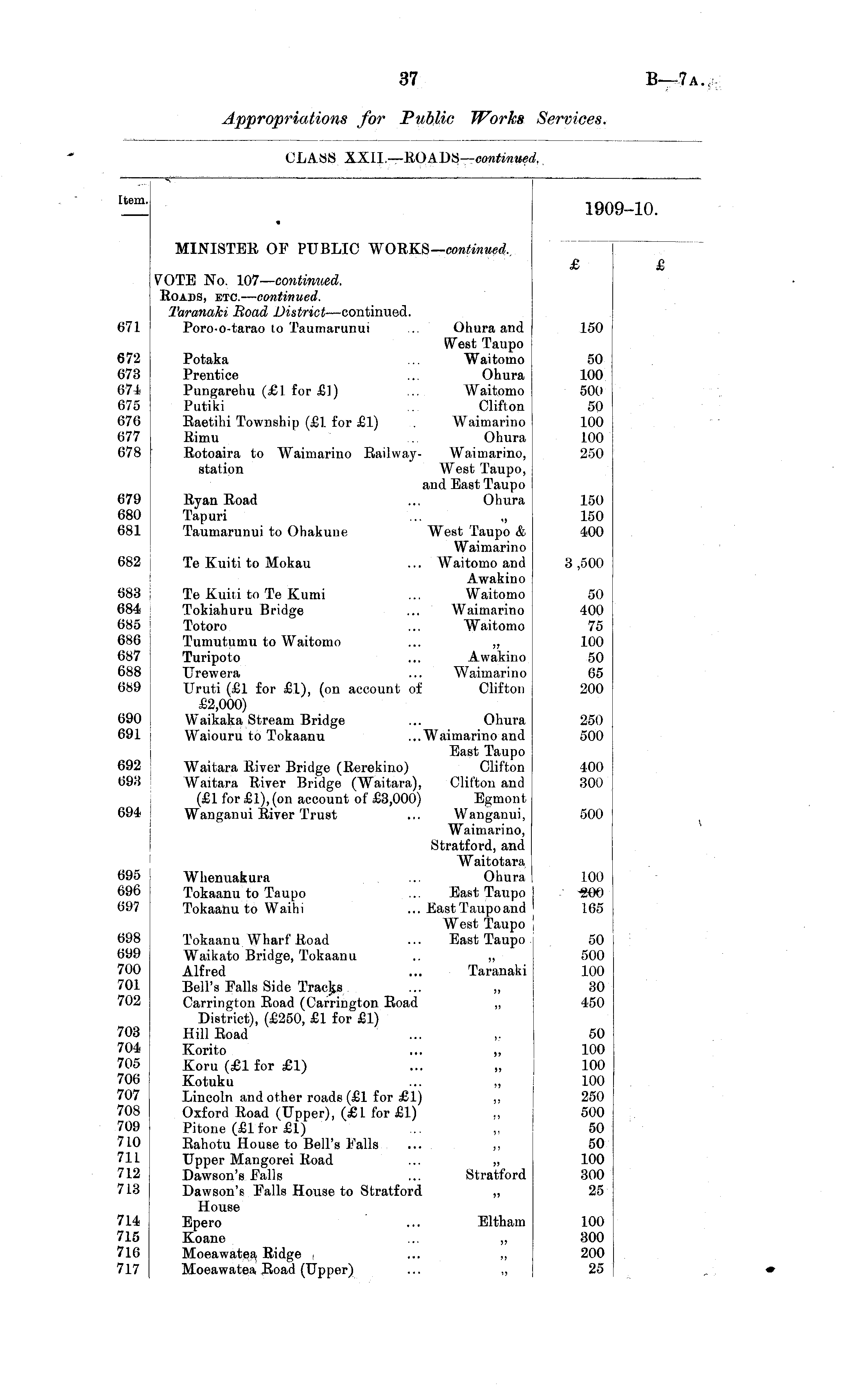 Item. 1909-10. • MINISTER OF PUBLIC WORKS— continued. VOTE No. 107— continued. Roads, etc. — continued. Taranaki Road District —continued. Poro-o-tarao to Taumarunui ... Ohura and West Taupo Potaka ... Waitomo Prentice ... Ohura Pungarehu (£1 for £1) ... Waitomo Putiki ... Clifton Raetihi Township (£1 for £1) . Waimarino Rimu .. Ohura Rotoaira to Waimarino Railway- Waimarino, station West Taupo, and East Taupo Ryan Road ... Ohura Tap uri ... „ Taumarunui to Ohakune West Taupo A Waimarino Te Kuiti to Mokau ... Waitomo and Awakino Te Kuiti to Te Kumi ... Waitomo Tokiahuru Bridge ... Waimarino Totoro ... Waitomo Tumutumu to Waitomo ... „ Turipoto ... Awakino Urewera ... Waimarino Uruti (£1 for £1), (on account of Clifton £2,000) Waikaka Stream Bridge ... Ohura Waiouru to Tokaanu ...Waimarino and East Taupo Waitara River Bridge (Rerekino) Clifton Waitara River Bridge (Waitara), Clifton and (£1 for £1), (on account of £3,000) Egmont Wanganui River Trust ... Wanganui, Waimarino, Stratford, and Waitotara Whenuakura Ohura Tokaanu to Taupo ... East Taupo Tokaanu to Wai hi ... East Taupo and West Taupo Tokaanu Wharf Road ... East Taupo Waikato Bridge, Tokaanu .. ,, Alfred ... Taranaki Bell's Falls Side Tracks Carrington Road (Carrington Road „ District), (£250, £1 for £1) Hill Road ... ,, Korito ... ,, Koru (£1 for £1) Kotuku ... ,, Lincoln and other roads (£1 for £1) ,, Oxford Road (Upper), (£1 for £1) Pitone (£lfor £1) Rahotu House to Bell's Falls ... ,, Upper Mangorei Road ... „ Dawson's Falls ... Stratford Dawson's Falls House to Stratford „ House £ £ 150 671 672 673 674 675 676 677 678 50 100 500 50 100 100 250 679 680 681 150 150 400 682 3,500 683 684 685 686 687 688 689 50 400 75 100 50 65 200 \ 690 691 250 500 692 693 400 300 694 500 \ 695 696 697 100 200 165 698 699 700 701 702 50 500 100 30 450 703 704 705 706 707 708 709 710 711 712 713 50 100 100 100 250 500 50 50 100 300 25 714 715 716 717 Epero ... Eltham Koane ... ,, Moeawatea Ridge ... ,, Moeawatea Road (Upper) ... ,, 100 300 200 25 •