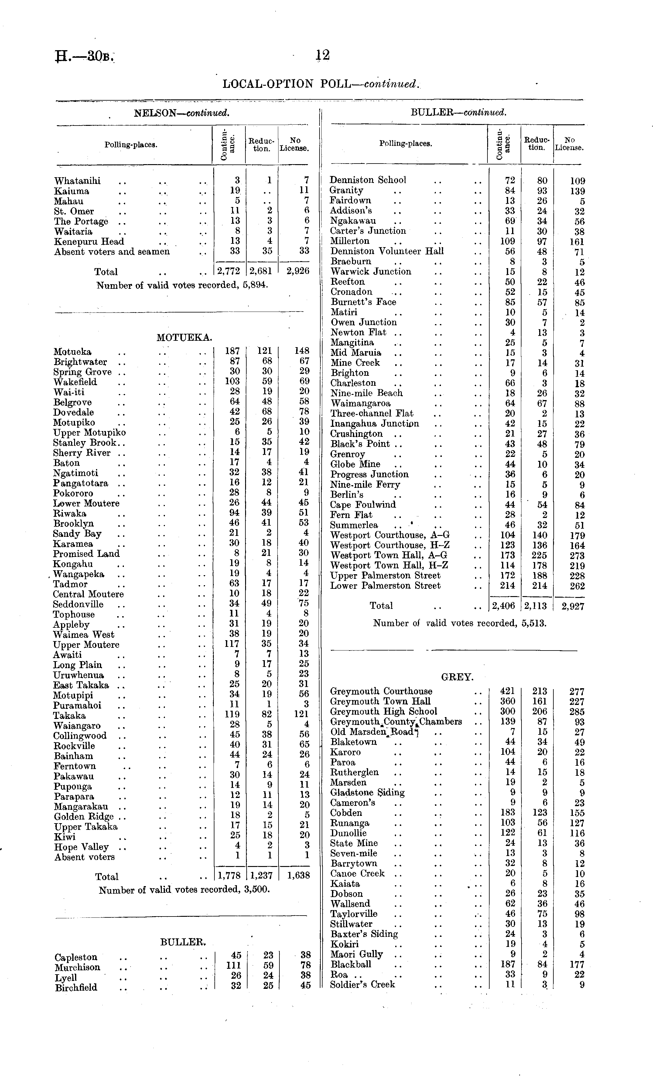 Polling-places. Is Reduction. No License. Denniston School Granity Fairdown Addison's Ngakawau Carter's Junction Millerton Donniston Volunteer Hall Braeburn Warwick Junction Reef ton Cronadon Burnett's Face Matiri Owen Junction Newton Flat .. Mangitina Mid Maruia Mine Creek Brighton Charleston Nine-mile Beach Waimangaroa Three-channel Flat Inangahua Junction Crushington Black's Point Grenroy Globe Mine Progress Junction Nine-mile Ferry Berlin's Cape Foulwind Fern Flat Summerlea .. * Westport Courthouse, A-G Westport Courthouse, H-Z Westport Town Hall, A-G Westport Town Hall, H-Z Upper Palmerston Street Lower Palmerston Street 72 84 13 33 Bβ 11 109 56 8 15 50 52 85 10 30 4 25 15 17 9 60 18 64 20 42 21 43 22 44 36 15 16 44 28 46 104 123 173 114 172 214 80 93 26 24 34 30 97 48 3 8 22 15 57 5 7 13 5 3 14 6 3 26 67 2 15 27 48 5 10 6 5 9 54 2 32 140 136 225 178 188 214 109 139 5 32 56 38 161 71 5 12 46 45 85 14 2 3 7 4 31 14 18 32 88 13 22 36 79 20 34 20 9 r> 84 12 51 179 164 273 219 228 262 Total 2,406 2,113 2,927 Number of valid votes re> lorded, 5,513. GREY. Greymouth Courthouse Greymouth Town Hall Greymouth High School Greymouth.County^Chambers Old Marsden_Road"] Blaketown Karoro Paroa Rutherglen Marsden Gladstone Siding Cameron's Cobden Runanga Dunollie State Mine Seven-mile Barrytown Canoe Creek .. Kaiata .. .. ... Dobson Wallsend Taylorville Stillwater Baxter's Siding Kokiri Maori Gully .. .: Blackball Roa Soldier's Creek 421 300 300 139 7 44 104 44 14 19 9 9 183 103 122 24 13 32 20 6 26 62 46 30 24 19 9 187 33 11 213 161 206 87 15 34 20 6 15 2 9 6 123 56 61 13 3 8 5 8 23 36 75 13 3 4 2 84 9 3 277 227 285 93 27 49 22 16 18 5 9 23 155 127 116 36 8 12 10 16 35 46 98 19 f> 5 4 177 22 9