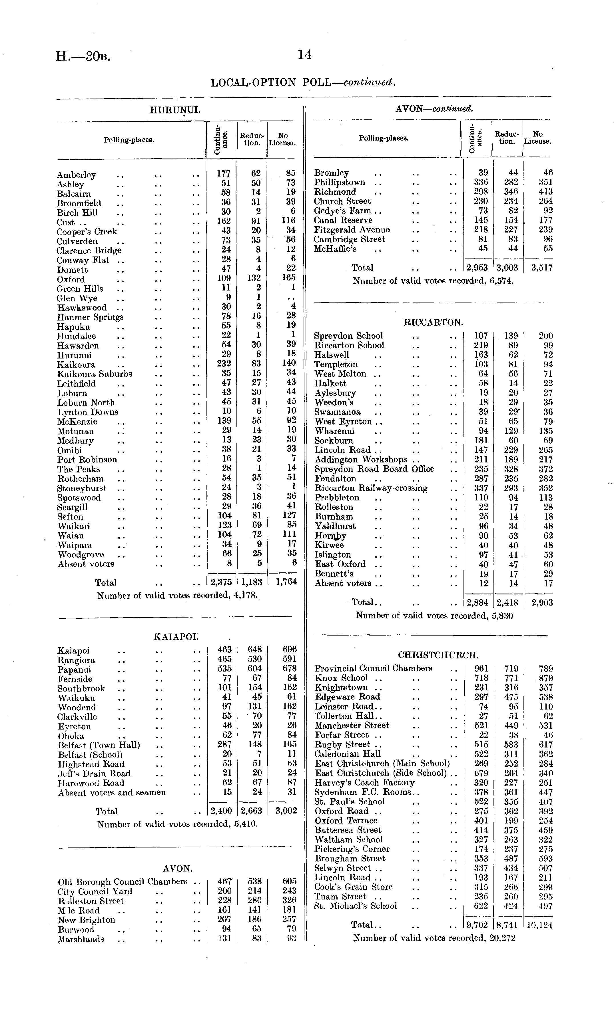 Polling-placee. S g Reduc- No tioQ. License. Bromley Phillipatown Richmond Church Street Gedye's Farm Canal Reserve Fitzgerald Avenue Cambridge Street McHaffie's 39 336 298 230 73 145 218 81 45 44 282 346 I 234 82 154 227 83 44 44 46 282 351 346 I 413 234 ! 264 82 J 92 154 i 177 227 ! 239 83 ! 96 44 55 Total 2,953 3,003 3,517 3,003 Number of valid votes reci )rded, (i !,574. RICCARTON. Spreydon School Riccarton School Halswell Templeton West Melton Halkett Aylesbury Weedon's Swannanoa .. West Eyreton Wharenui Sockburn Lincoln Road .. .. Addington Workshops Spreydon Road Board Office Fendalton Riccarton Railway-crossing Prebbleton Rolleston Burnham Yaldhurst Hornby Kirwee Islington East Oxford Bennett's Absent voters 107 219 163 103 64 58 19 18 39 51 94 181 147 211 235 287 337 110 22 25 96 90 40 97 40 19 12 139 89 62 81 , 56 14 20 29 29' 65 129 60 229 189 328 235 293 94 17 14 34 53 40 41 47 17 14 200 99 72 s 22 27 35 36 79 135 69 265 217 372 282 352 113 28 18 48 62 48 53 60 29 17 Total 2,884 2,418 5,830 2,903 Number of valid votes rec ordod,I CHRISTCHUR CH. Provincial Council Chambers Knox School Knightstown Edgeware Road Leinster Road Tollerton Hall Manchester Street Forfar Street Rugby Street Caledonian Hall East Christchurch (Main School) East Christchurch (Side School) .. Harvey's Coach Factory Sydenham F.C. Rooms.. St. Paul's School Oxford Road Oxford Terrace Battersea Street Waltham School Pickering's Corner Brougham Street .. Selwyn Street Lincoln Road Cook's Grain Store Tuam Street St. Michael's School 961 718 231 297 74 27 521 22 515 522 269 679 320 378 522 275 401 414 327 174 353 337 193 315 235 622 719 771 316 475 95 51 449 38 583 311 252 264 227 361 355 362 199 375 263 237 487 434 1(17 266 260 424 789 879 357 538 110 62 531 46 617 362 284 340 251 447 407 392 254 459 322 275 593 507 211 299 295 497 Total 9,702 8,741 !0,272 10,124 Number of valid votes reci >rded, 2