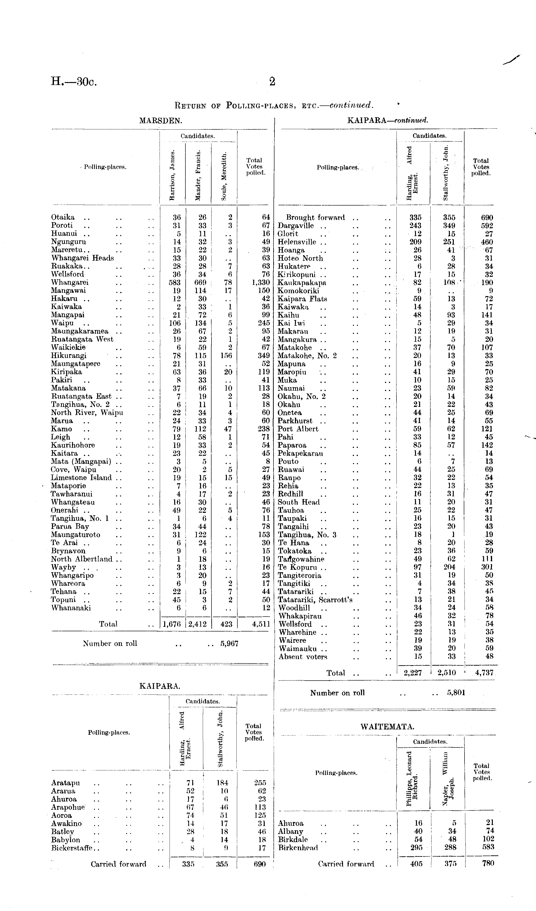 ,SDEN. . — continue! Polling-places. 1 « !-» fl" O Ja D H Candidate: fl so ■ c u « a I ■>. 3 o ©" a o so 'Total N'otes polled. Polling-places. Candidates. ■§ d 1 o fl o 3S I X 0Q Total Votes polled. Otaika Poroti Huanui Ngunguru Mareretu.. Whangarei Heads Ruakaka Wellsford Whangarei Manga wai Hakaru Kaiwaka Mangapai Waipu Maungakaramea .. Ruatangata West Waikiekie Hikurangi Maungatapere Kiripaka Pakiri Matakana Ruatangata East .. Tangihua, No. 2 .. North River, Waipu 36 31 5 14 15 33 28 36 583 19 12 2 21 106 26 19 6 78 21. 63 8 37 7 6 22 24 79 12 19 23 3 20 19 7 4 16 49 1 34 31 : i ! 3 3 ! 6 22 45 6 26 33 ! 11 32 22 30 28 34 669 114 30 33 72 134 67 22 59 115 31 36 33 66 19 11 34 33 112 58 33 22 5 2 15 16 17 30 22 6 44 122 24 6 18 13 20 9 15 3 6 2 3 3 2 7 6 78 17 1 6 5 2 1 2 156 20 io 2 1 4 3 47 1 2 5 15 2 5 4 2 7 2 64 67 16 49 39 63 63 76 1,330 150 42 36 99 245 95 42 67 349 52 119 41 113 28 18 60 60 238 71 54 45 8 27 49 23 23 46 76 11 78 153 30 15 19 16 23 17 44 50 12 Brought forward .. Dargaville Glorit Helensville Hoanga Hoteo North Hukatere Kirikopuni Kankapakapa Komokoriki Kaipara Flats Kaiwaka Kaihu Kai Iwi Makarau Mangakura Matakohe Matakohe, No. 2 Mapuna Maropiu Muka Naumai Okahu, No. 2 Okahu Onetea Parkhurst Port Albert Pahi Paparoa Pekapekarau Pouto Ruawai Raupo Rehia Redhill South Head Tauhoa Taupaki Tangaihi Tangihua, No. 3 Te Hana Tokatoka Tartgowahine Te Kopuru Tangiteroria Tangitiki Tatarariki Tatarariki, Scarrott's Woodhill Whakapirau Wellsford Wharehine Wairere Waimauku Absent voters 335 243 12 209 26 28 6 17 82 9 59 14 48 5 12 15 37 20 16 41 10 23 20 21 44 41 59 33 85 14 6 44 32 22 16 11 25 16 23 S 23 49 97 31 4 i 7 13 34 46 23 22 19 39 15 355 349 15 251 41 3 28 15 108 ' 13 3 93 29 19 5 70 13 9 29 15 59 14 22 25 14 62 12 57 690 592 27 460 67 31 34 32 190 9 72 17 141 34 31 20 107 33 25 70 25 82 34 43 69 55 121 45 142 14 13 69 54 35 47 31 47 31 43 19 28 59 111 301 50 38 45 34 58 78 54 35 38 59 48 Marua Kamo Leigh Kaurihohore Kaitara Mata (Mangapai) .. Cove, Waipu Limestone Island .. Mataporie Tawharanui Whangateau Onerahi Tangihua, No. 1 .. Parua Bay Maungaturoto Te Arai Brynavon North Albertland .. Wayby ... Whangaripo Whareora Tehana Topuni .. Whananaki 7 25 22 13 31 20 22 15 20 20 36 62 204 19 34 38 21 24 32 31 13 19 20 33 Total 1,676 2,412 423 4,511 Number on roll 5,96' Total .. 2,227 I I 2,510 ' 4,737 KAIPA] EtA. Candidates. £ a 5 i? Total Votes a' polled. b> fc fa fl © o 3S I fa[£i a k5 S Number on roll 5,801 Polling-places. WAITEM. ATA. Candidates. Aratapu Araroa Ahuroa Arapohue Aoroa .. ... Awakino Batley Babylon Bickerstaffe 71 184 255 52 10 02 17 ' 6 23 67 46 113 74 51 125 14 17 31 28 18 46 4 14 18 8 9 j 17 Polling-places. V re fl o a . .,-a of fa aS .fa*© as a m a I I fa-f I Total N'otes polled. Ahuroa Albany Birkdale Birkenhead Carried forward 16 5 40 34 54 48 295 ; 288 .. I 405 | 375 21 74 102 583 Carried forward 335 355 : 690 780