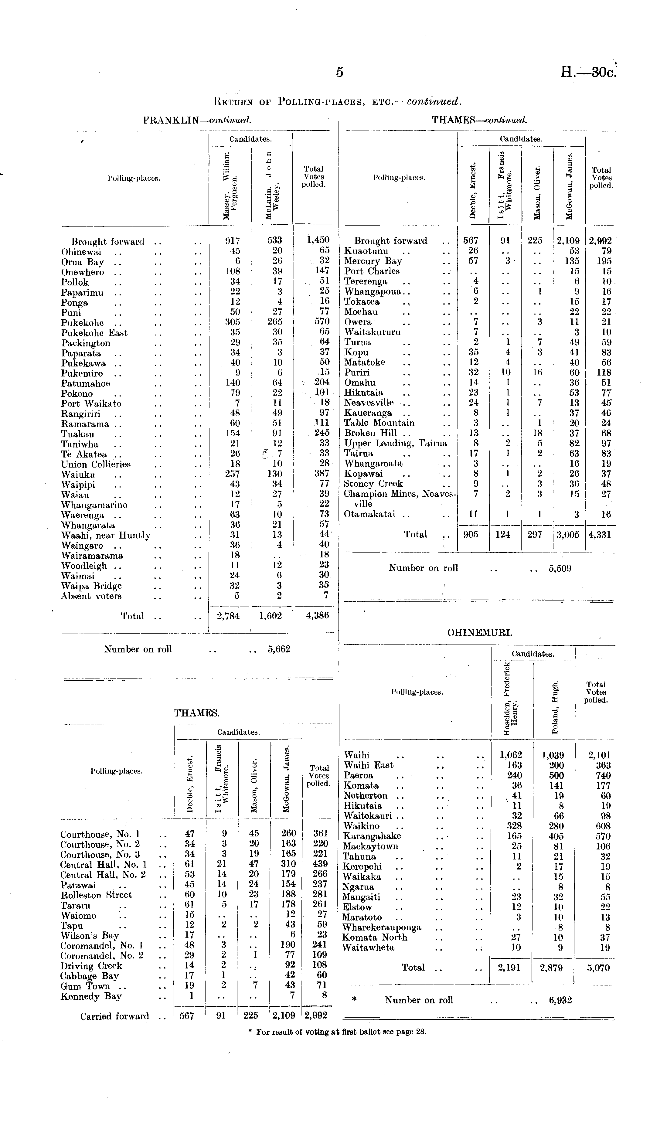 FRANK LINcontinued. mtinui t Candii Lates. Oandi' lates. .5 fl p .. fl >. Bt CD ~ Hi O) I* Total Votes polled. Polliug-pjaccs. 3 W af 3 e o I u ■ o J if J3 fa O fl i u B 3 | o Total Votes polled. Polliug-placea. fl Ci* Brought forward .. Ohinewai Orua Bay Onewhero Pollok Paparimu Ponga Puni Pukekohe Pukekohe East Packington Paparata Pukekawa Pukemiro Patumalioe Pokeno Port Waikato Rangiriri Ramarama Tuakau Taniwha Te Akalea Union Collieries Waiuku Waipipi Waiau Whangamarino Waerenga Whangarata Waahi, near Huntly Waingaro Wairamarama Woodleigh Waimai Waipa Bridge Absent voters 017 533 45 20 6 26 108 39 34 17 22 3 12 4 50 27 305 265 35 30 29 35 34 3 40 10 9 0 140 64 79 22 7 11 48 49 60 51 154 91 21 12 26 j 7 18 10 257 130 43 34 12 27 17 5 63 10 | 36 21 31 13 36 4 18 11 12 24 6 32 3 5 2 1,450 65 32 147 . 51 25 16 77 570 65 64 37 50 15 204 101 18 97 111 , 245 33 33 28 387 77 39 22 73 57 44 40 18 23 30 35 7 Brought forward Kuaotunu Mercury Bay Port Charles Tererenga Whangapoua Tokatea ., Moehau Owera Waitakururu Turua Kopu Matatoke Puriri Omahu Hikutaia Neavesville Kaueranga Table Mountain Broken Hill Upper Landing, Tairua Tairua Whangamata Kopawai Stoney Creek Champion Mines, Neavesville Otamakatai 567 26 57 4 6 2 7 7 2 35 12 32 14 23 24 8 3 13 8 17 3 8 9 7 91 4 4 10 225 2.109 53 135 15 6 1 9 15 22 3 11 3 7 49 3 41 40 16 60 [ 36 53 7 13 37 1 20 18 37 5 82 2 63 16 2 26 3 36 3 15 2,992 79 195 15 10. 16 17 22 21 10 59 83 56 118 51 77 45 46 24 68 97 83 19 37 48 27 ' 2 11 1 1 3 16 Total 905 124 297 13,005 4,331 Number on roll 5,509 Total .. .. 2,784 1,602 4,386 OH1NEMURI. Number on roll .. 5,662 Candii "' x © £ a a >, —i rrj %x X i tea. Polling-places. a a X | re © a Total Votes polled. L'HAM !S. Candidates. Polling-places. W CD a 1 O fa O fl' c re m © fa* a re o O u i Total Votes polled. Waihi Waihi East Paeroa Komata Netherton Hikutaia .. Waitekauri Waikino Karangahake Mackaytown Tahuna Kerepehi Waikaka Ngarua Mangaiti Elstow Maratoto Wharekerau ponga Komata North Waitawheta 1,062 163 240 36 41 11 32 328 165 25 11 2 1,039 200 500 141 19 8 66 280 405 81 21 17 15 8 32 10 10 8 10 9 2,101 363 740 177 60 19 98 608 570 106 32 19 15 8 55 22 13 8 37 19 Courthouse, No. 1 Courthouse, No. 2 Courthouse, No. 3 Central Hall, No. 1 .. Central Hall, No. 2 .. Parawai Rolleston Street Tararu Waiomo 47 34 34 61 53 45 60 61 15 12 17 48 29 14 17 19 1 9 3 3 21 14 14 10 5 2 45 20 19 47 20 24 23 17 2 260 163 165 310 179 154 188 178 12 43 6 190 77 92 42 43 7 361 220 221 j 439 266 237 281 261 27 59 23 241 109 108 60 71 8 23 12 3 Tapu Wilson's Bay Coromandel, No. 1 Coromandel, No. 2 Driving Creek Cabbage Bay Gum Town Kennedy Bay 3 2 2 1 2 1 Total .. 27 10 2,191 2,879 5,070 h Number on roll ,. 6,932 Carried forward . . 567 91 ! 1 225 2,109 2,992 * For • result ol f voting ai first ballot see page 28.