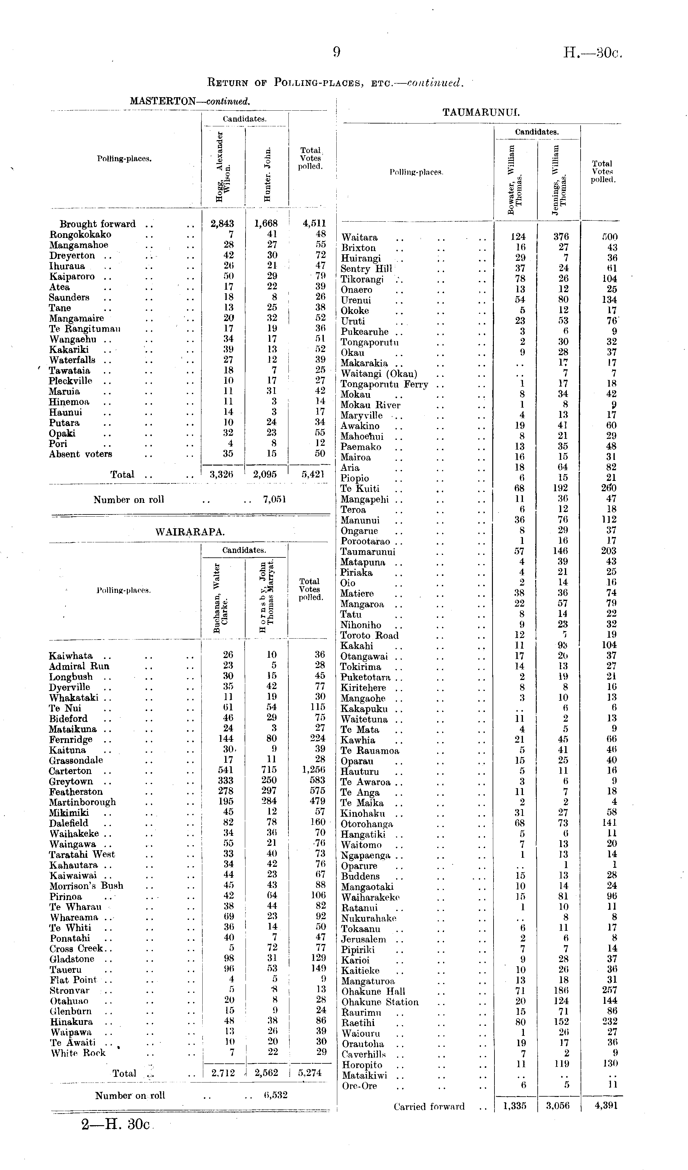 f — continued. Candh fa ■a re Polling-places. < a i t£.a o"^ X TAUMARUNUI. dates. Candh lates. a Total -g Votes i-s polled. fa © s fl B Polling-places. a .re fa-a a a re il a a ,S © aa an © Total N'otes polled. Brought forward .. .. 2,843 Rongokokako .. .. 7 Mangamahoo .. .. 28 Dreyerton .. .. .. 42 Ihuraua .. .. .. 26 Kaiparoro .. . . .. 50 Atea .. .. ' .. 17 Saunders .. .. .. 18 Tane .. .. .. 13 Mangamaire .. .. 20 Te Rangitumau .. .. 17 Wangaehu .. .. .. 34 Kakariki .. .. 39 Waterfalls .. .. .. 27 Tawataia .. .. .. 18 Pleckville .. .. 10 Maruia .. .. .. II Hinemoa .. .. .. II Haunui .. .. .. 14 Putara .. .. .. 10 Opaki .. .. 32 Pori .. .. .. 4 A bsent voters .. .. 35 1,668 4,511 41 48 27 55 30 72 21 47 29 79 22 39 8 26 25 38 32 j 52 19 36 17 51 13 52 12 39 7 25 17 27 31 42 3 14 3 17 24 34 23 55 8 12 15 50 Waitara Brixton Huirangi .. ;. Sentry Hill Tikorangi Onaero Urenui Okoke Uruti Pukearuhe Tongaporutu Okau Makarakia Waitangi (Okau) Tongaporutu Ferry .. Mokau Mokau River Maryville Awakino Mahoehui Paemako Mairoa Aria Piopio Te Kuiti Mangapehi Teroa Manunui Ongarue Porootarao .. ,. Taumarunui Matapuna Piriaka Oio Matiere Mangaroa Tatu Nihoniho Toroto Road Kakahi Otangawai Tokirima Puketotara Kiritehere Mangaohe Kakapuku Waitetuna Te Mata Kawhia Te Rauamoa Oparau Hauturu Te Awaroa Te Anga Te Maika Kinohaku Otorohanga. Hangatiki Waitomo Ngapaenga Oparure .. Buddens Mangaotaki Waiharakeke Ratanui Nukurahake Tokaanu Jerusalem Pipiriki Karioi Kaitieke Mangatu roa Ohakune Hall Ohakune Station Raurimu Raetihi Waiouru Orautoha Caverhills Horopito Mataikiwi Ore-Ore 124 I 16 29 37 78 13 54 5 23 3 2 9 376 27 7 24 26 12 80 12 53 6 30 28 17 7 17 34 8 13 41 21 35 15 64 15 192 36 12 76 29 16 146 39 21 14 36 57 14 23 7 93 20 13 19 8 10 6 2 5 45 41 25 11 6 7 2 27 73 6 13 13 1 13 14 81 10 8 11 6 7 28 26 18 ISti 124 71 152 26 17 2 119 500 43 36 61 104 25 134 17 70 9 32 37 17 7 18 42 B 17 60 29 48 31 82 21 26*0 47 18 112 37 17 203 43 25 16 74 79 22 32 19 104 37 27 21 16 13 6 13 9 66 46 40 16 9 18 4 58 141 11 20 14 1 28 24 96 II 8 17 8 14 37 36 31 257 144 86 232 27 30 9 130 Total .. .. 3,326 Number on roll WAIRAR PA. 2,095 ' 5.421 .. 7,051 1 8 1 4 19 8 13 16 18 6 68 11 6 36 8 1 57 4 4 2 38 22 8 9 12 II 17 14 2 8 3 Candidates. Polling-places. © all S ©fare fas fa L- re ? >>. fl" . a © a© ,« 2 -* a S fe a a.5 fa j3 So oh X B Total Votes polled. Kaiwhata Admiral Run Longbush Dyerville Whakataki Te Nui Bideford Mataikuna Fernridge Kaituna Grassondale Carterton Greytown .. .. Featherston Martinborough Mikimiki Dalefield Waihakeke Waingawa Taratahi West Kahautara Kaiwaiwai .. Morrison's Bush Pirinoa Te Wharau VV'hareama Te Whiti Ponatahi Cross Creek Gladstone Taueru Flat Point Stronvar Otahuao (Uenburn Hinakura .. Waipawa Te Awaiti .. White Rock 20 10 23 5 30 15 35 42 11 19 61 54 46 29 24 3 144 80 30, 9 17 II 541 715 333 250 278 297 195 284 45 12 82 78 34 36 55 21 33 40 34 42 44 23 45 43 42 64 38 44 69 23 36 14 40 7 5 72 08 31 96 53 4 5 5 -8 20 8 15 9 48 38 13 26 10 20 7 22 : 1 2,712 2,562 36 28 45 77 30 115 75 27 224 39 28 1,256 583 575 479 57 160 70 ■76 73 76 67 88 100 82 02 50 47 77 120 140 9 13 28 24 86 30 30 29 11 4 21 5 15 j 5 I 3 11 2 31 68 5 7 1 15 10 15 1 6 2 7 9 10 13 71 20 15 80 1 19 7 11 Total ... i 5,274 6 5 11 Number on roll 6,532 1,335 4,391 (larried forward 3.056