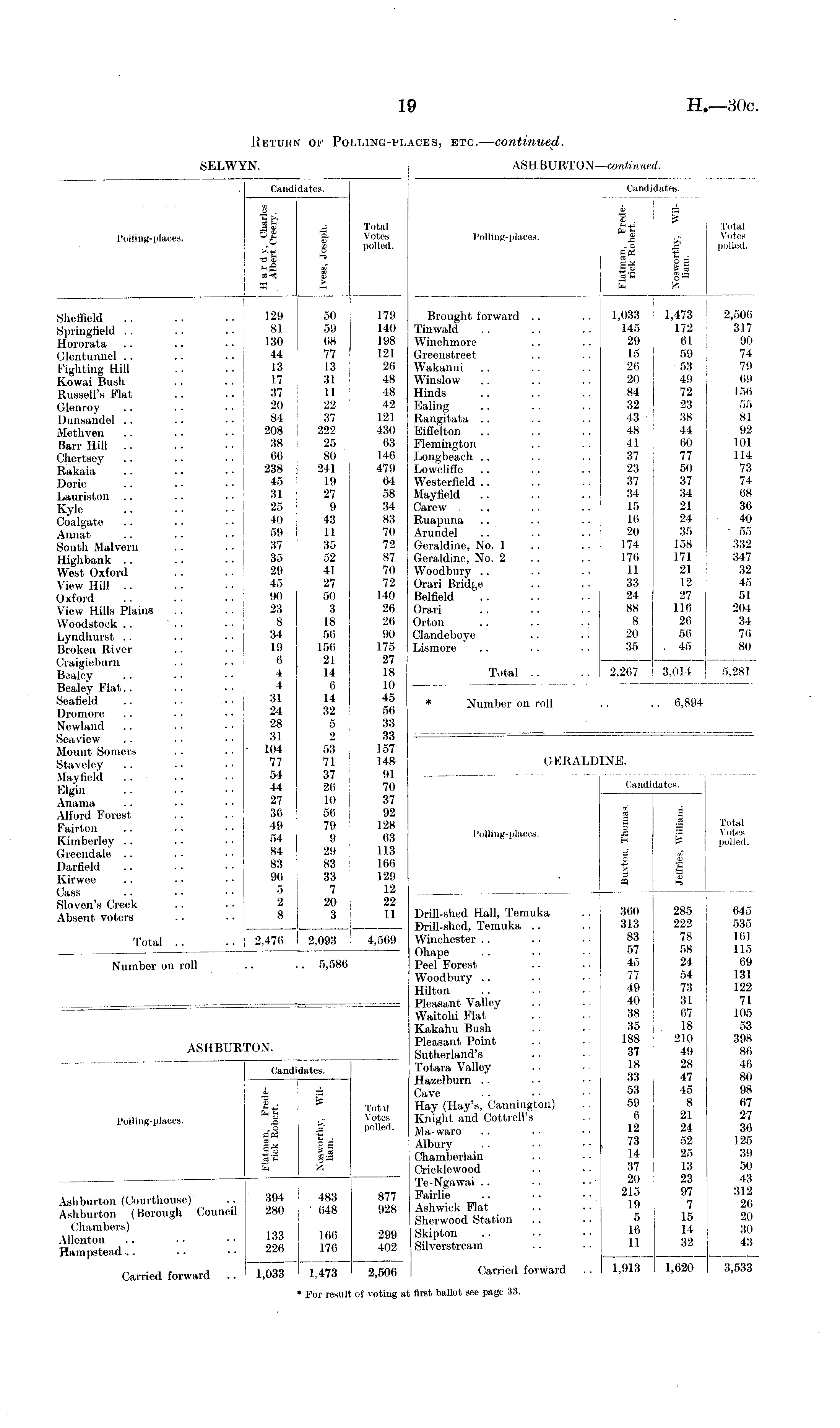 SELW N. — continue) Polling-places. as t- ■— CL> S £ a © fa£ re fa", H Candidates. ©: S. © o © Total N'otes polled. Polling-places. Candidates. © ."a -a £ fa -fa fa fa © j© >, 3 s I © fa £ 'total Votes polled. Sheffield Springfield Hororata Glentunnel Fighting Hill Kowai Bush Russell's Flat Glenroy Dunsandel Methven Barr Hill Chertsey liakaia Doric Lauriston Kyle Coalgate Annat South Malvern Highbank West Oxford View Hill Oxford VieNV Hills Plains Woodstock .. Lyndhurst Broken River Craigieburn Bealey Bealey Flat Sealield Dromore Newlaild Seaview •Mount Somcrs Staveley Maytielil . . lOlgiu Anama Alford Forest Fairton Kimberley .. Greendale .. DarHelil Kirwee 129 SI 130 44 13 17 37 20 84 208 38 66 238 45 31 25 40 59 37 35 29 45 90 23 8 34 19 6 4 4 31 24 28 31 - 104 77 54 44 27 36 49 54 84 83 96 5 2 8 50 59 68 77 13 31 11 22 37 222 25 SO 241 19 27 9 43 11 35 52 41 27 511 3 18 56 156 21 14 6 14 32 5 2 53 71 37 26 10 56 79 9 29 83 33 7 20 , 3 179 140 198 121 26 48 48 42 121 430 63 146 479 64 58 34 83 70 72 87 70 72 140 26 26 90 175 27 18 10 45 56 33 33 157 148 91 70 37 92 128 63 113 166 129 12 22 11 Brought forward .. Tinwald Winchmore Greenstreet Wakanui Winslow Hinds Ealing Rangitata Eiffelton Ftemington Longbeach Lowcliffe Westerfield .. Mayfield Carew ... Ruapuna Arundel Geraldine, No. 1 Geraldine, No. 2 Woodbury Orari Bridge Belfield Orari Orton Clandeboye Lismore 1,033 1,473 145 I 172 29 61 15 59 26 ' 53 20 49 84 j 72 32 i 23 43 38 48 44 41 00 37 77 23 50 37 37 34 34 15 21 16 24 20 35 174 158 176 171 11 21 33 12 24 27 88 116 8 26 20 56 35 . 45 2,506 317 90 74 79 09 150 55 81 92 101 114 73 74 68 36 40 55 332 347 32 45 51 204 34 76 80 Total 2,267 3,014 5.281 * Number on roll .. 6,894 (iKKALD .NE. Candidates. Polling-places. re | — H fl *y. fl X a _re 'i- | s^ Total N'otes polled. Cass Sloven's Creek Absent, voters Drill-shed Hall, Temuka Drill-shed, Temuka .. Winchester Ohape Peel Forest Woodbury Hilton Pleasant Valley Waitohi Flat ' Kakahu Bush Pleasant, Point Sutherland's Totara Valley Hazelburn Cave Hay (Hay's, Cannington) Knight and CottreU'B Ma-Nvaro Albury Chamberlain Crieklewood Te-Ngawai Fairlie Ashwick Flat Sherwood Station Skipton Silverstream 360 313 83 57 45 77 49 40 38 35 . 188 37 18 33 53 59 6 12 73 14 37 20 215 19 5 16 ! 11 285 222 78 58 24 54 73 31 67 18 210 49 28 47 45 8 21 24 52 25 13 23 97 7 15 14 32 645 535 161 115 69 131 122 71 105 53 398 86 46 80 98 67 27 36 125 39 50 43 312 26 20 30 43 Total .. 2,476 2,093 4,569 Number on roll 5,586 ASHBUR' ON. Candidates. © •a s| A „o = ©3 re flfai fa © re'fa fa 'i Polling-places. I . 1 = p Tot il N'otes polled. Ash burton (Courthouse) Ashburton (Borough Council Chambers) Allenlon Hampstead 394 280 483 ' 648 877 928 133 226 166 176 299 402 ; 1,033 1,473 2,506 ('aii'ied forward 1,913 i 1,620 3,533 Carried forward * For result of voting a first ballot see page 33. at