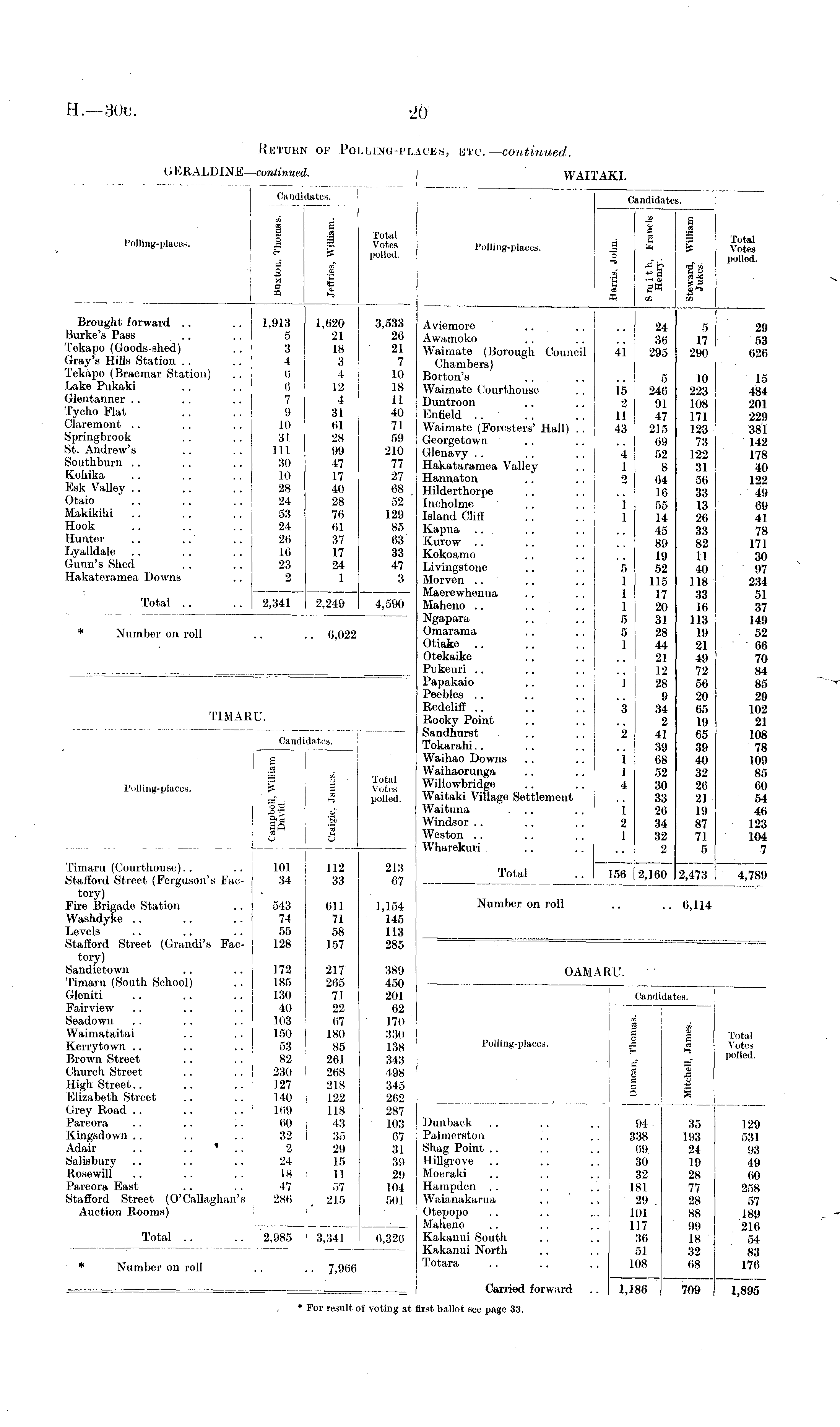 G KR \LDINE■continued WAITAKI. Candii dates. Candidates. Polling-places. I I H fl" s y. s X J 'fate 9 Total N'otes polled. Polling-places. © | a 'o fl as fa 2jj s x Vi 3 .2 Total Votes polled. a" „. |J ©fas fa Brought forward . . Burke's Pass Tekapo (Goods-shed) Gray's Hills Station .. Tekapo (Braemar Station) Lake Pukaki Glentanner Tycho Flat Ciaremont Spriugbrook St. Andrew's Southburn Kohika Esk Valley Otaio Makikihi Hook Hunter Lyalldale Gunn's Shed Hakateramea Downs 1,913 5 3 4 (i 6 7 9 10 31 111 30 10 28 24 53 24 26 16 23 2 2,341 1,620 21 18 I 12 4 31 61 28 99 47 17 40 28 76 61 37 17 24 1 2.249 3,533 26 21 18 11 40 71 59 210 77 27 OS 52 ' 129 85 63 33 47 3 4,590 Aviemore Awamoko Waimate (Borough Council Chambers) Borton's Waimate Courthouse Duntroon Enfield Waimate (Foresters' Hall) . . Georgetown Glenavy Hakataramea V r alley Hannaton Hilderthorpe Incholme Island Cliff Kapua Kurow Kokoamo Livingstone Morven Maerewhenua Maheno Ngapara Omarama Otiake Otekaike Pukeuri Papakaio Peebles Redclifi .. Rocky Point Sandhurst Tokarahi Waihao Dowtis Waihaorunga Willowbridge Waitaki Village Settlement Waituna ... Windsor Weston Wharekuri 41 is o II 43 4 1 2 i i 5 1 1 1 5 5 I 24 36 295 5 246 91 47 215 69 52 8 64 16 55 14 45 89 19 52 115 17 20 31 28 44 21 12 28 9 34 2 41 39 68 52 30 33 26 34 32 2 5 17 290 10 223 108 171 123 73 122 31 56 33 13 26 33 82 11 40 118 33 16 113 19 21 49 72 56 20 65 19 65 39 40 32 26 21 19 87 71 5 29 53 626 15 484 201 229 381 142 178 40 122 49 69 41 78 171 30 97 234 51 37 149 52 66 70 84 85 29 102 21 108 78 109 85 60 54 46 123 104 7 Total . . * Number on roll , 0,022 1 3 TIMAB -U. 2 Candidates. Polling-places. Total Votes polled. 1 1 4 I. in _." '8 2 1 2 1 Timaru (Courthouse).. Stafford Street (Ferguson's Factory) Fire Brigade Station Washdyke Levels Stafford Street (Grandi's Factory) Sandietown Timaru (South School) Gleniti Fairview Seadown Waimataitai Kerrytown Brown Street ('hurch Street High Street Elizabeth Street Orey Road Pareora Kingsdown Adair .. .. * .. Salisbury Rosewill Pareora East Stafford Street (O'Callaghan's Auction Rooms) 101 34 543 74 55 128 I 172 1S5 130 40 103 150 53 82 230 127 140 169 60 32 2 24 IS 47 2S6 112 33 (ill 71 58 157 217 265 71 22 67 180 85 261 268 2IS 122 118 43 35 29 15 II 57 215 213 67 1,154 145 113 285 389 450 201 62 170 330 138 343 498 345 262 287 103 67 31 30 20 104 501 Total Polling-places. Number on roll OAMA 156 re H fl" re © fl ;V. 2,160 Candidates. .. 6,114 3 2,473 Total Notes polled. 4,789 Dunback Palmerston Shag Point Hillgrove Moeraki Hampden Waianakarua Otepopo Maheno Kakanui South Kakanui North Totara 94 338 69 30 32 181 29 101 117 36 51 108 35 193 24 19 28 77 28 88 09 18 32 68 129 531 93 49 60 258 57 189 216 54 83 176 Total .. ..... 2,985 1 3,341 6,326 * Number on roll .. 7,966 Carried forward 1,186 709 1,895 * 'or result of voting at irst ballot see page 33.