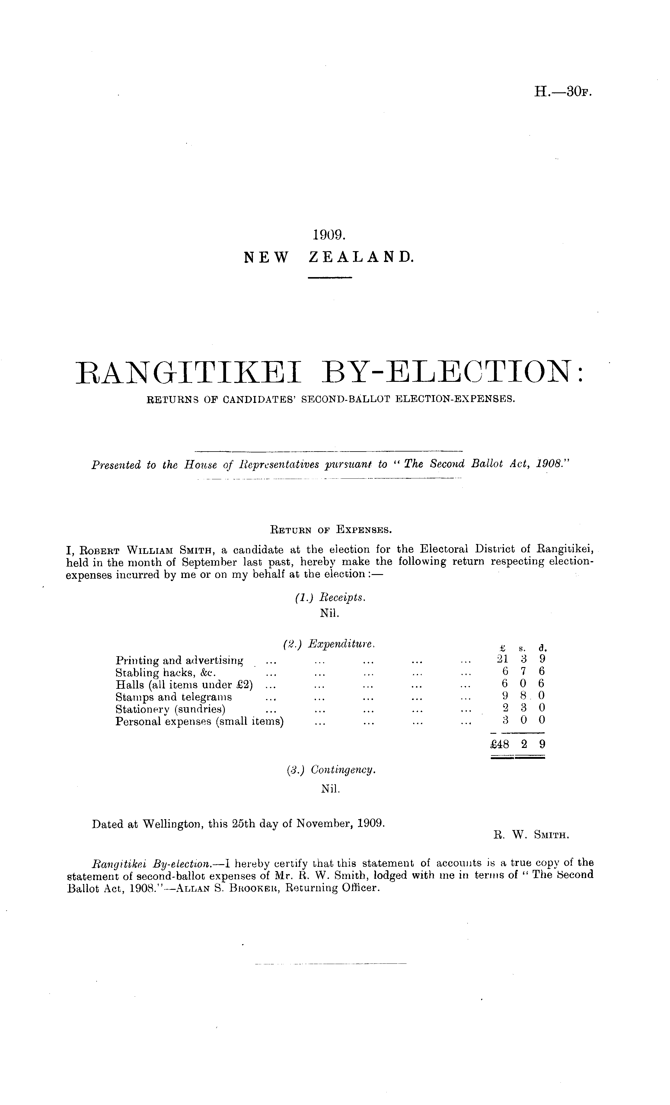 Ebtukn of Expenses. I, Robert William Smith, a candidate at the election for the Electoral District of Eangitikei, held in the month of September last past, hereby make the following return respecting electionexpenses incurred by me or on my behalf at the election : — (1.) Receipts. Nil. (2.) Expenditure, £ s d Printing and advertising ... ... ... ... ... 21 3 9 Stabling hacks, &c. ... ... ... ... ... 6 7 6 Halls (all items under £2) ... ... ... ... ... 6 0 6 Stamps and telegrams ... ... ... ... ... 9 8.0 Stationery (sundries) ... ... ... ... ... 230 Personal expenses (small items) ... ... ... ... 3 0 0 £48 2 9 (3.) Contingency. Nil. Dated at Wellington, this 25th day of November, 1909. B. W. Smith. Rangitikei By-election. —l hereby certify that this statement of accounts is a true copy of the statement of second-ballot expenses of Mr. R. W. Smith, lodged with me in terms of " The Second Ballot Act, 1908."—Allan S. Bkookbh, Returning Officer.