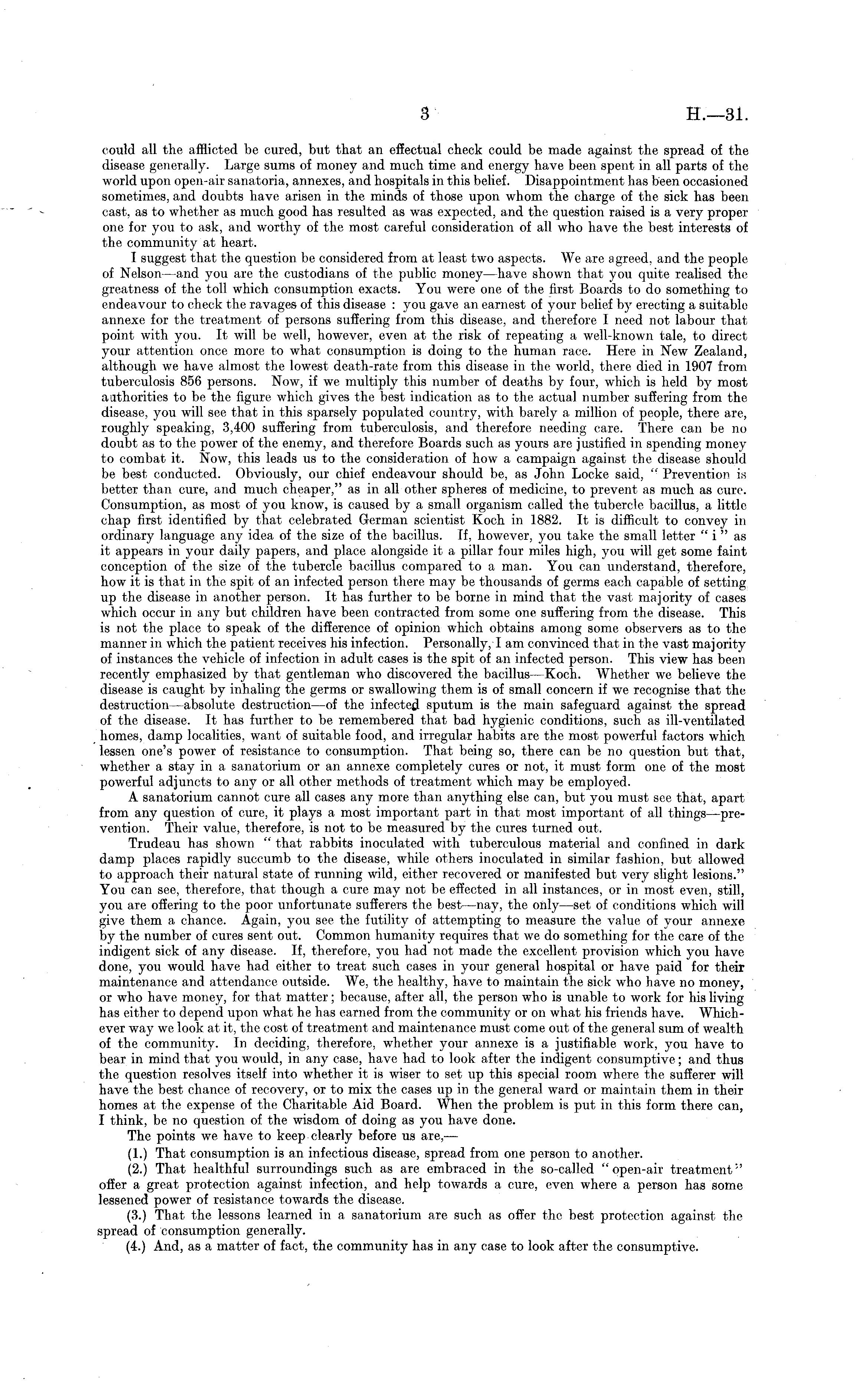 could all the afflicted be cured, but that an effectual check could be made against the spread of the disease generally. Large sums of money and much time and energy have been spent in all parts of the world upon open-air sanatoria, annexes, and hospitals in this belief. Disappointment has been occasioned sometimes, and doubts have arisen in the minds of those upon whom the charge of the sick has been cast, as to whether as much good has resulted as was expected, and the question raised is a very proper one for you to ask, and worthy of the most careful consideration of all who have the best interests of the community at heart. I suggest that the question be considered from at least two aspects. We are agreed, and the people of Nelson—and you are the custodians of the public money —have shown that you quite realised the greatness of the toll which consumption exacts. You were one of the first Boards to do something to endeavour to check the ravages of this disease : you gave an earnest of your belief by erecting a suitable annexe for the treatment of persons suffering from this disease, and therefore I need not labour that point with you. It will be well, however, even at the risk of repeating a well-known tale, to direct your attention once more to what consumption is doing to the human race. Here in New Zealand, although we have almost the lowest death-rate from this disease in the world, there died in 1907 from tuberculosis 856 persons. Now, if we multiply this number of deaths by four, which is held by most authorities to be the figure which gives the best indication as to the actual number suffering from the disease, you will see that in this sparsely populated country, with barely a million of people, there are, roughly speaking, 3,400 suffering from, tuberculosis, and therefore needing care. There can be no doubt as to the power of the enemy, and therefore Boards such as yours are justified in spending money to combat it. Now, this leads us to the consideration of how a campaign against the disease should be best conducted. Obviously, our chief endeavour should be, as John Locke said, " Prevention is better than cure, and much cheaper," as in all other spheres of medicine, to prevent as much as cure. Consumption, as most of you know, is caused by a small organism called the tubercle bacillus, a little chap first identified by that celebrated German scientist Koch in 1882. It is difficult to convey in ordinary language any idea of the size of the bacillus. If, however, you take the small letter "i" as it appears in your daily papers, and place alongside it a pillar four miles high, you will get some faint conception of the size of the tubercle bacillus compared to a man. You can understand, therefore, how it is that in the spit of an infected person there may be thousands of germs each capable of setting up the disease in another person. It has further to be borne in mind that the vast majority of cases which occur in any but children have been contracted from some one suffering from the disease. This is not the place to speak of the difference of opinion which obtains among some observers as to the manner in which the patient receives his infection. Personally, lam convinced that in the vast majority of instances the vehicle of infection in adult cases is the spit of an infected person. This view has been recently emphasized by that gentleman who discovered the bacillus—Koch. Whether we believe the disease is caught by inhaling the germs or swallowing them is of small concern if we recognise that the destruction —absolute destruction—of the infected sputum is the main safeguard against the spread of the disease. It has further to be remembered that bad hygienic conditions, such as ill-ventilated homes, damp localities, want of suitable food, and irregular habits are the most powerful factors which lessen one's power of resistance to consumption. That being so, there can be no question but that, whether a stay in a sanatorium or an annexe completely cures or not, it must form one of the most powerful adjuncts to any or all other methods of treatment which may be employed. A sanatorium cannot cure all cases any more than anything else can, but you must see that, apart from any question of cure, it plays a most important part in that most important of all things—prevention. Their value, therefore, is not to be measured by the cures turned out. Trudeau has shown " that rabbits inoculated with tuberculous material and confined in dark damp places rapidly succumb to the disease, while others inoculated in similar fashion, but allowed to approach their natural state of running wild, either recovered or manifested but very slight lesions." You can see, therefore, that though a cure may not be effected in all instances, or in most even, still, you are offering to the poor unfortunate sufferers the best—nay, the only —set of conditions which will give them a chance. Again, you see the futility of attempting to measure the value of your annexe by the number of cures sent out. Common humanity requires that we do something for the care of the indigent sick of any disease. If, therefore, you had not made the excellent provision which you have done, you would have had either to treat such cases in your general hospital or have paid for their maintenance and attendance outside. We, the healthy, have to maintain the sick who have no money, or who have money, for that matter; because, after all, the person who is unable to work for his living has either to depend upon what he has earned from the community or on what his friends have. Whichever way we look at it, the cost of treatment and maintenance must come out of the general sum of wealth of the community. In deciding, therefore, whether your annexe is a justifiable work, you have to bear in mind that you would, in any case, have had to look after the indigent consumptive; and thus the question resolves itself into whether it is 
