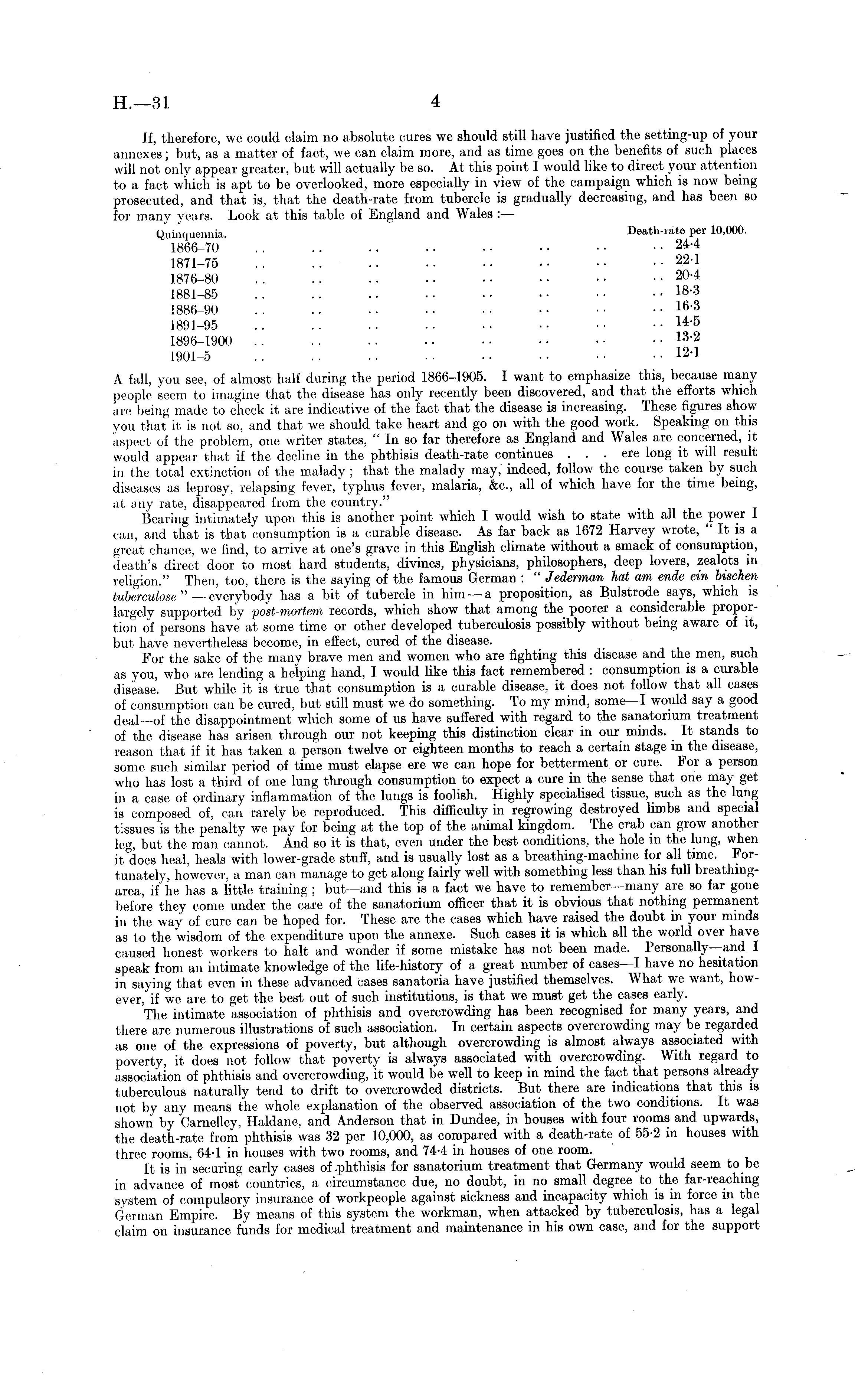 If, therefore, we could claim no absolute cures we should still have justified the setting-up of your annexes; but, as a matter of fact, we can claim more, and as time goes on the benefits of such places will not only appear greater, but will actually be so. At this point I would like to direct your attention to a fact which is apt to be overlooked, more especially in view of the campaign which is now being prosecuted, and that is, that the death-rate from tubercle is gradually decreasing, and has been so for many years. Look at this table of England and Wales : — Quinquennia. Death-rate per 10,000. 1866-70 .. .. .. ■• •• •• •• •■ 244 1871-75 .. .. .. •• •• •• •• •• 22 -! 1876-80 .. .. .. .. •• •• •• •■ 204 1881-85 .. .. .. . • ■ • • ■ • • • • 18 3 1886-90 .. .. • • • • • • • • • • • ■ 16-3 1891-95 .. .. .. •• •• •• •• •• 14-5 1896-1900 .. .. • • • • • • • • • • • • 13 2 1901-5 .. .. .. •• •• •• •• 12 -! A fall, you see, of almost half during the period 1866-1905. I want to emphasize this, because many people seem to imagine that the disease has only recently been discovered, and that the efforts which are being made to check it are indicative of the fact that the disease is increasing. These figures show you that it is not so, and that we should take heart and go on with the good work. Speaking on this aspect of the problem, one writer states, " In so far therefore as England and Wales are concerned, it would appear that if the decline in the phthisis death-rate continues ... ere long it will result in the total extinction of the malady ; that the malady may, indeed, follow the course taken by such diseases as leprosy, relapsing fever, typhus fever, malaria, &c, all of which have for the time being, at any rate, disappeared from the country." Bearing intimately upon this is another point which I would wish to state with all the power I can, and that is that consumption is a curable disease. As far back as 1672 Harvey wrote, "Itis a great chance, we find, to arrive at one's grave in this English climate without a smack of consumption, death's direct door to most hard students, divines, physicians, philosophers, deep lovers, zealots in religion." Then, too, there is the saying of the famous German : " Jederman hat am ende em bischen tuberculose " - everybody has a bit of tubercle in him —a proposition, as Bulstrode says, which is largely supported by post-mortem records, which show that among the poorer a considerable proportion of persons have at some time or other developed tuberculosis possibly without being aware of it, but have nevertheless become, in effect, cured of the disease. For the sake of the many brave men and women who are fighting this disease and the men, such as you, who are lending a helping hand, I would like this fact remembered : consumption is a curable disease. But while it is true that consumption is a curable disease, it does not follow that all cases of consumption can be cured, but still must we do something. To my mind, some—l would say a good deal -of the disappointment which some of us have suffered with regard to the sanatorium treatment of the disease has arisen through our not keeping this distinction clear in our minds. _ It stands to reason that if it has taken a person twelve or eighteen months to reach a certain stage in the disease, some such similar period of time must elapse ere we can hope for betterment or cure. For a person who has lost a third of one lung through consumption to expect a cure in the sense that one may get in a case of ordinary inflammation of the lungs is foolish. Highly specialised tissue, such as the lung is composed of, can rarely be reproduced. This difficulty in regrowing destroyed limbs and special tissues is the penalty we pay for being at the top of the animal kingdom. The crab can grow another leg, but the man cannot. And so it is that, even under the best conditions, the hole in the lung, when it does heal, heals with lower-grade stuff, and is usually lost as a breathing-machine for all time. Fortunately, however, a man can manage to get along fairly well with something less than his full breathingarea, if he has a little training ; but—and this is a fact we have to remember—many are so far gone before they come under the care of the sanatorium officer that it is obvious that nothing permanent in the way of cure can be hoped for. These are the cases which have raised the doubt in your minds as to the wisdom of the expenditure upon the annexe. Such cases it is which all the world over have caused honest workers to halt and wonder if some mistake has not been made. Personally—and I speak from an intimate knowledge of the life-history of a great number of cases—l have no hesitation in saying that even in these advanced cases sanatoria have justified themselves. What we want, however, if we are to get the best out of such institutions, is that we must get the cases early. The intimate association of phthisis and overcrowding has been recognised for many years, and there are numerous illustrations of such association. In certain aspects overcrowding may be regarded as one of the expressions of poverty, but although overcrowding is almost always associated with poverty, it does not follow that poverty is always associated with overcrowding. With regard to association of phthisis and overcrowding, it would be well to keep in mind the fact that persons already tuberculous naturally tend to drift to overcrowded districts. But there are indications that this is not by any means the whole explanation of the observed association of the two conditions. It was shown by Carnelley, Haldane, and Anderson that in Dundee, in houses with four rooms and upwards, the death-rate from phthisis was 32 per 10,000, as compared with a death-rate of 55-2 in houses with three roo