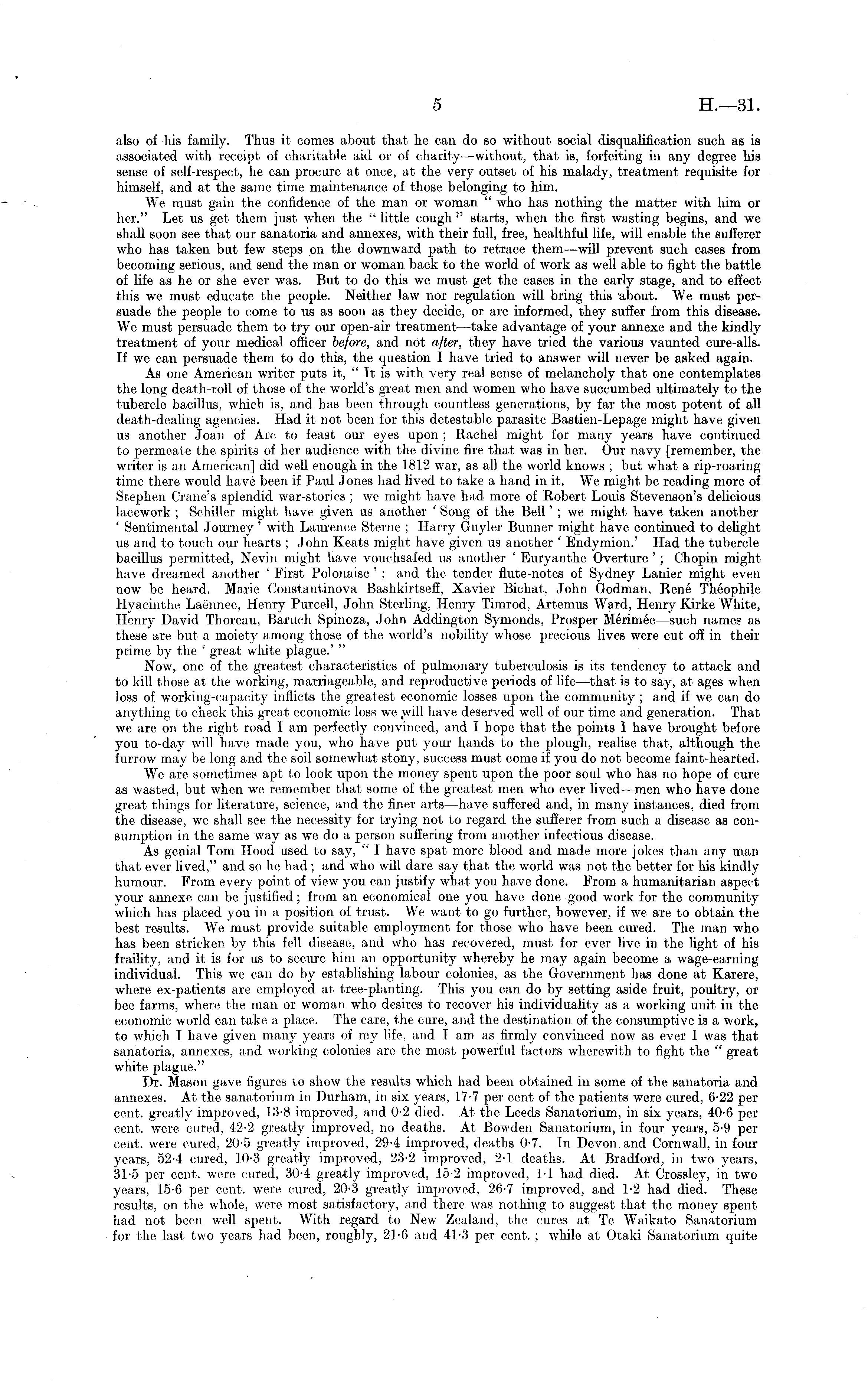 also of his family. Thus it comes about that he can do so without social disqualification such as is associated with receipt of charitable aid or of charity—without, that is, forfeiting in any degree his sense of self-respect, he can procure at once, at the very outset of his malady, treatment requisite for himself, and at the same time maintenance of those belonging to him. We must gain the confidence of the man or woman " who has nothing the matter with him or her." Let us get them just when the " little cough " starts, when the first wasting begins, and we shall soon see that our sanatoria and annexes, with their full, free, healthful life, will enable the sufferer who has taken but few steps on the downward path to retrace them—will prevent such cases from becoming serious, and send the man or woman back to the world of work as well able to fight the battle of life as he or she ever was. But to do this we must get the cases in the early stage, and to effect this we must educate the people. Neither law nor regulation will bring this about. We must persuade the people to come to us as soon as they decide, or are informed, they suffer from this disease. We must persuade them to try our open-air treatment —take advantage of your annexe and the kindly treatment of your medical officer before, and not after, they have tried the various vaunted cure-alls. If we can persuade them to do this, the question I have tried to answer will never be asked again. As one American writer puts it, " It is with very real sense of melancholy that one contemplates the long death-roll of those of the world's great men and women who have succumbed ultimately to the tubercle bacillus, which is, and has been through countless generations, by far the most potent of all death-dealing agencies. Had it not been for this detestable parasite Bastien-Lepage might have given us another Joan of Arc to feast our eyes upon ; Rachel might for many years have continued to permeate the spirits of her audience with the divine fire that was in her. Our navy [remember, the writer is an American] did well enough in the 1812 war, as all the world knows ; but what a rip-roaring time there would have been if Paul Jones had lived to take a hand in it. We might be reading more of Stephen Crane's splendid war-stories ; we might have had more of Robert Louis Stevenson's delicious lacework ; Schiller might have given us another ' Song of the Bell' ; we might have taken another ' Sentimental Journey ' with Laurence Sterne ; Harry Guyler Bunner might have continued to delight us and to touch our hearts ; John Keats might have given us another ' Endymion.' Had the tubercle bacillus permitted, Nevin might have vouchsafed us another ' Euryanthe Overture ' ; Chopin might have dreamed another ' First Polonaise ' ; and the tender flute-notes of Sydney Lanier might even now be heard. Marie Constantinova Bashkirtseff, Xavier Bichat, John Godman, Rene Theophile Hyacinthe Laennec, Henry Purcell, John Sterling, Henry Timrod, Artemus Ward, Henry Kirke White, Henry David Thoreau, Baruch Spinoza, John Addington Symonds, Prosper Merimee—such names as these are but a moiety among those of the world's nobility whose precious lives were cut off in their prime by the ' great white plague.' " Now, one of the greatest characteristics of pulmonary tuberculosis is its tendency to attack and to kill those at the working, marriageable, and reproductive periods of life—that is to say, at ages when loss of working-capacity inflicts the greatest economic losses upon the community ; and if we can do anything to check thi3 great economic loss we t will have deserved well of our time and generation. That we are on the right road I am perfectly convinced, and I hope that the points I have brought before you to-day will have made you, who have put your hands to the plough, realise that, although the furrow may be long and the soil somewhat stony, success must come if you do not become faint-hearted. We are sometimes apt to look upon the money spent upon the poor soul who has no hope of cure as wasted, but when we remember that some of the greatest men who ever lived—men who have done great things for literature, science, and the finer arts —have suffered and, in many instances, died from the disease, we shall see the necessity for trying not to regard the sufferer from such a disease as consumption in the same way as we do a person suffering from another infectious disease. As genial Tom Hood used to say, " I have spat more blood and made more jokes than any man that ever lived," and so he had ; and who will dare say that the world was not the better for his kindly humour. From every point of view you can justify what you have done. From a humanitarian aspect your annexe can be justified; from an economical one you have done good work for the community which has placed you in a position of trust. We want to go further, however, if we are to obtain the best results. We must provide suitable employment for those who have been cured. The man who has been stricken by this fell disease, and who has recovered, must for ever live in the light of his fraility, and it is for us to secure him an opportunity whereby he may again become a wage-earning individual. This we can do by establishing labour colonies, as the Government has done at Karere, where ex-patients are employed at tree-planting. This you can do by setting aside fruit, poultry, or bee farms, where the man or woman who desires to recover his individuality as a working unit in the economic world can take a place. The care, the cure, and the destination of the consumptive is a work, to which I have given many years of my life, and I am as firmly convinced now as ever I was that sanatoria, annexes, and working colonies are the most powerful factors wherewith to fight the " great white plague." Dr. Mason gave figures to show the results which had been obtained in some of the sanatoria and annexes. At the san