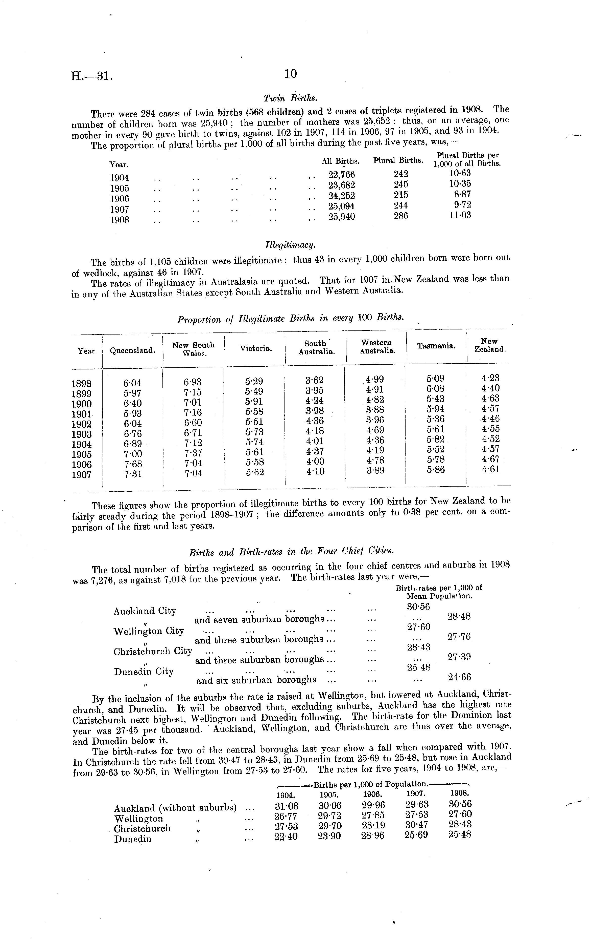 There were 284 cases of twin births (568 children) and 2 cases of triplets registered m 1908. The number of children born was 25,940 ; the number of mothers was 25,652 : thus, on an average, one mother in every 90 gave birth to twins, against 102 in 1907, 114 in 1906, 97 in 1905, and 93 m 1904. The proportion of plural births per 1,000 of all births during the past five years, was — ,„. , _, .„. ~ Plural Births per Year. AU Bl F thB - Plural Blrths - 1,000 of all Births. 1904 22,766 242 10-63 1905 23,682 245 10-35 1906 • ■■ 24,252 215 8-87 ,007 •• •• 25,094 244 9-72 1908 .. 25,940 286 11-03 Illegitimacy. The births of 1,105 children were illegitimate : thus 43 in every 1,000 children born were born out of wedlock, against 46 in 1907. . The rates of illegitimacy in Australasia are quoted. That for 1907 in.New Zealand was less than in any of the Australian States except South Australia and Western Australia.