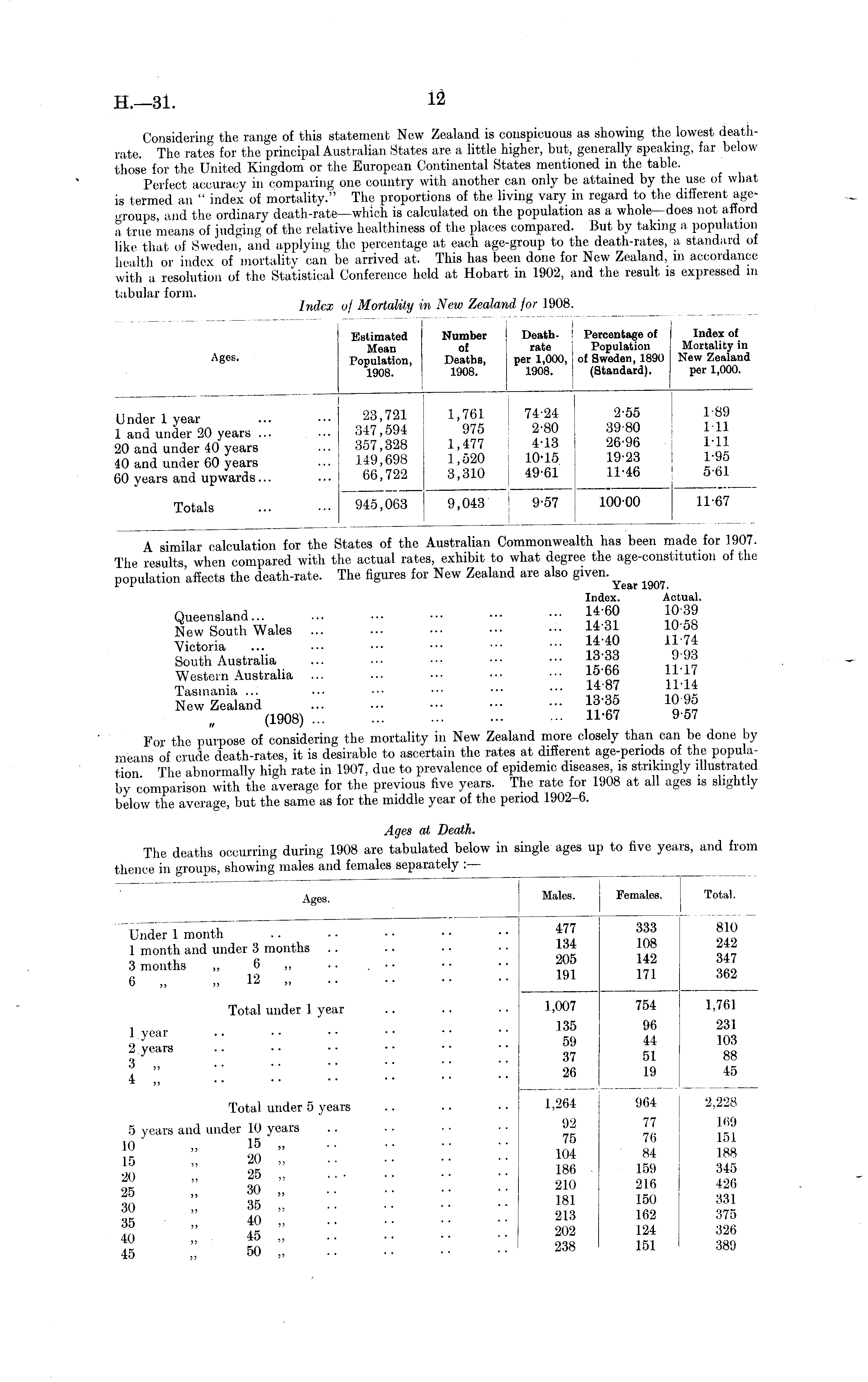 A similar calculation for the States of the Australian Commonwealth has been made for 1907. The results when compared with the actual rates, exhibit to what degree the age-constitution of the population affects the death-rate. The figures for New Zealand are also given. Index. Actual. Queensland }±f 1039 Now South Wales If 31 10-58 Victoria IffO 11;7{ South Australia ... ... ••• ••• ■•• j£ dd *™ Western Australia ... ... ••• ••• ••• I°'°° \\\< Tasmania ... ) ll'l* New Zealand (1908) 11-67 9-57 For the purpose of considering the mortality in New Zealand more closely than can be done by means of crude death-rates, it is desirable to ascertain the rates at different age-periods of the population The abnormally high rate in 1907, due to prevalence of epidemic diseases, is strikingly illustrated by comparison with the average for the previous five years. The rate for 1908 at all ages is slightly below the average, but the same as for the middle year of the period 1902-6. Ages at Death. The deaths occurring during 1908 are tabulated below in single ages up to five years, and from thence in groups, showing males and females separately : —