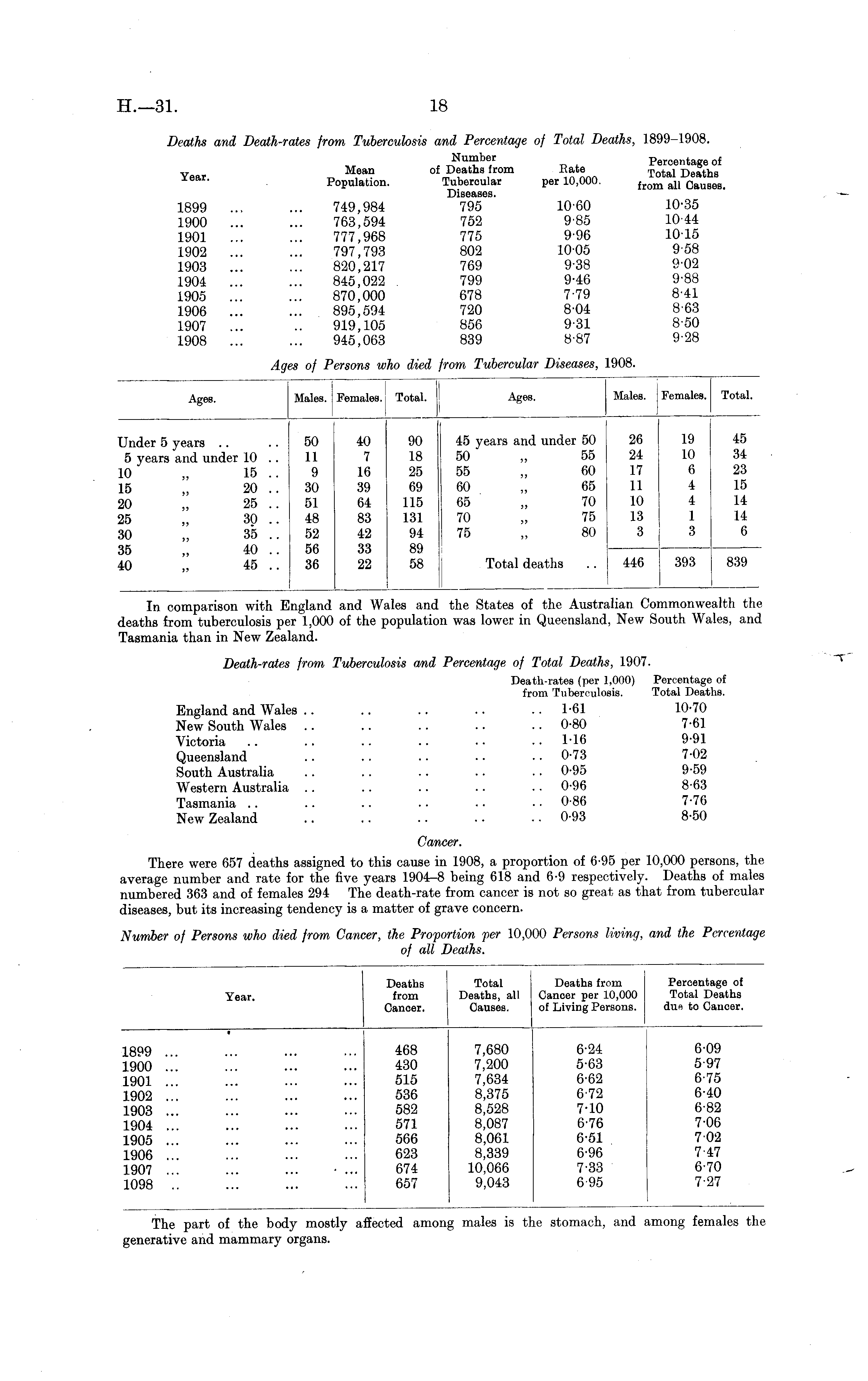 In comparison with England and Wales and the States of the Australian Commonwealth the deaths from tuberculosis per 1,000 of the population was lower in Queensland, New South Wales, and Tasmania than in New Zealand. Death-rates from Tuberculosis and Percentage of Total Deaths, 1907. Death-rates (per 1,000) Percentage of from Tuberculosis. Total Deaths. England and Wales 1-61 10-70 New South Wales .. .. .. .. .. 0-80 7-61 Victoria 1-16 9-91 Queensland 0-73 7-02 South Australia .. .. .. .. .. 0-95 9-59 Western Australia .. .. .. .. . • 0-96 8-63 Tasmania 0-86 7-76 New Zealand 0-93 8-50 Cancer. There were 657 deaths assigned to this cause in 1908, a proportion of 6-95 per 10,000 persons, the average number and rate for the five years 1904-8 being 618 and 6-9 respectively. Deaths of males numbered 363 and of females 294 The death-rate from cancer is not so great as that from tubercular diseases, but its increasing tendency is a matter of grave concern.