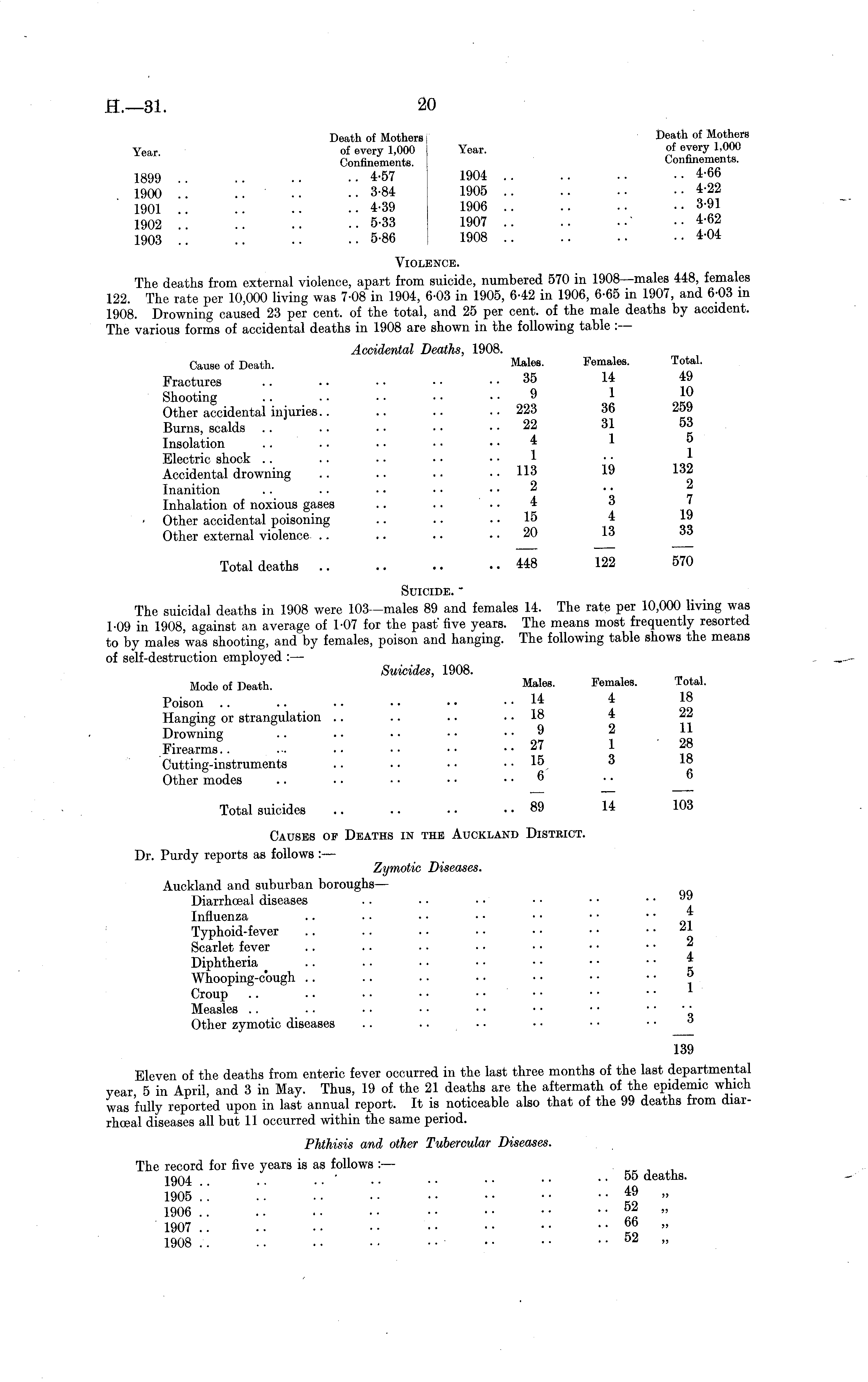 Death of Mothers Death of Mothers Year of every 1,000 , Year. of every 1,000 Confinements. ' Confinements. 1899 .. .. •• 4-57 1904 .. .. •• •• 4-66 1900 .. .. •• 3-84 1905 .. .. .. •■ 4-22 1901 .. 4-39 1906 .. .. •• •■ 3-91 1902 5-33 1907 ' •• 4-62 1903 5-86 1908 4-04 Violence. The deaths from external violence, apart from suicide, numbered 570 in 1908—males 448, females 122. The rate per 10,000 living was 7-08 in 1904, 6-03 in 1905, 6-42 in 1906, 6-65 in 1907, and 6-03 in 1908. Drowning caused 23 per cent, of the total, and 25 per cent, of the male deaths by accident. The various forms of accidental deaths in 1908 are shown in the following table :-- Accidental Deaths, 1908. Cause of Death. Males- Females. Total. Fractures .. .. •• •• ..35 14 49 Shooting 9 1 10 Other accidental injuries.. .. .. • • 223 36 259 Burns, scalds 22 31 53 Insolation .. .. • ■ ■ • .. 4 1 Electric shock . . .. .. • • •■ 1 • • £ Accidental drowning .. .. .. .. 113 19 132 Inanition .. .. • • • • .. 2 .. A Inhalation of noxious gases .. .. ' .. 4 3 7 ■ Other accidental poisoning .. .. .. 15 4 19 Other external violence .. .. .. .. 20 13 33 Total deaths 448 122 570 Suicide. The suicidal deaths in 1908 were 103—males 89 and females 14. The rate per 10,000 living was 1-09 in 1908, against an average of 1-07 for the past' five years. The means most frequently resorted to by males was shooting, and by females, poison and hanging. The following table shows the means of self-destruction employed : — Suicides, 1908. Mode of Death. Males. Females. Total. Poison 1* 18 Hanging or strangulation .. .. .. .. 18 4 22 Drowning .. . • • • • • .. 9 2 11 Firearms.. ... .. •• •• • • 27 * *° Cutting-instruments .. .. • • .. 15 3 18 Other modes .. • • • • • • .. 6 Total suicides .. .. • • • • 89 14 103 Causes of Deaths in the Auckland District. Dr. Purdy reports as follows : — Zymotic Diseases. Auckland and suburban boroughs — Diarrhceal diseases .. • ■ • • • • ■ • .. 99 Influenza .. . • • • • • • • • • '' of Typhoid-fever .. .. .. • ■ • • • • " o Scarlet fever Diphtheria .. • • • • • • • • • • • • * Whooping-cough Croup Measles .. . . • • • • • • • • • • " ' A Other zymotic diseases 139 Eleven of the deaths from enteric fever occurred in the last three months of the last departmental year, sin April, and 3in May. Thus, 19 of the 21 deaths are the aftermath of the epidemic which was fully reported upon in last annual report. It is noticeable also that of the 99 deaths from diarrhceal diseases all but 11 occurred within the same period. Phthisis and other Tubercular Diseases. The record for five years is as follows : — . 1904 . ' .. • • • • .. 55 deaths. 1905 .. .. ■ • •■ • • • • • • "" to " 1906 f " 1907 .. .. ■ • • • •- • • • • " ko " 1908 .. .. • • • ■ •• • • • • .. 52 „