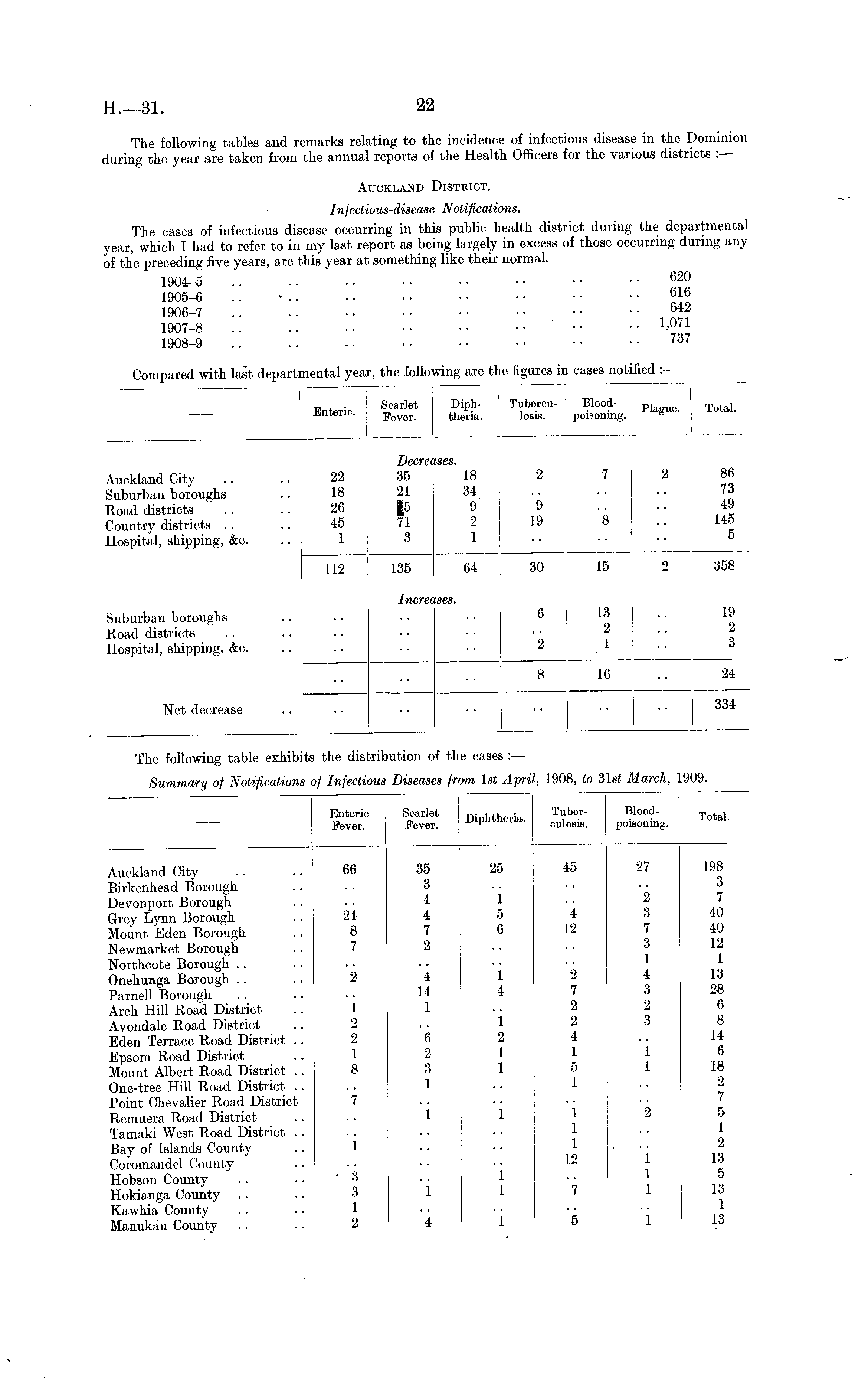 Enteric. Scarlet Fever. Diphtheria. I Tuberculosis. Bloodpoisoning. Plague. Total. Auckland City Suburban boroughs Road districts Country districts .. Hospital, shipping, &c. 22 18 26 45 1 Decrei 35 21 15 71 3 ',ses. 18 34 9 2 1 2 9 19 7 2 86 73 49 145 5 8 112 135 64 ! 30 15 2 358 Suburban boroughs lload districts Hospital, shipping, &c. Increi ',ses. 6 2 13 2 1 19 2 3 16 21 Net decrease 334