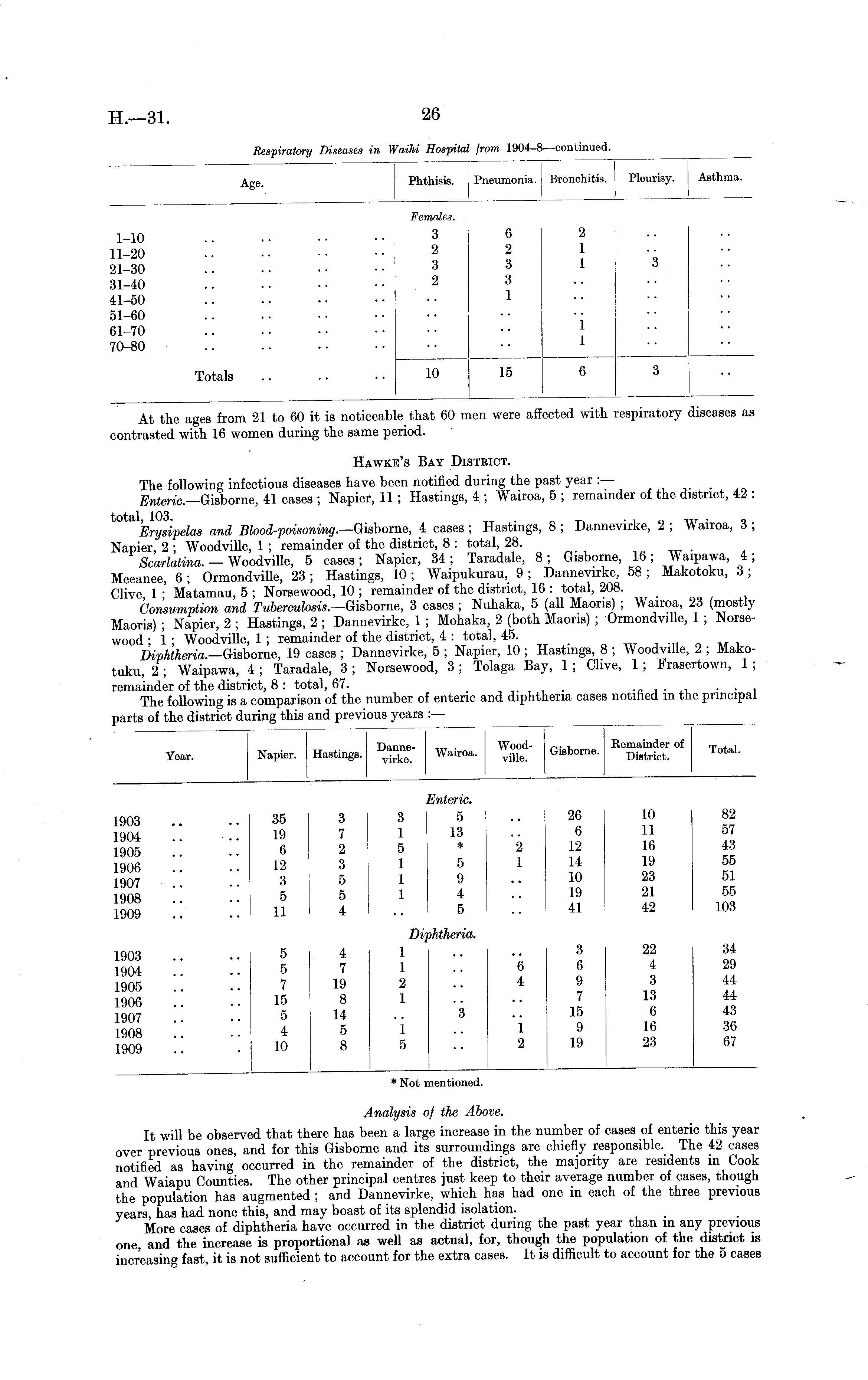 Analysis of the Above. It will be observed that there has been a large increase in the number of cases of enteric this year over previous ones, and for this Gisborne and its surroundings are chiefly responsible. The 42 cases notified as having occurred in the remainder of the district, the majority are residents in Cook and Waiapu Counties. The other principal centres just keep to their average number of cases, though the population has augmented ; and Dannevirke, which has had one in each of the three previous years has had none this, and may boast of its splendid isolation. More cases of diphtheria have occurred in the district during the past year than m any previous one and the increase is proportional as well as actual, for, though the population of the district is increasing fast, it is not sufficient to account for the extra cases. It is difficult to account for the 5 cases