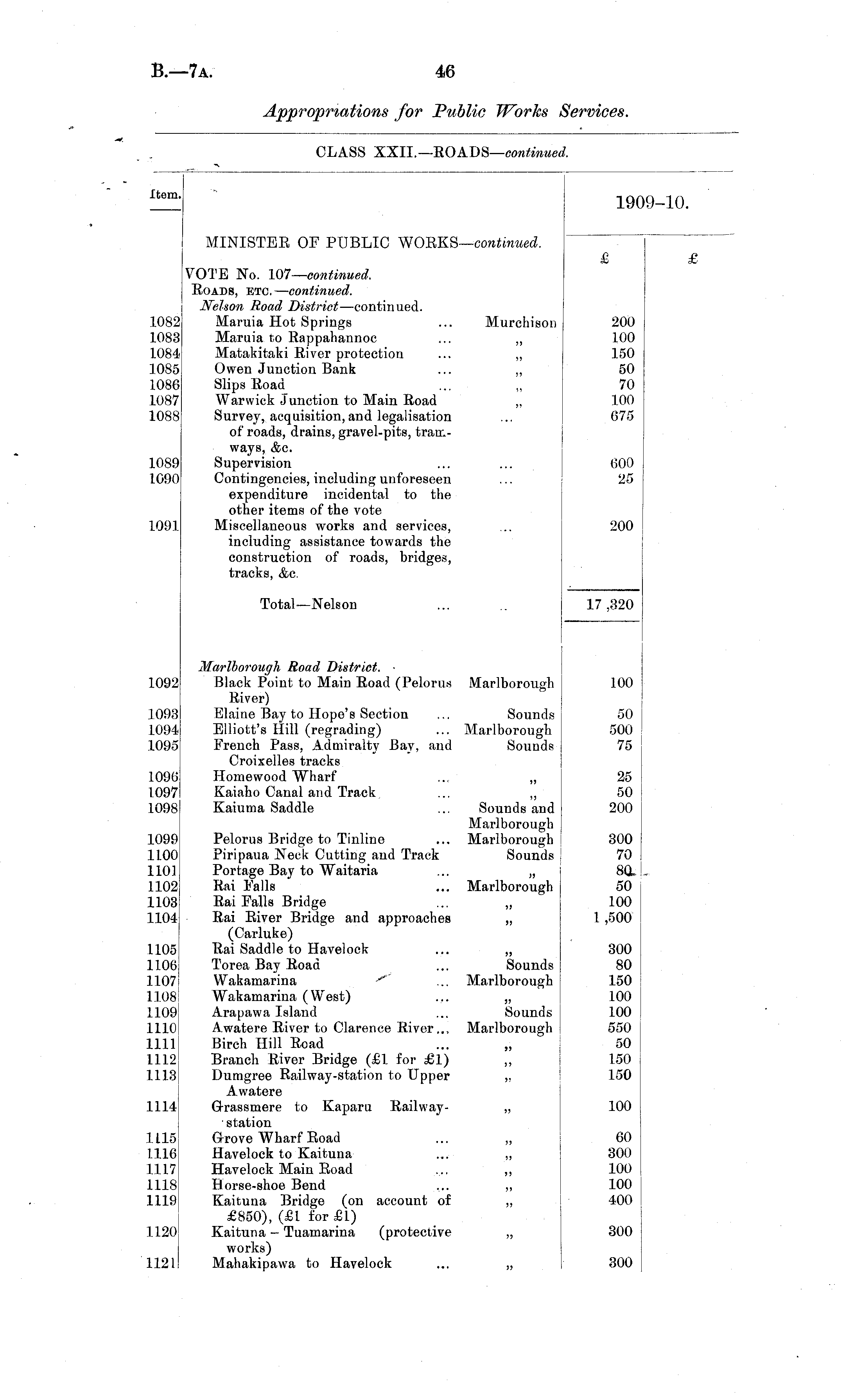 Item. 190 '-10. MINISTER OF PUBLIC WORKS— continued. VOTE No. 107 '—continued. Roads, etc. — continued. Nelson Road District —continued. Maruia Hot Springs ... Murchison Maruia to Rappahannoc ... ,, Matakitaki River protection ... „ Owen Junction Bank ... „ Slips Road Warwick Junction to Main Road „ Survey, acquisition, and legalisation of roads, drains, gravel-pits, tramways, Ac. Supervision Contingencies, including unforeseen expenditure incidental to the other items of the vote Miscellaneous works and services, including assistance towards the construction of roads, bridges, tracks, Ac. £ 1082 1083 1084 1085 1086 1087 1088 200 100 150 50 70 100 675 1089 1090 600 25 1091 200 Total- —Nelson 17 ,320 1092 1093 1094 1095 1096 1097 1098 1099 1100 1101 1102 1103 1104 Marlborough Road District. ■ Black Point to Main Road (Pelorus Marlborough River) Elaine Bay to Hope's Section ... Sounds Elliott's Hill (regrading) ... Marlborough French Pass, Admiralty Bay, and Sounds Croixelles tracks Homewood Wharf ... ,, Kaiaho Canal and Track ... ,, Kaiuma Saddle ... Sounds and Marlborough Pelorus Bridge to Tinline ... Marlborough Piripaua Neck Cutting and Track Sounds Portage Bay to Waitaria ... „ Rai Falls ... Marlborough Rai Falls Bridge ... ,, Rai River Bridge and approaches „ (Carluke) Rai Saddle to Havelock ... „ Torea Bay Road ... Sounds Wakamarina ... Marlborough Wakamarina (West) ... „ Arapawa Island ... Sounds Awatere River to Clarence River.., Marlborough Birch Hill Road ... „ Branch River Bridge (£1 for £1) ,, Dumgree Railway-station to Upper ,, Awatere 100 50 500 75 25 50 200 300 70 80 50 100 1 ,500 1105 1106 1107 1108 1109 1110 1111 1112 1113 300 80 150 100 100 550 50 150 150 1114 Grassmere to Kaparu Railway- „ station Grove Wharf Road ... „ Havelock to Kaituna ... ,, Havelock Main Road ... ,, Horse-shoe Bend .... ,, Kaituna Bridge (on account of ,, £850), (£1 for £1) Kaituna - Tuamarina (protective „ works) Mahakipawa to Havelock ... „ 100 1115 1116 1117 1118 1119 60 300 100 100 400 1120 300 1121 300