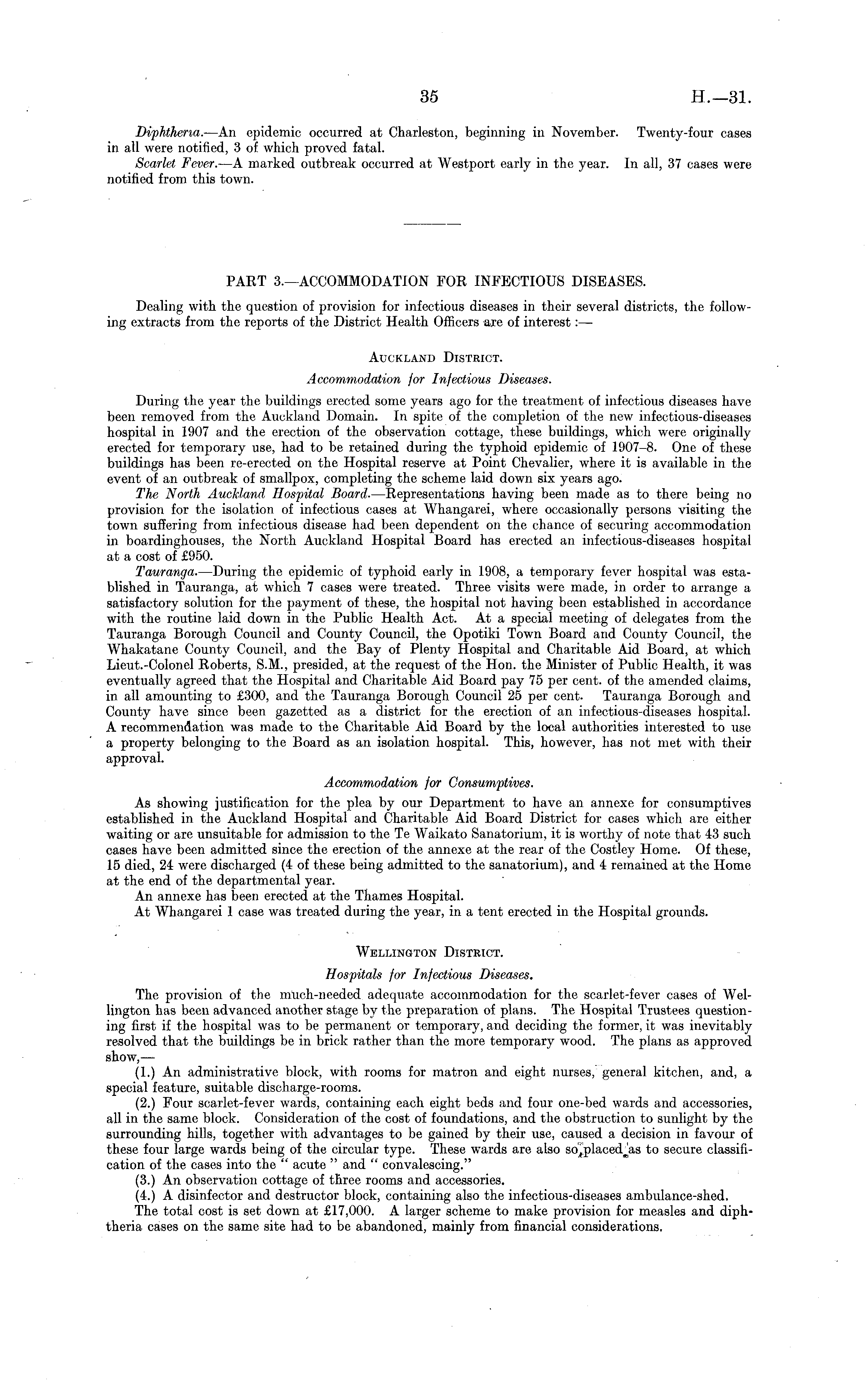 PART 3.—ACCOMMODATION FOR INFECTIOUS DISEASES. Dealing with the question of provision for infectious diseases in their several districts, the following extracts from the reports of the District Health Officers are of interest: — Auckland District. Accommodation for Infectious Diseases. During the year the buildings erected some years ago for the treatment of infectious diseases have been removed from the Auckland Domain. In spite of the completion of the new infectious-diseases hospital in 1907 and the erection of the observation cottage, these buildings, which were originally erected for temporary use, had to be retained during the typhoid epidemic of 1907-8. One of these buildings has been re-erected on the Hospital reserve at Point Chevalier, where it is available in the event of an outbreak of smallpox, completing the scheme laid down six years ago. The North Auckland Hospital Board. —Representations having been made as to there being no provision for the isolation of infectious cases at Whangarei, where occasionally persons visiting the town suffering from infectious disease had been dependent on the chance of securing accommodation in boardinghouses, the North Auckland Hospital Board has erected an infectious-diseases hospital at a cost of £950. Tauranga. —During the epidemic of typhoid early in 1908, a temporary fever hospital was established in Tauranga, at which 7 cases were treated. Three visits were made, in order to arrange a satisfactory solution for the payment of these, the hospital not having been established in accordance with the routine laid down in the Public Health Act. At a special meeting of delegates from the Tauranga Borough Council and County Council, the Opotiki Town Board and County Council, the Whakatane County Council, and the Bay of Plenty Hospital and Charitable Aid Board, at which Lieut.-Colonel Roberts, S.M., presided, at the request of the Hon. the Minister of Public Health, it was eventually agreed that the Hospital and Charitable Aid Board pay 75 per cent, of the amended claims, in all amounting to £300, and the Tauranga Borough Council 25 per cent. Tauranga Borough and County have since been gazetted as a district for the erection of an infectious-diseases hospital. A recommendation was made to the Charitable Aid Board by the local authorities interested to use a property belonging to the Board as an isolation hospital. This, however, has not met with their approval. Accommodation for Consumptives. As showing justification for the plea by our Department to have an annexe for consumptives established in the Auckland Hospital and Charitable Aid Board District for cases which are either waiting or are unsuitable for admission to the Te Waikato Sanatorium, it is worthy of note that 43 such cases have been admitted since the erection of the annexe at the rear of the Costley Home. Of these, 15 died, 24 were discharged (4 of these being admitted to the sanatorium), and 4 remained at the Home at the end of the departmental year. An annexe has been erected at the Thames Hospital. At Whangarei 1 case was treated during the year, in a tent erected in the Hospital grounds. Wellington District. Hospitals for Infectious Diseases. The provision of the much-needed adequate accommodation for the scarlet-fever cases of Wellington has been advanced another stage by the preparation of plans. The Hospital Trustees questioning first if the hospital was to be permanent or temporary, and deciding the former, it was inevitably resolved that the buildings be in brick rather than the more temporary wood. The plans as approved show, — (1.) An administrative block, with rooms for matron and eight nurses, general kitchen, and, a special feature, suitable discharge-rooms. (2.) Four scarlet-fever wards, containing each eight beds and four one-bed wards and accessories, all in the same block. Consideration of the cost of foundations, and the obstruction to sunlight by the surrounding hills, together with advantages to be gained by their use, caused a decision in favour of these four large wards being of the circular type. These wards are also to secure classification of the cases into the " acute " and " convalescing." (3.) An observation cottage of three rooms and accessories. (4.) A disinfector and destructor block, containing also the infectious-diseases ambulance-shed. The total cost is set down at £17,000. A larger scheme to make provision for measles and diphtheria cases on the same site had to be abandoned, mainly from financial considerations.