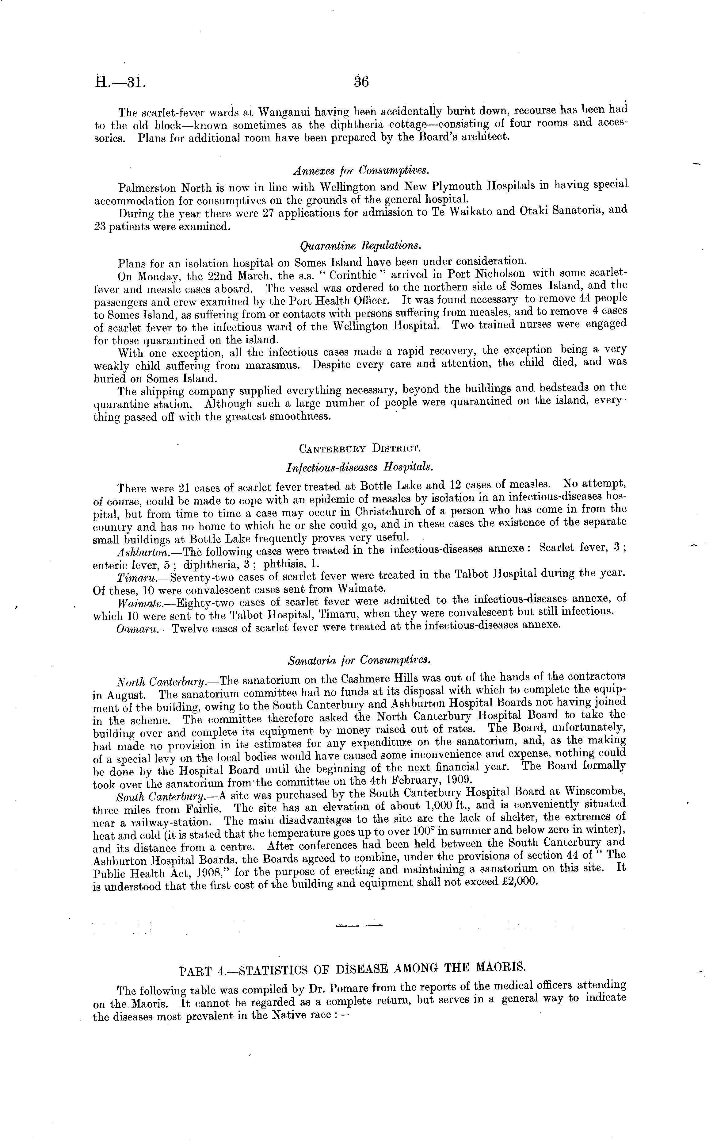 The scarlet-fever wards at Wanganui having been accidentally burnt down, recourse has been had to the old block—known sometimes as the diphtheria cottage—consisting of four rooms and accessories. Plans for additional room have been prepared by the Board's architect. Annexes for Consumptives. Palmerston North is now in line with Wellington and New Plymouth Hospitals in having special accommodation for consumptives on the grounds of the general hospital. During the year there were 27 applications for admission to Te Waikato and Otaki Sanatoria, and 23 patients were examined. Quarantine Regulations. Plans for an isolation hospital on Somes Island have been under consideration. On Monday, the 22nd March, the s.s. " Corinthic " arrived in Port Nicholson with some scarletfever and measle cases aboard. The vessel was ordered to the northern side of Somes Island, and the passengers and crew examined by the Port Health Officer. It was found necessary to remove 44 people to Somes Island, as suffering from or contacts with persons suffering from measles, and to remove 4 cases of scarlet fever to the infectious ward of the Wellington Hospital. Two trained nurses were engaged for those quarantined on the island. . . With one exception, all the infectious cases made a rapid recovery, the exception being a very weakly child suffering from marasmus. Despite every care and attention, the child died, and was buried on Somes Island. The shipping company supplied everything necessary, beyond the buildings and bedsteads on the quarantine station. Although such a large number of people were quarantined on the island, everything passed off with the greatest smoothness. Canterbury District. Infectious-diseases Hospitals. There were 21 cases of scarlet fever treated at Bottle Lake and 12 cases of measles. No attempt, of course, could be made to cope with an epidemic of measles by isolation in an infectious-diseases hospital but from time to time a case may occur in Christchurch of a person who has come in from the country and has no home to which he or she could go, and in these cases the existence of the separate small buildings at Bottle Lake frequently proves very useful. Ashburton.—The following cases were treated in the infectious-diseases annexe : Scarlet fever, 3 ; enteric fever, 5; diphtheria, 3; phthisis, 1. , . Timaru.— Seventy-two cases of scarlet fever were treated in the Talbot Hospital during the year. Of these, 10 were convalescent cases sent from Waimate. Waimate.— Eighty-two cases of scarlet fever were admitted to the infectious-diseases annexe, of which 10 were sent to the Talbot Hospital, Timaru, when they were convalescent but still infectious. Oamaru.— Twelve cases of scarlet fever were treated at the infectious-diseases annexe. Sanatoria for Consumptives. North Canterbury.—The sanatorium on the Cashmere Hills was out of the hands of the contractors in August The sanatorium committee had no funds at its disposal with which to complete the equipment of the building, owing to the South Canterbury and Ashburton Hospital Boards not having pined in the scheme The committee therefore asked the North Canterbury Hospital Board to take the building over and complete its equipment by money raised out of rates. The Board, unfortunately, had made no provision in its estimates for any expenditure on the sanatorium, and, as the making of a special levy on the local bodies would have caused some inconvenience and expense, nothing could be done by the Hospital Board until the beginning of the next financial year. The Board formally took over the sanatorium from-the committee on the 4th February, 1909. South Canterbury.—A site was purchased by the South Canterbury Hospital Board at Winscombe three miles from Fairlie. The site has an elevation of about 1,000 ft., and is conveniently situated near a railway-station. The main disadvantages to the site are the lack of shelter, the extremes of heat and cold (it is stated that the temperature goes up to over 100° in summer and below zero m winter), and its distance from a centre. After conferences had been held between the South Canterbury and Ashburton Hospital Boards, the Boards agreed to combine, under the provisions of section 44 of lhe Public Health Act, 1908," for the purpose of erecting and maintaining a sanatorium on this site. It is understood that the first cost of the building and equipment shall not exceed £2,000. PART 4.-STATISTICS OF DISEASE AMONG THE MAORIS. The following table was compiled by Dr. Pomare from the reports of the medical officers attending on the. Maoris. It cannot be regarded as a complete return, but serves in a general way to indicate the diseases most prevalent in the Native race : —