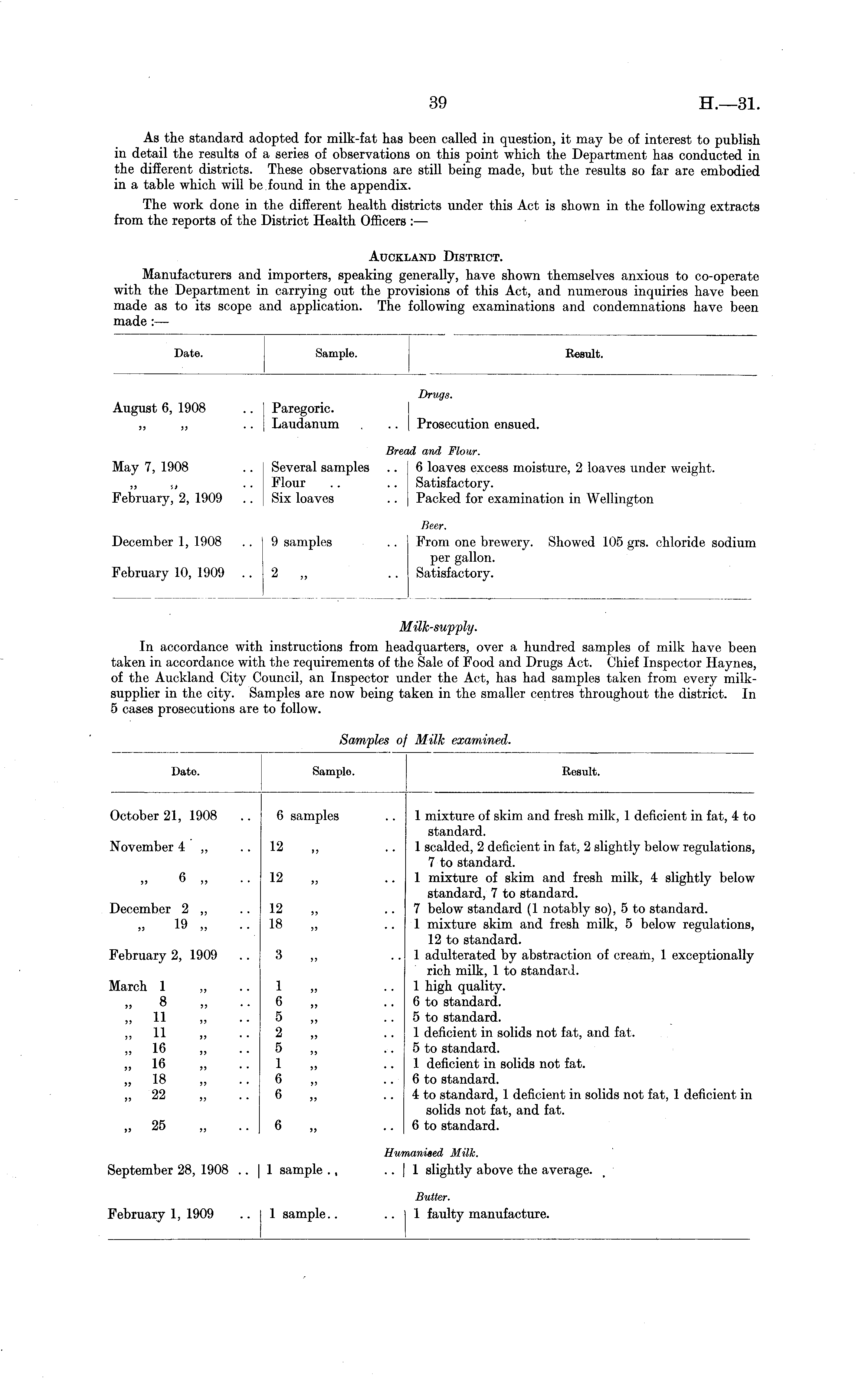 Date. Sample. Result. Drugs. August 6, 1908 Paregoric. Laudanum Prosecution ensued. May 1, 1908 1909 Several samples .. Flour Six loaves Bret ! and Flour. 6 loaves excess moisture, 2 loaves under weight. Satisfactory. Packed for examination in Wellington December 1, 1908 February 10, 1909 t 9 samples ..2 „ Rear. From one brewery. Showed 105 grs. chloride sodium per gallon. Satisfactory.