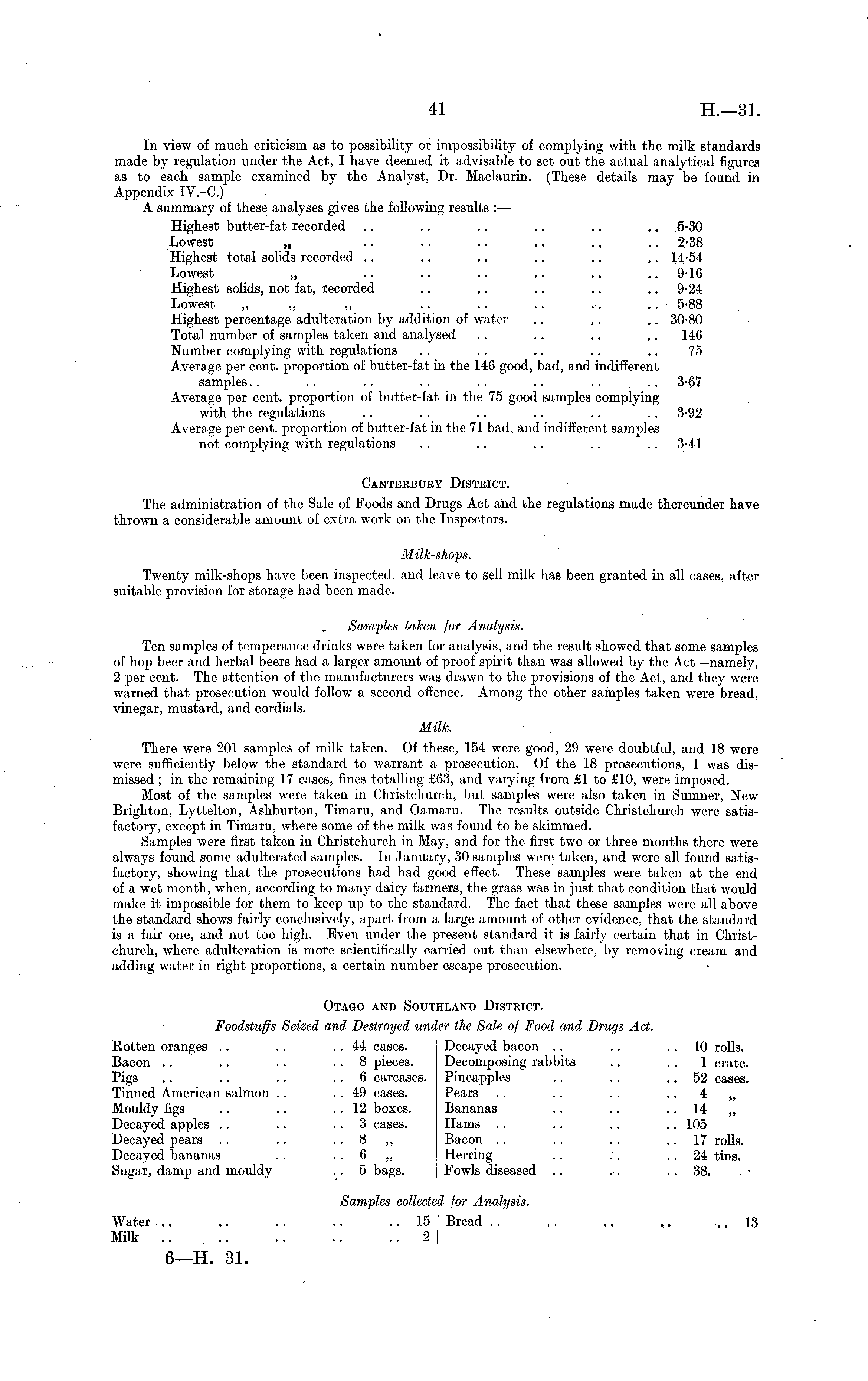 In view of much criticism as to possibility or impossibility of complying with the milk standards made by regulation under the Act, I have deemed it advisable to set out the actual analytical figures as to each sample examined by the Analyst, Dr. Maclaurin. (These details may be found in Appendix IV.-C.) A summary of these analyses gives the following results :— Highest butter-fat recorded . . .. .. .. .. .. 5-30 Lowest „ .. .. .. .. ~ .. 2-38 Highest total solids recorded .. .. .. .. .. .. 14-54 Lowest „ .. .. .. .. .. .. 9-16 Highest solids, not fat, recorded .. .. .. .. .. 9-24 Lowest ~ ~ ~ .. .. .. .. .. 5-88 Highest percentage adulteration by addition of water .. ~ .. 30-80 Total number of samples taken and analysed .. .. ~ .. 146 Number complying with regulations .. . . .. .. .. 75 Average per cent, proportion of butter-fat in the 146 good, bad, and indifferent samples.. . . .. .. .. . . .. .. 3-67 Average per cent, proportion of butter-fat in the 75 good samples complying with the regulations . . . . .. .. .. .. 3-92 Average per cent, proportion of butter-fat in the 71 bad, and indifferent samples not complying with regulations .. . . .. .. .. 3-41 Canterbury District. The administration of the Sale of Foods and Drugs Act and the regulations made thereunder have thrown a considerable amount of extra work on the Inspectors. Milk-shops. Twenty milk-shops have been inspected, and leave to sell milk has been granted in all cases, after suitable provision for storage had been made. Samples taken for Analysis. Ten samples of temperance drinks were taken for analysis, and the result showed that some samples of hop beer and herbal beers had a larger amount of proof spirit than was allowed by the Act—namely, 2 per cent. The attention of the manufacturers was drawn to the provisions of the Act, and they were warned that prosecution would follow a second offence. Among the other samples taken were bread, vinegar, mustard, and cordials. Milk. There were 201 samples of milk taken. Of these, 154 were good, 29 were doubtful, and 18 were were sufficiently below the standard to warrant a prosecution. Of the 18 prosecutions, 1 was dismissed ; in the remaining 17 cases, fines totalling £63, and varying from £1 to £10, were imposed. Most of the samples were taken in Christchurch, but samples were also taken in Sumner, New Brighton, Lyttelton, Ashburton, Timaru, and Oamaru. The results outside Christchurch were satisfactory, except in Timaru, where some of the milk was found to be skimmed. Samples were first taken in Christchurch in May, and for the first two or three months there were always found some adulterated samples. In January, 30 samples were taken, and were all found satisfactory, showing that the prosecutions had had good effect. These samples were taken at the end of a wet month, when, according to many dairy farmers, the grass was in just that condition that would make it impossible for them to keep up to the standard. The fact that these samples were all above the standard shows fairly conclusively, apart from a large amount of other evidence, that the standard is a fair one, and not too high. Even under the present standard it is fairly certain that in Christchurch, where adulteration is more scientifically carried out than elsewhere, by removing cream and adding water in right proportions, a certain number escape prosecution. Otago and Southland District. Foodstuffs Seized and Destroyed under the Sale of Food and Drugs Act. Rotten oranges . . . . . . 44 cases. Decayed bacon . . . . 10 rolls. Bacon .. .. .. .. 8 pieces. Decomposing rabbits .. .. 1 crate. Pigs .. .. .. . . 6 carcases. Pineapples .. .. .. 52 cases. Tinned American salmon .. .. 49 cases. Pears .. .. .. .. 4 ~ Mouldy figs .. .. .. 12 boxes. Bananas .. .. .. 14 ~ Decayed apples .. .. .. 3 cases. Hams . . .. . . .. 105 Decayed pears . . .. ... 8 „ Bacon . . . . .. 17 rolls. Decayed bananas .. . . 6 ~ Herring .. .. .. 24 tins. Sugar, damp and mouldy .. 5 bags. Fowls diseased .. .. .. 38. Samples collected for Analysis. Water .. .. .. . . .. 15 | Bread .. .. .. .. .. 13 Milk .. .. .. .. .. 2 |