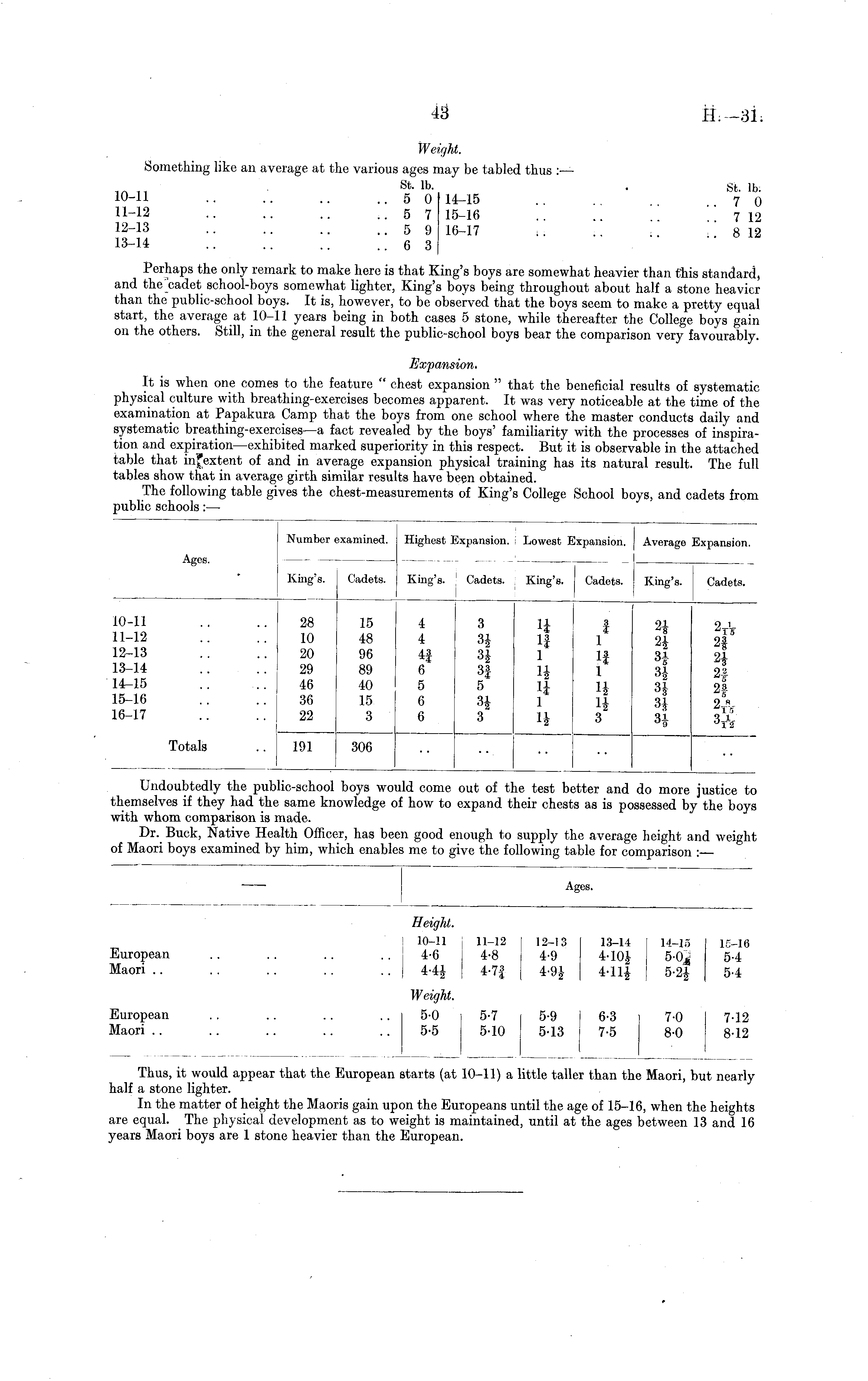 Thus, it would appear that the European starts (at 10-11) a little taller than the Maori, but nearly half a stone lighter. In the matter of height the Maoris gain upon the Europeans until the age of 15-16, when the heights are equal. The physical development as to weight is maintained, until at the ages between 13 and 16 years Maori boys are 1 stone heavier than the European.