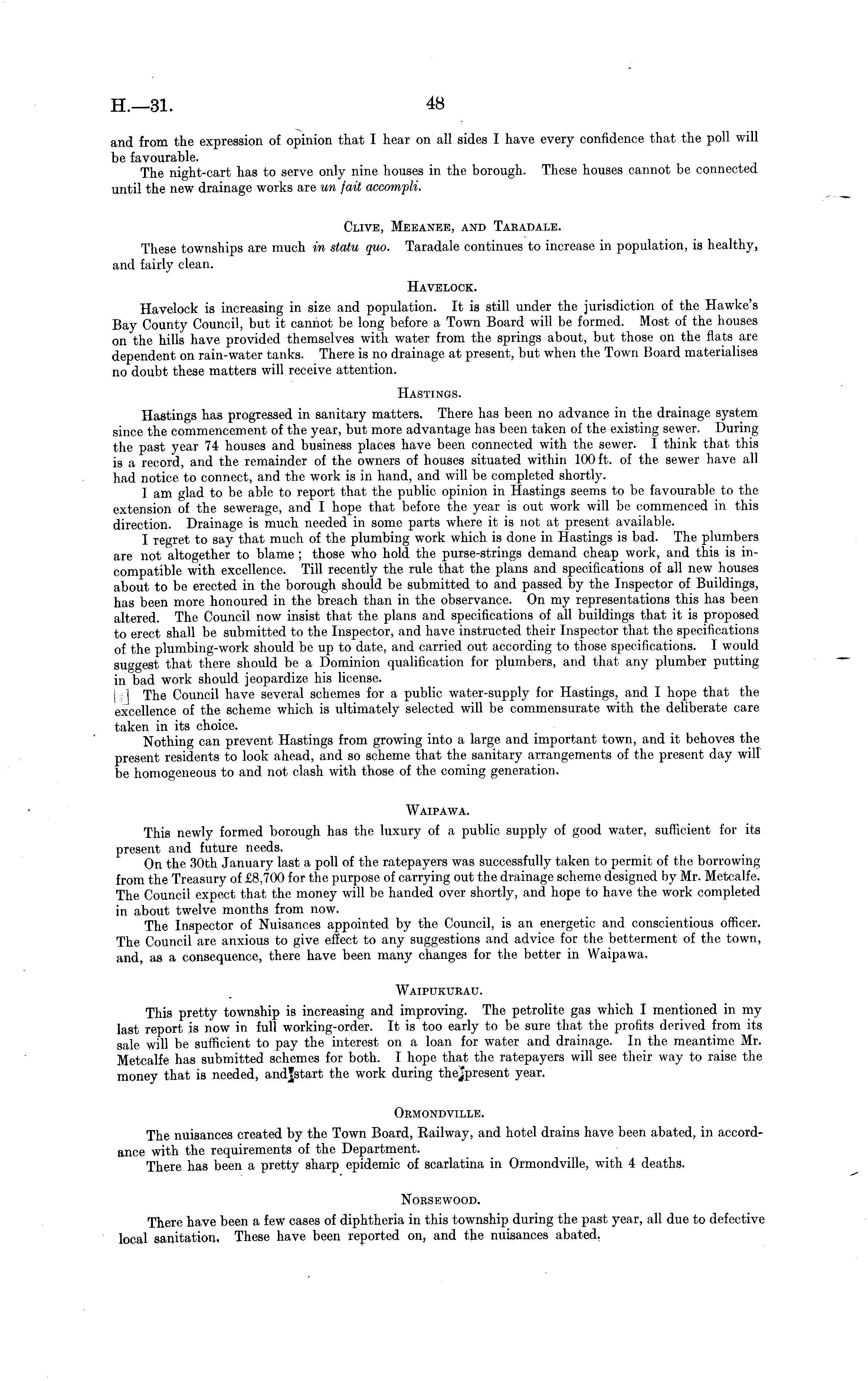 and from the expression of opinion that I hear on all sides I have every confidence that the poll will be favourable. The night-cart has to serve only nine houses in the borough. These houses cannot be connected until the new drainage works are un fait accompli. Clive, Meeanee, and Taradale. These townships are much in statu quo. Taradale continues to increase in population, is healthy, and fairly clean. Havelock. Havelock is increasing in size and population. It is still under the jurisdiction of the Hawke's Bay County Council, but it cannot be long before a Town Board will be formed. Most of the houses on the hills have provided themselves with water from the springs about, but those on the flats are dependent on rain-water tanks. There is no drainage at present, but when the Town Board materialises no doubt these matters will receive attention. Hastings. Hastings has progressed in sanitary matters. There has been no advance in the drainage system since the commencement of the year, but more advantage has been taken of the existing sewer. During the past year 74 houses and business places have been connected with the sewer. I think that this is a record, and the remainder of the owners of houses situated within 100 ft. of the sewer have all had notice to connect, and the work is in hand, and will be completed shortly. I am glad to be able to report that the public opinion in Hastings seems to be favourable to the extension of the sewerage, and I hope that before the year is out work will be commenced in this direction. Drainage is much needed in some parts where it is not at present available. I regret to say that much of the plumbing work which is done in Hastings is bad. The plumbers are not altogether to blame ; those who hold the purse-strings demand cheap work, and this is incompatible with excellence. Till recently the rule that the plans and specifications of all new houses about to be erected in the borough should be submitted to and passed by the Inspector of Buildings, has been more honoured in the breach than in the observance. On my representations this has been altered. The Council now insist that the plans and specifications of all buildings that it is proposed to erect shall be submitted to the Inspector, and have instructed their Inspector that the specifications of the plumbing-work should be up to date, and carried out according to those specifications. I would suggest that there should be a Dominion qualification for plumbers, and that any plumber putting in bad work should jeopardize his license. j | The Council have several schemes for a public water-supply for Hastings, and I hope that the excellence of the scheme which is ultimately selected will be commensurate with the deliberate care taken in its choice. Nothing can prevent Hastings from growing into a large and important town, and it behoves the present residents to look ahead, and so scheme that the sanitary arrangements of the present day will be homogeneous to and not clash with those of the coming generation. Waipawa. This newly formed borough has the luxury of a public supply of good water, sufficient for its present and future needs. On the 30th January last a poll of the ratepayers was successfully taken to permit of the borrowing from the Treasury of £8,700 for the purpose of carrying out the drainage scheme designed by Mr. Metcalfe. The Council expect that the money will be handed over shortly, and hope to have the work completed in about twelve months from now. The Inspector of Nuisances appointed by the Council, is an energetic and conscientious officer. The Council are anxious to give effect to any suggestions and advice for the betterment of the town, and, as a consequence, there have been many changes for the better in Waipawa, Waipukurau. This pretty township is increasing and improving. The petrolite gas which I mentioned in my last report is now in full working-order. It is too early to be sure that the profits derived from its sale will be sufficient to pay the interest on a loan for water and drainage. In the meantime Mr. Metcalfe has submitted schemes for both. I hope that the ratepayers will see their way to raise the money that is needed, and]start the work during thejpresent year. Ormondville. The nuisances created by the Town Board, Railway, and hotel drains have been abated, in accordance with the requirements of the Department. There has been a pretty sharp epidemic of scarlatina in Ormondville, with 4 deaths. Norsewood. There have been a few cases of diphtheria in this township during the past year, all due to defective local sanitation. These have been reported on, and the nuisances abated.