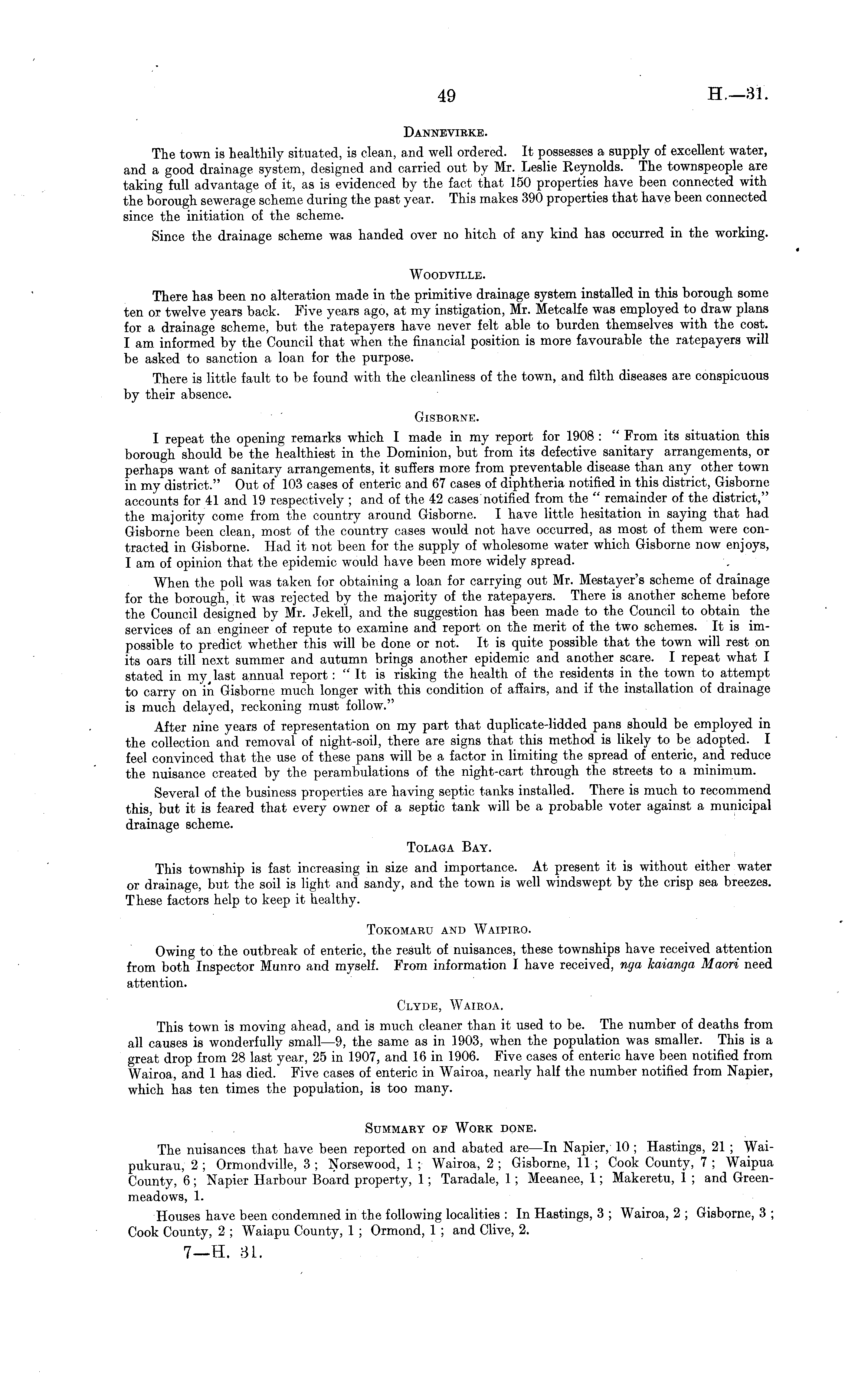 Dannevirke. The town is healthily situated, is clean, and well ordered. It possesses a supply of excellent water, and a good drainage system, designed and carried out by Mr. Leslie Reynolds. The townspeople are taking full advantage of it, as is evidenced by the fact that 150 properties have been connected with the borough sewerage scheme during the past year. This makes 390 properties that have been connected since the initiation of the scheme. Since the drainage scheme was handed over no hitch of any kind has occurred in the working. Woodville. There has been no alteration made in the primitive drainage system installed in this borough some ten or twelve years back. Five years ago, at my instigation, Mr. Metcalfe was employed to draw plans for a drainage scheme, but the ratepayers have never felt able to burden themselves with the cost. I am informed by the Council that when the financial position is more favourable the ratepayers will be asked to sanction a loan for the purpose. There is little fault to be found with the cleanliness of the town, and filth diseases are conspicuous by their absence. Gisborne. I repeat the opening remarks which I made in my report for 1908 : " From its situation this borough should be the healthiest in the Dominion, but from its defective sanitary arrangements, or perhaps want of sanitary arrangements, it suffers more from preventable disease than any other town in my district." Out of 103 cases of enteric and 67 cases of diphtheria notified in this district, Gisborne accounts for 41 and 19 respectively ; and of the 42 cases notified from the " remainder of the district," the majority come from the country around Gisborne. I have little hesitation in saying that had Gisborne been clean, most of the country cases would not have occurred, as most of them were contracted in Gisborne. Had it not been for the supply of wholesome water which Gisborne now enjoys, I am of opinion that the epidemic would have been more widely spread. When the poll was taken for obtaining a loan for carrying out Mr. Mestayer's scheme of drainage for the borough, it was rejected by the majority of the ratepayers. There is another scheme before the Council designed by Mr. Jekell, and the suggestion has been made to the Council to obtain the services of an engineer of repute to examine and report on the merit of the two schemes. It is impossible to predict whether this will be done or not. It is quite possible that the town will rest on its oars till next summer and autumn brings another epidemic and another scare. I repeat what I stated in my, last annual report: "It is risking the health of the residents in the town to attempt to carry on in Gisborne much longer with this condition of affairs, and if the installation of drainage is much delayed, reckoning must follow." After nine years of representation on my part that duplicate-lidded pans should be employed in the collection and removal of night-soil, there are signs that this method is likely to be adopted. I feel convinced that the use of these pans will be a factor in limiting the spread of enteric, and reduce the nuisance created by the perambulations of the night-cart through the streets to a minimum. Several of the business properties are having septic tanks installed. There is much to recommend this, but it is feared that every owner of a septic tank will be a probable voter against a municipal drainage scheme. Tolaga Bay. This township is fast increasing in size and importance. At present it is without either water or drainage, but the soil is light and sandy, and the town is well windswept by the crisp sea breezes. These factors help to keep it healthy. Tokomaru and Waipiro. Owing to the outbreak of enteric, the result of nuisances, these townships have received attention from both Inspector Munro and myself. From information I have received, nga kaianga Maori need attention. Clyde, Wairoa. This town is moving ahead, and is much cleaner than it used to be. The number of deaths from all causes is wonderfully small—9, the same as in 1903, when the population was smaller. This is a great drop from 28 last year, 25 in 1907, and 16 in 1906. Five cases of enteric have been notified from Wairoa, and 1 has died. Five cases of enteric in Wairoa, nearly half the number notified from Napier, which has ten times the population, is too many. Summary op Work done. The nuisances that have been reported on and abated are —In Napier, 10 ; Hastings, 21 ; Waipukurau, 2; Ormondville, 3; Norsewood, 1; Wairoa, 2; Gisborne, 11; Cook County, 7; Waipua County, 6; Napier Harbour Board property, 1; Taradale, 1; Meeanee, 1; Makeretu, 1 ; and Greenmeadows, 1. Houses have been condemned in the following localities : In Hastings, 3 ; Wairoa, 2 ; Gisborne, 3 ; Cook County, 2 ; Waiapu County, 1 ; Ormond, 1 ; and Clive, 2.