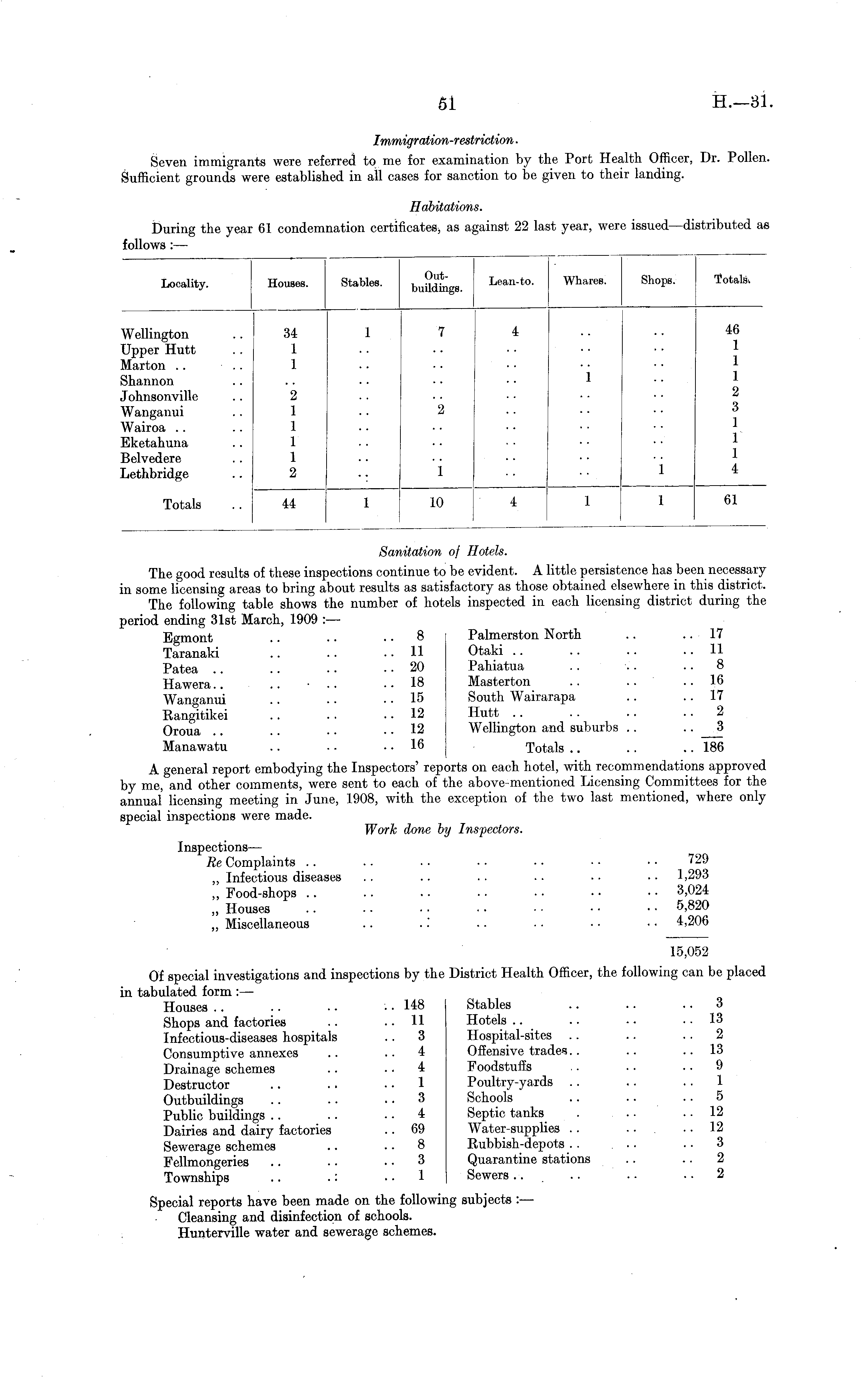 Sanitation of Hotels. The good results of these inspections continue to be evident. A little persistence has been necessary in some licensing areas to bring about results as satisfactory as those obtained elsewhere in this district. The following table shows the number of hotels inspected in each licensing district during the period ending 31st March, 1909 : — Egmont .. • • .. 8 Palmerston North .. 17 Taranaki .. .. ..11 Otaki .. .. .. ..11 Patea .. .. .. .. 20 Pahiatua . . .. .. 8 Hawera.. .. • .. ..18 Masterton .. .. ..16 Wanganui .. •. .. 15 South Wairarapa .. .. 17 Rangitikei .. .. .. 12 Hutt .. .. .. .. 2 Oroua .. .. • • 12 Wellington and suburbs .. .. 3 Manawatu .. .. .. 16 Totals .. .. .. 186 A general report embodying the Inspectors' reports on each hotel, with recommendations approved by me, and other comments, were sent to each of the above-mentioned Licensing Committees for the annual licensing meeting in June, 1908, with the exception of the two last mentioned, where only special inspections were made. Work done by Inspectors. Inspections— Re Complaints .. .. • • • • • • • • • • 729 ~ Infectious diseases .. .. .. . • • • • • 1,293 „ Food-shops .. .. .. . • • • • • • • 3,024 „ Houses ' ■ •• 5 , 8 20 „ Miscellaneous .. ..* • • • • • • 4,206 15,052 Of special investigations and inspections by the District Health Officer, the following can be placed in tabulated form : — Houses .. .. • ■ .. 148 Stables .. .. .. 3 Shops and factories .. .. 11 Hotels .. .. .. .. 13 Infectious-diseases hospitals .. 3 Hospital-sites .. .. .. 2 Consumptive annexes .. .. 4 Offensive trades.. .. ..13 Drainage schemes .. .. 4 Foodstuffs .. .. .. 9 Destructor .. .. .. 1 Poultry-yards .. .. . . 1 Outbuildings .. .. ..3 Schools .. .. ..5 Public buildings .. .. .. 4 Septic tanks . ... .. 12 Dairies and dairy factories .. 69 Water-supplies . . ... .. 12 Sewerage schemes .. ..8 Rubbish-depots.. ... .. 3 Fellmongeries .. .. .. 3 Quarantine stations .. .. 2 Townships .. .: .. 1 Sewers ... .. .. ■ • 2 Special reports have been made on the following subjects : — Cleansing and disinfection of schools. Hunterville water and sewerage schemes.