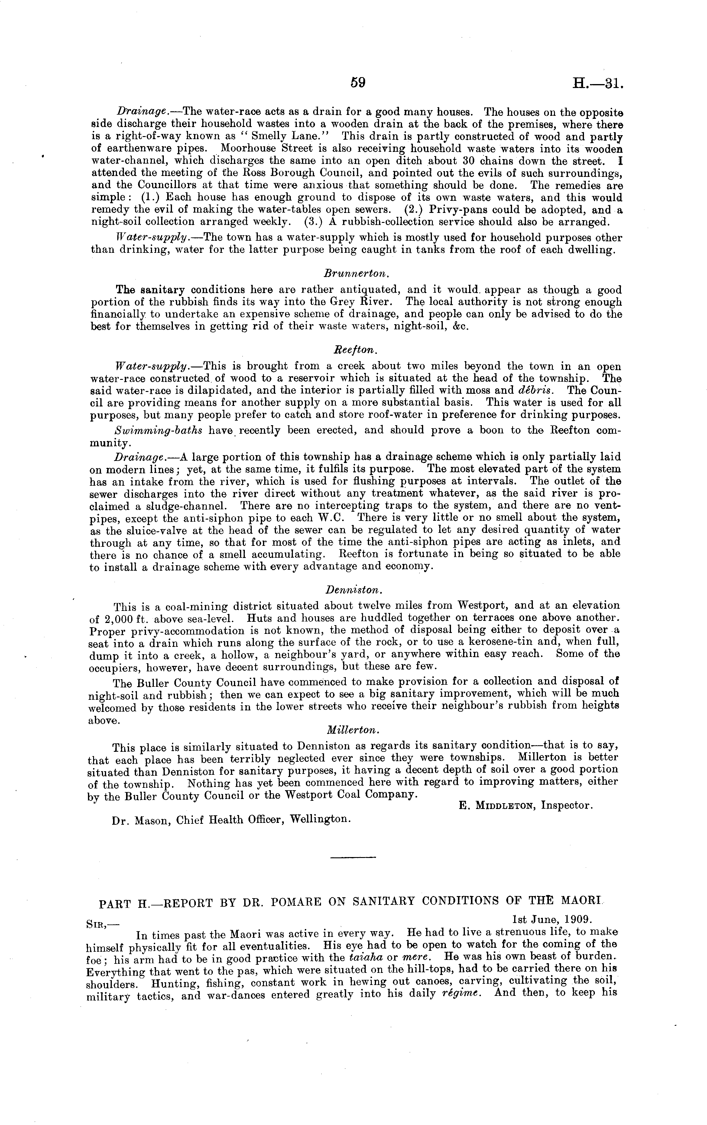 Drainage. —The water-race acts as a drain for a good many houses. The houses on the opposite side discharge their household wastes into a wooden drain at the back of the premises, where there is a right-of-way known as " Smelly Lane." This drain is partly constructed of wood and partly of earthenware pipes. Moor-house Street is also receiving household waste waters into its wooden water-channel, which discharges the same into an open ditch about 30 chains down the street. I attended the meeting of the Ross Borough Council, and pointed out the evils of such surroundings, and the Councillors at that time were anxious that something should be done. The remedies are simple: (1.) Each house has enough ground to dispose of its own waste waters, and this would remedy the evil of making the water-tables open sewers. (2.) Privy-pans could be adopted, and a night-soil collection arranged weekly. (3.) A rubbish-collection service should also be arranged. Water-supply. —The town has a water-supply which is mostly used for household purposes other than drinking, water for the latter purpose being caught in tanks from the roof of each dwelling. Brunnerton. The sanitary conditions here are rather antiquated, and it would appear as though a good portion of the rubbish finds its way into the Grey River. The local authority is not strong enough financially to undertake an expensive scheme of drainage, and people can only be advised to do the best for themselves in getting rid of their waste waters, night-soil, &c. Reef ton. Water-supply. —This is brought from a creek about two miles beyond the town in an open water-race constructed, of wood to a reservoir which is situated at the head of the township. The said water-race is dilapidated, and the interior is partially filled with moss and debris. The Council are providing means for another supply on a more substantial basis. This water is used for all purposes, but many people prefer to catch and store roof-water in preference for drinking purposes. Swimming-baths have recently been erected, and should prove a boon to the Reef ton community. Drainage. —A large portion of this township has a drainage scheme which is only partially laid on modern lines; yet, at the same time, it fulfils its purpose. The most elevated part of the system has an intake from the river, which is used for flushing purposes at intervals. The outlet of the sewer discharges into the river direct without any treatment whatever, as the said river is proclaimed a sludge-channel. There are no intercepting traps to the system, and there are no ventpipes, except the anti-siphon pipe to each W.C. There is very little or no smell about the system, as the sluice-valve at the head of the sewer can be regulated to let any desired quantity of water through at any time, so that for most of the time the anti-siphon pipes are acting as inlets, and there is no chance of a smell accumulating. Reefton is fortunate in being so situated to be able to install a drainage scheme with every advantage and economy. Denniston. This is a coal-mining district situated about twelve miles from Westport, and at an elevation of 2,000 ft. above sea-level. Huts and houses are huddled together on terraces one above another. Proper privy-accommodation is not known, the method of disposal being either to deposit over a seat into a drain which runs along the surface of the rock, or to use a kerosene-tin and, when full, dump it into a creek, a hollow, a neighbour's yard, or anywhere within easy reach. Some of the occupiers, however, have decent surroundings, but these are few. The Buller County Council have commenced to make provision for a collection and disposal of night-soil and rubbish; then we can expect to see a big sanitary improvement, which will be much welcomed by those residents in the lower streets who receive their neighbour's rubbish from heights above. Millerton. This place is similarly situated to Denniston as regards its sanitary condition—that is to say, that each place has been terribly neglected ever since they were townships. Millerton is better situated than Denniston for sanitary purposes, it having a decent depth of soil over a good portion of the township. Nothing has yet been commenced here with regard to improving matters, either by the Buller County Council or the Westport Coal Company. E. Middleton, Inspector. Dr. Mason, Chief Health Officer, Wellington. PART H.—REPORT BY DR. POMARE ON SANITARY CONDITIONS OF THE MAORI a Ist June, 1909. In times past the Maori was active in every way. He had to live a strenuous life, to make himself physically fit for all eventualities. His eye had to be open to watch for the coming of the foe' his arm had to be in good practice with the iaiaha or mere. He was his own beast of burden. Everything that went to the pas, which were situated on the hill-tops, had to be carried there on his shoulders. Hunting, fishing, constant work in hewing out canoes, carving, cultivating the soil, military tactics, and war-dances entered greatly into his daily regime. And then, to keep his