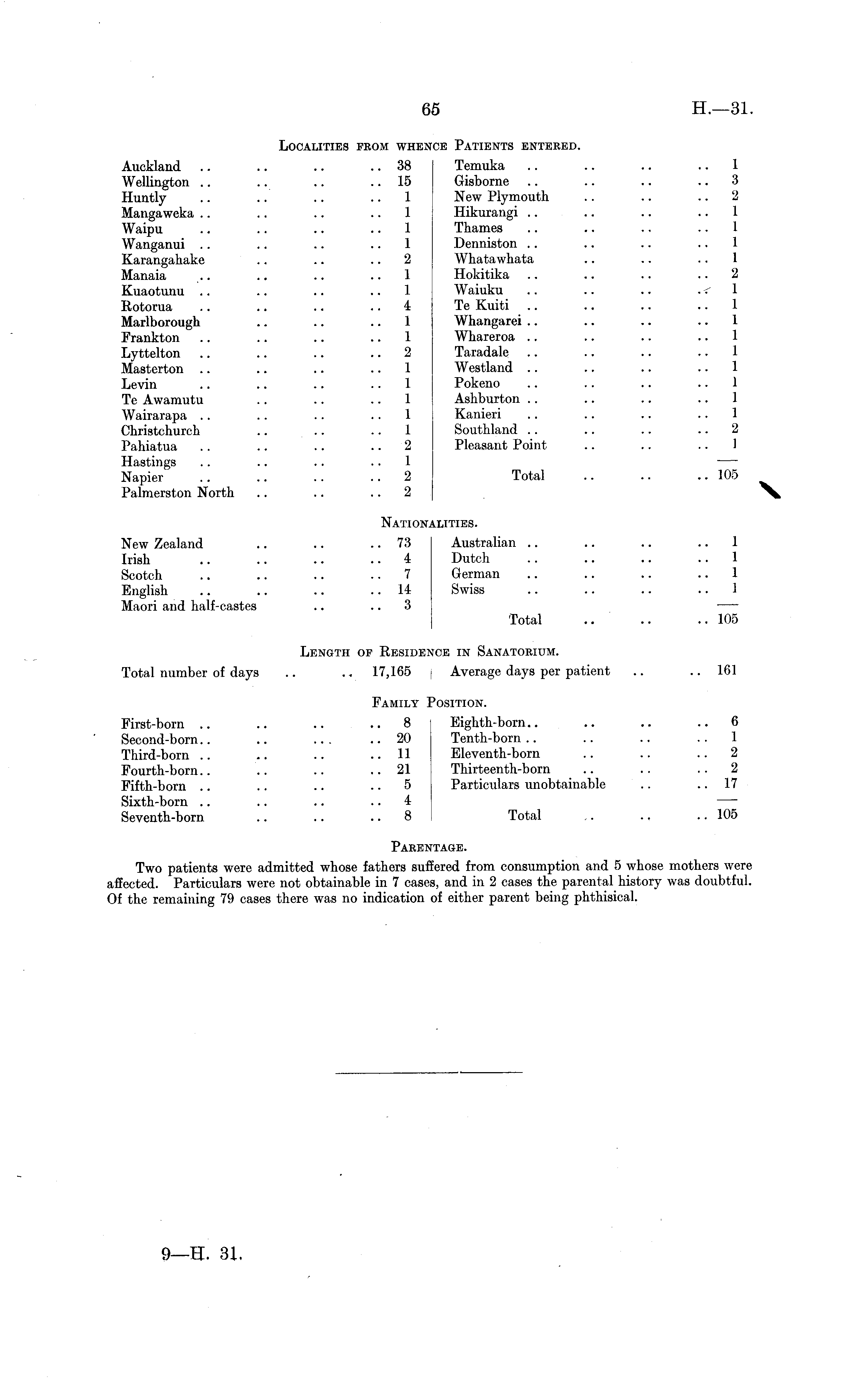 Localities from whence Patients entered. Auckland .. .. .. .. 38 Temuka .. .. .. .. 1 Wellington .. .. .. .. 15 Gisborne .. .. .. .. 3 Huntly .. .. .. ..1 New Plymouth .. .. ..2 Mangaweka .. .. .. .. 1 Hikurangi .. .. .. .. 1 Waipu .. .. .. 1 Thames .. .. .. .. 1 Wanganui .. .. .. .. 1 Denniston .. .. .. .. 1 Karangahake .. .. .. 2 Whatawhata .. .. .. 1 Manaia ... .. .. .. 1 Hokitika .. .. .. .. 2 Kuaotunu .. .. .. .. 1 Waiuku .. .. .. . < 1 Rotorua .. .. .. .. 4 Te Kuiti .. .. .. .. 1 Marlborough .. .. .. 1 Whangarei .. .. .. .. 1 Frankton .. .. .. .. 1 Whareroa .. .. .. .. 1 Lyttelton .. .. .. .. 2 Taradale .. .. .. .. 1 Masterton .. .. .. .. 1 Westland .. .. .. .. 1 Levin .. .. .. .. 1 Pokeno .. .. .. .. 1 Te Awamutu .. .. .. 1 Ashburton .. .. .. .. 1 Wairarapa .. .. .. .. 1 Kanieri .. .. .. .. 1 Christchurch .. .. .. 1 Southland .. .. .. .. 2 Pahiatua .. .. .. .. 2 Pleasant Point .. .. .. 1 Hastings .. .. .. .. 1 Napier .. .. .. ..2 Total .. .. ..105 Palmerston North .. .. .. 2 Nationalities. New Zealand .. .. .. 73 Australian .. .. .. .. 1 Irish .. .. .. ..4 Dutch .. .. .. ..1 Scotch .. .. .. .. 7 German .. .. .. .. 1 English .. .. .. .. 14 Swiss .. .. .. .. 1 Maori and half-castes .. .. 3 Total 105 Length of Residence in Sanatorium. Total number of days .. .. 17,165 | Average days per patient .. ..161 Family Position. First-born .. .. .. .. 8 Eighth-born.. .. .. .. 6 Second-born.. .. ... ..20 Tenth-born.. .. .. ..1 Third-born .. .. .. .. 11 Eleventh-born .. .. .. 2 Fourth-born.. .. .. ..21 Thirteenth-born .. .. ..2 Fifth-born .. .. .. .. 5 Particulars unobtainable .. 17 Sixth-born .. .. .. .. 4 Seventh-born .. .. ..8 Total ~ .. ..105 Parentage. Two patients were admitted whose fathers suffered from consumption and 5 whose mothers were affected. Particulars were not obtainable in 7 cases, and in 2 cases the parental history was doubtful. Of the remaining 79 cases there was no indication of either parent being phthisical.