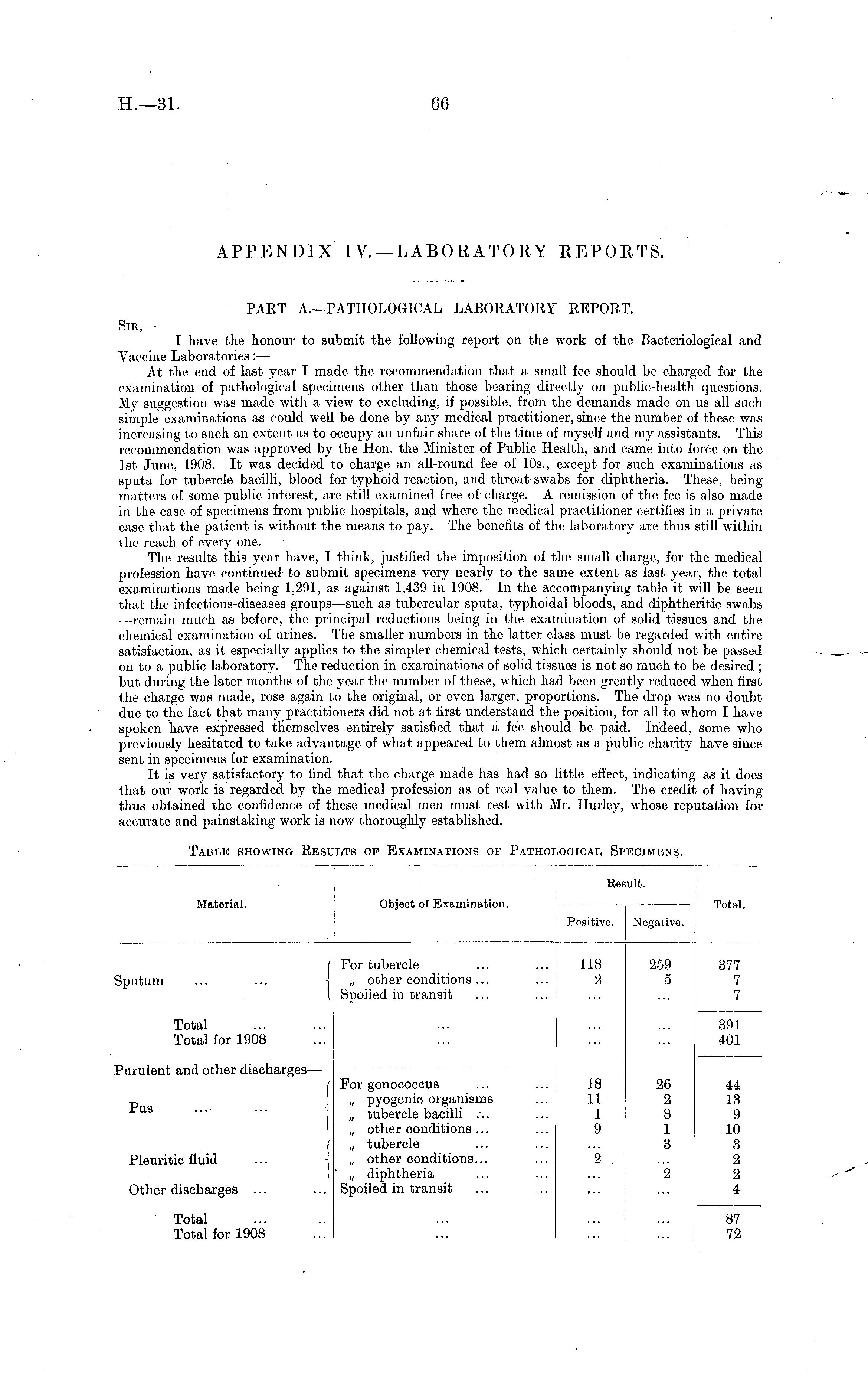 PART A.—PATHOLOGICAL LABORATORY REPORT. Sir — I have the honour to submit the following report on the work of the Bacteriological and Vaccine Laboratories: — At the end of last year I made the recommendation that a small fee should be charged for the examination of pathological specimens other than those bearing directly on public-health questions. My suggestion was made with a view to excluding, if possible, from the demands made on us all such simple examinations as could well be done by any medical practitioner, since the number of these was increasing to such an extent as to occupy an unfair share of the time of myself and my assistants. This recommendation was approved by the Hon. the Minister of Public Health, and came into force on the Ist June, 1908. It was decided to charge an all-round fee of 10s., except for such examinations as sputa for tubercle bacilli, blood for typhoid reaction, and throat-swabs for diphtheria. These, being matters of some public interest, are still examined free of charge. A remission of the fee is also made in the case of specimens from public hospitals, and where the medical practitioner certifies in a private case that the patient is without the means to pay. The benefits of the laboratory are thus still within the reach of every one. The results this year have, I think, justified the imposition of the small charge, for the medical profession have continued to submit specimens very nearly to the same extent as last year, the total examinations made being 1,291, as against 1,439 in 1908. In the accompanying table it will be seen that the infectious-diseases groups —such as tubercular sputa, typhoidal bloods, and diphtheritic swabs remain much as before, the principal reductions being in the examination of solid tissues and the chemical examination of urines. The smaller numbers in the latter class must be regarded with entire satisfaction, as it especially applies to the simpler chemical tests, which certainly should not be passed on to a public laboratory. The reduction in examinations of solid tissues is not so much to be desired ; but during the later months of the year the number of these, which had been greatly reduced when first the charge was made, rose again to the original, or even larger, proportions. The drop was no doubt due to the fact that many practitioners did not at first understand the position, for all to whom I have spoken have expressed themselves entirely satisfied that a fee should be paid. Indeed, some who previously hesitated to take advantage of what appeared to them almost as a public charity have since sent in specimens for examination. It is very satisfactory to find that the charge made has had so little effect, indicating as it does that our work is regarded by the medical profession as of real value to them. The credit of having thus obtained the confidence of these medical men must rest with Mr. Hurley, whose reputation for accurate and painstaking work is now thoroughly established.