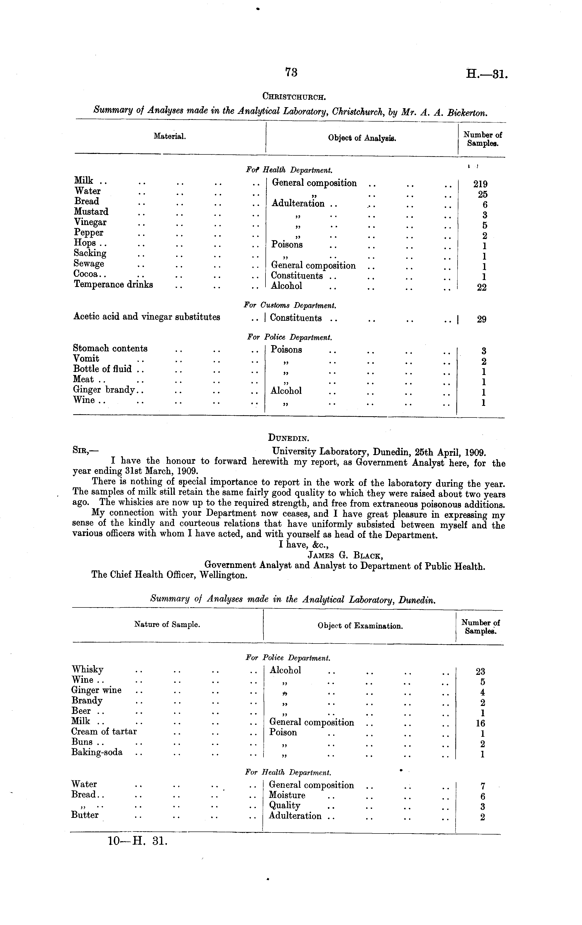 Dunedin. Sir, — University Laboratory, Dunedin, 25th April, 1909. I have the honour to forward herewith my report, as Government Analyst here, for the year ending 31st March, 1909. There is nothing of special importance to report in the work of the laboratory during the year. The samples of milk still retain the same fairly good quality to which they were raised about two years ago. The whiskies are now up to the required strength, and free from extraneous poisonous additions. My connection with your Department now ceases, and I have great pleasure in expressing my sense of the kindly and courteous relations that have uniformly subsisted between myself and the various officers with whom I have acted, and with yourself as head of the Department. I have, &c, James G. Black, Government Analyst and Analyst to Department of Public Health. The Chief Health Officer, Wellington.