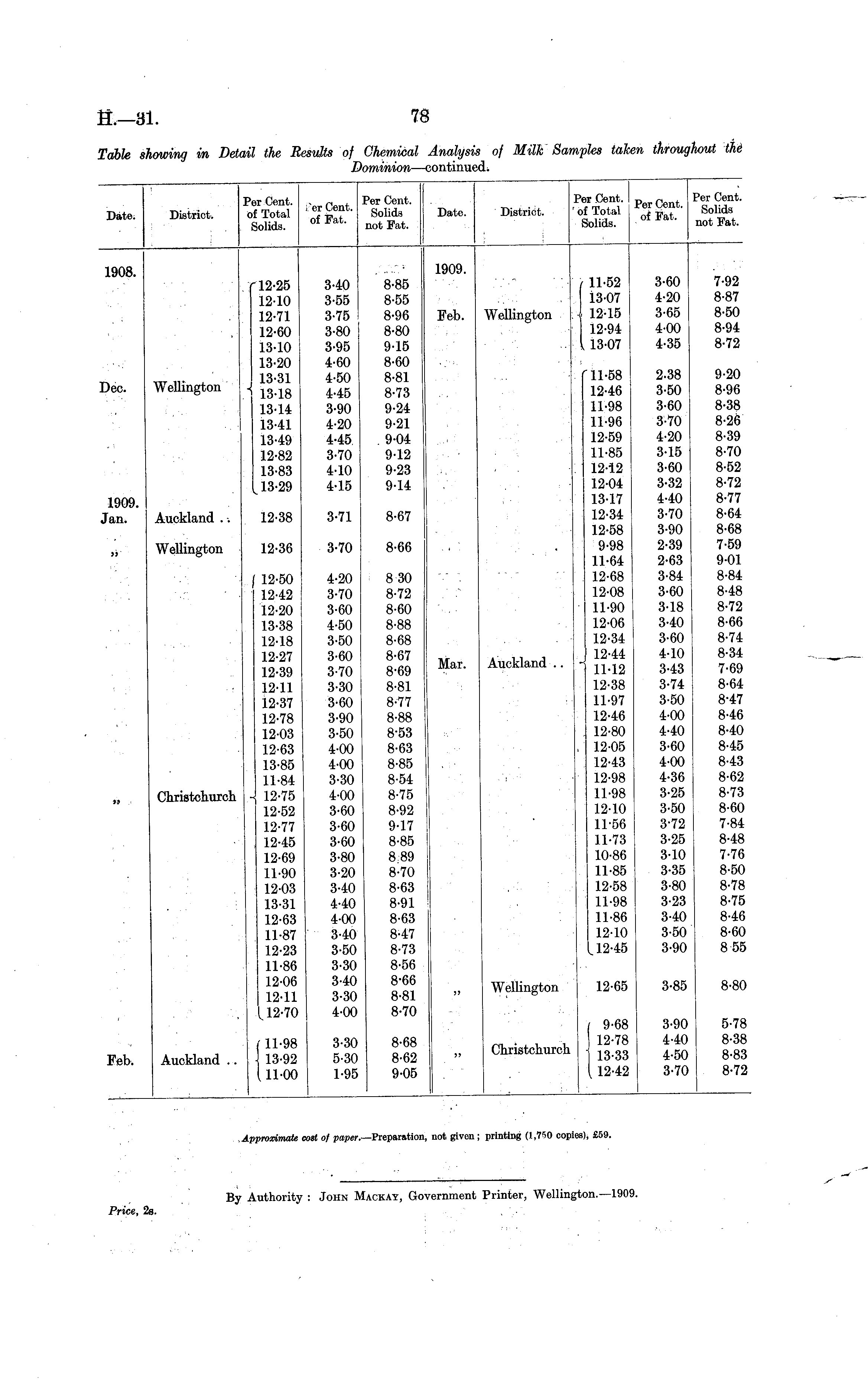 Date. District. Per Cent, of Total Solids. .~er Cent. of Fat. Per Cent. Solids not Fat. Date. District. Per Cent. ' of Total Solids. Per Cent, of Fat. Per Cent. Solids not Fat. 1908. 8-85 8-55 8-96 8-80 9-15 8-60 8-81 8-73 9-24 9-21 9-04 9-12 9-23 9-14 1909. 3-60 4-20 3-65 4-00 4-35 7-92 8-87 8-50 8-94 8-72 12-25 12-10 12-71 12-60 13-10 13-20 13-31 13-18 13-14 13-41 13-49 12-82 13-83 13-29 3-40 3-55 3-75 3-80 3-95 4-60 4-50 4-45 3-90 4-20 4-45 3-70 4-10 4-15 Feb. Wellington j 11-52 13-07 . 12-15 12-94 \ 13-07 Dec. 1909. Jan. » Wellington Auckland .. Wellington 12-38 12-36 ( 12-50 12-42 12-20 13-38 12-18 12-27 12-39 12-11 12-37 12-78 12-03 12-63 13-85 11-84 12-75 12-52 12-77 12-45 12-69 11-90 12-03 13-31 12-63 11-87 12-23 11-86 12-06 12-11 { 12-70 3-71 3-70 4-20 3-70 3-60 4-50 3-50 3-60 3-70 3-30 3-60 3-90 3-50 4-00 4-00 3-30 4-00 3-60 3-60 3-60 3-80 3-20 3-40 4-40 4-00 3-40 3-50 3-30 3-40 3-30 4-00 8-67 8-66 8 30 8-72 8-60 8-88 8-68 8-67 8-69 8-81 8-77 8-88 8-53 8-63 8-85 8-54 8-75 8-92 9-17 8-85 8 89 8-70 8-63 8-91 8-63 8-47 8-73 8-56 8-66 8-81 8-70 Mar. Auckland .. f 11-58 12-46 11-98 11-96 12-59 11-85 12-12 12-04 13-17 12-34 12-58 9-98 11-64 12-68 12-08 11-90 12-06 12-34 J 12-44 11-12 12-38 11-97 12-46 . 12-80 , 12-05 12-43 12-98 11-98 12-10 11-56 11-73 10-86 11-85 12-58 11-98 11-86 12-10 112-45 2-38 3-50 3-60 3-70 4-20 3-15 3-60 3-32 4-40 3-70 3-90 2-39 2-63 3-84 3-60 3-18 3-40 3-60 4-10 3-43 3-74 3-50 4-00 4-40 3-60 4-00 4-36 3-25 3-50 3-72 3-25 3-10 3-35 3-80 3-23 3-40 3-50 3-90 9-20 8-96 8-38 8-26 8-39 8-70 8-52 8-72 8-77 8-64 8-68 7-59 9-01 8-84 8-48 8-72 8-66 8-74 8-34 7-69 8-64 8-47 8-46 8-40 8-45 8-43 8-62 8-73 8-60 7-84 8-48 7-76 8-50 8-78 8-75 8-46 8-60 8 55 ,, Christchurch Wellington 12-65 3-85 8-80 >J I 11-98 13-92 (11-00 3-30 5-30 1-95 8-68 8-62 9-05 Christchurch / 9-68 12-78 13-33 1 12-42 3-90 4-40 4-50 3-70 5-78 8-38 8-83 8-72 Feb. Auckland .. ■>■>