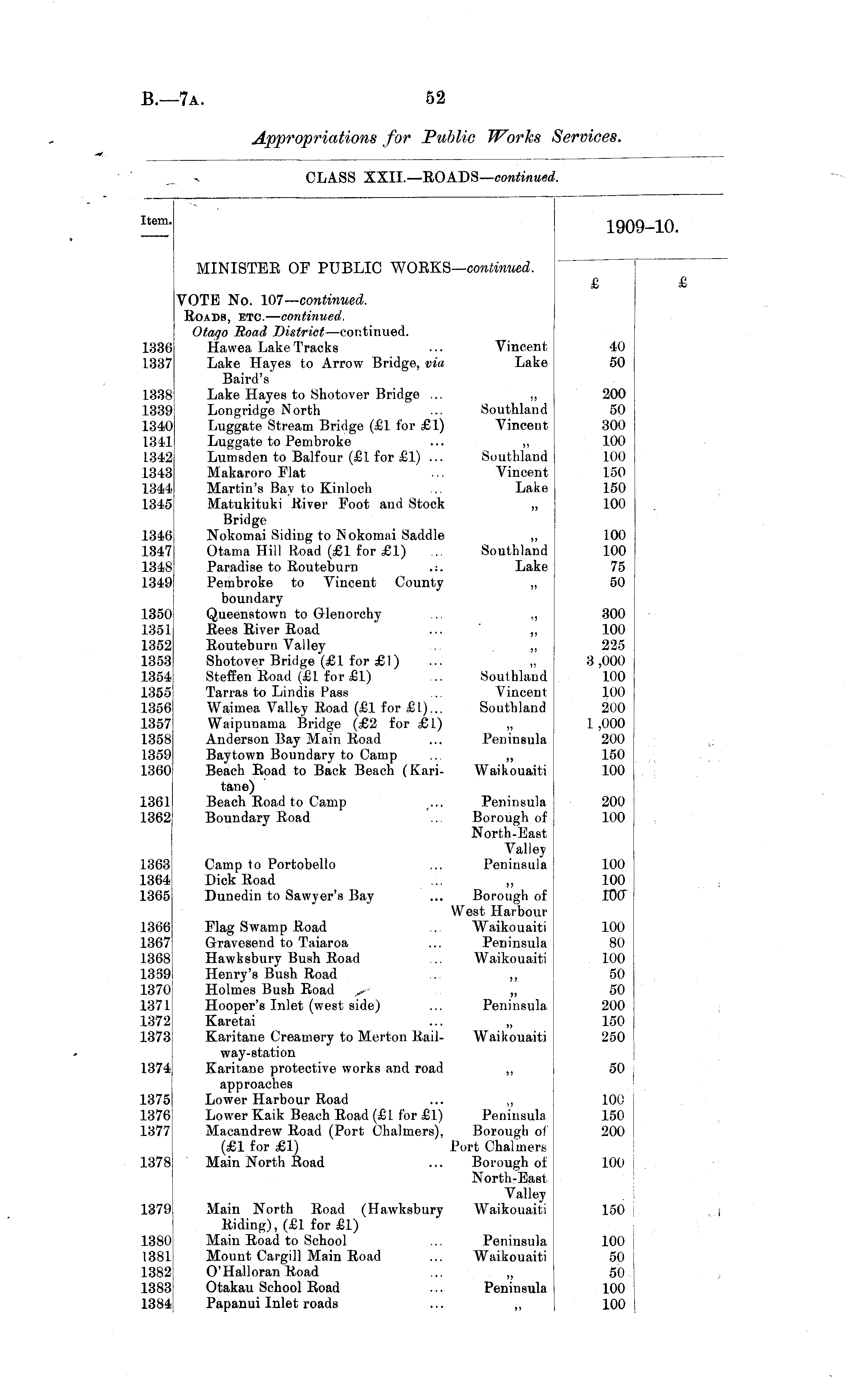 Item. 1909-10. MINISTER OF PUBLIC WORKS—continued. VOTE No. 107— continued. Roads, etc. — continued. Otago Road District —continued. Hawea Lake Tracks ... Vincent Lake Hayes to Arrow Bridge, via Lake Baird's Lake Hayes to Shotover Bridge ... ,, Longridge North ... Southland Luggate Stream Bridge (£1 for £1) Vinceut Luggate to Pembroke ... ,, Lumsden to Balfour (£l for £1) ... Southland Makaroro Flat ... Vincent Martin's Bay to Kinloch ... Lake Matukituki River Foot and Stock „ Bridge Nokomai Siding to Nokomai Saddle „ Otama Hill Road (£1 for £1) ... Southland Paradise to Routeburn .:. Lake Pembroke to Vincent County „ boundary Queenstown to Glenorchy ... „ Rees River Road ... ,, Routeburn Valley ... ,, Shotover Bridge (£1 for £1) ... „ Steffen Road (£l for £1) ... Southland Tarras to Lindis Pass .. Vincent Waimea Valley Road (£1 for £l)... Southland Waipunama Bridge (£2 for £l) „ Anderson Bay Main Road ... Peninsula Baytown Boundary to Camp .. ,, Beach Road to Back Beach (Kari- Waikouaiti tane) Beach Road to Camp ... Peninsula Boundary Road ... Borough of North-East Valley Camp to Portobello ... Peninsula Dick Road ... ,, Dunedin to Sawyer's Bay ... Borough of West Harbour Flag Swamp Road ... Waikouaiti Gravesend to Taiaroa ... Peninsula Hawksbury Bush Road ... Waikouaiti Henry's Bush Road ... ,, Holmes Bush Road y j „ Hooper's Inlet (west side) ... Peninsula Karetai ... „ Karitane Creamery to Merton Rail- Waikouaiti way-station Karitane protective works and road ,, approaches Lower Harbour Road ... ,, Lower Kaik Beach Road (£1 for £1) Peninsula Macandrew Road (Port Chalmers), Borough of (£1 for £1) Port Chalmers Main North Road ... Borough of North-East Valley Main North Road (Hawksbury Waikouaiti Riding), (£1 for £1) Main Road to School ... Peninsula Mount Cargill Main Road ... Waikouaiti O'Halloran Road ... „ Otakau School Road ... Peninsula Papanui Inlet roads ... ,, £ 1336 1337 40 50 1338 1339 1340 1341 1342 1343 1344 1345 200 50 300 100 100 150 150 100 1346 1347 1348 1349 100 100 75 50 1350 1351 1352 1353 1354 1355 1356 1357 1358 1359 1360 300 100 225 3 ,000 100 100 200 1,000 200 150 100 1361 1362 200 100 1363 1364 1365 100 100 100 1366 1367 1368 1339 1370 1371 1372 1373 100 80 100 50 50 200 150 250 1374 50 1375 1376 1377 100 150 200 1378 100 1379 150 1380 1381 1382 1383 1384 100 50 50 100 100