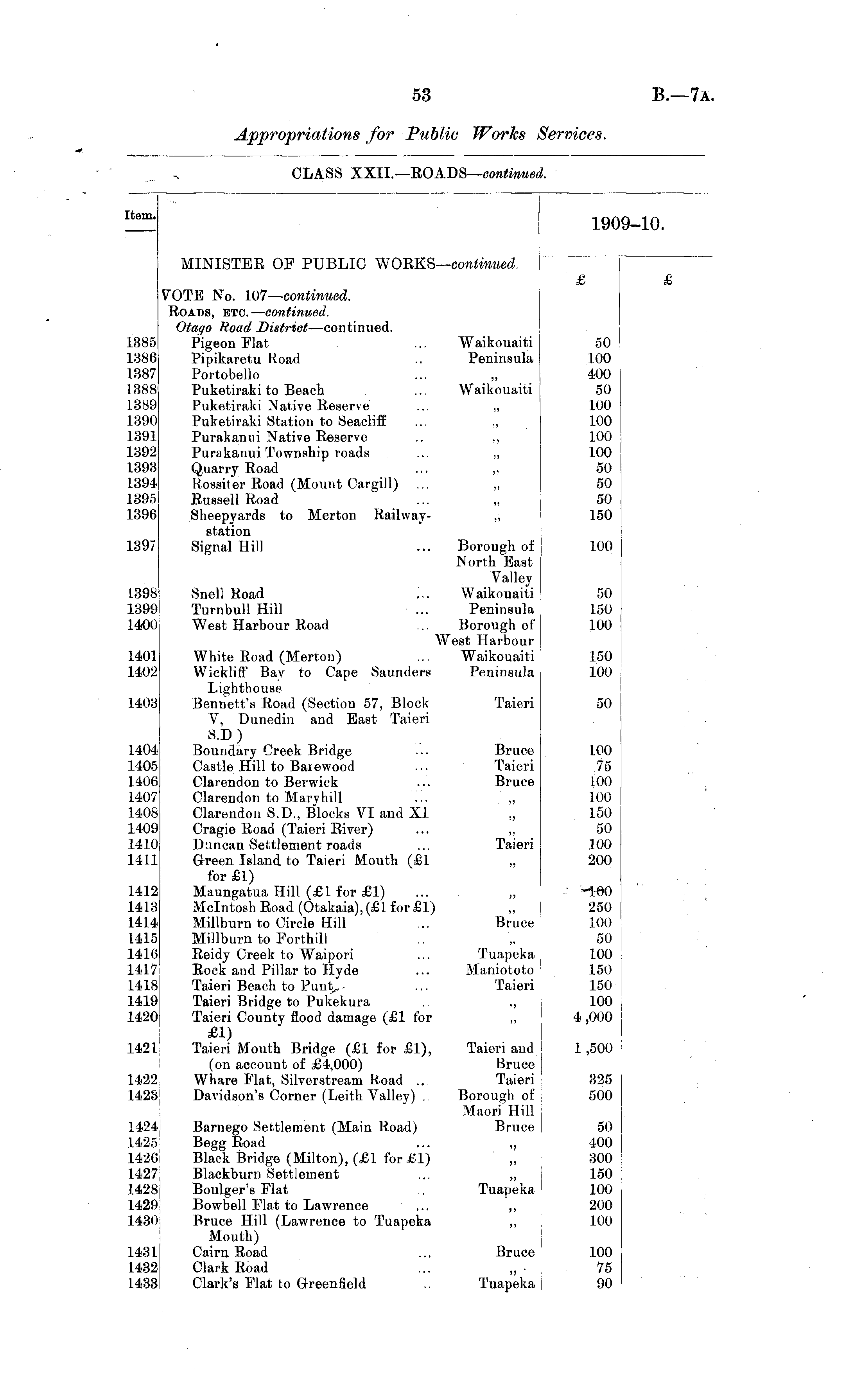Item. 1909-10. MINISTER OF PUBLIC WORKS— continued. VOTE No. 107— continued. Roads, etc. — continued. Otago Road District —continued. Pigeon Flat ... Waikouaiti Pipikaretu Road .. Peninsula Portobello ... „ Puketiraki to Beach ... Waikouaiti Puketiraki Native Reserve ... „ Puketiraki Station to Seacliff ... ,, Purakanui Native Reserve .. ,, Purakanui Township roads ... „ Quarry Road ... „ Rossiter Road (Mount Cargill) ... „ Russell Road ... „ Sheepyards to Merton Railway- „ station Signal Hill ... Borough of North East Valley Snell Road ... Waikouaiti Turnbull Hill ... Peninsula West Harbour Road ... Borough of West Harbour White Road (Merton) ... Waikouaiti Wickliff Bay to Cape Saunders Peninsula Lighthouse. Bennett's Road (Section 57, Block Taieri V, Dunedin and East Taieri S.D) Boundary Creek Bridge ••• Bruce Castle Hill to Barewood ... Taieri Clarendon to Berwick ... Bruce Clarendon to Mary hill ... ,, Clarendon S.D., Blocks VI and XI ,, Cragie Road (Taieri River) ... ,, Duncan Settlement roads ... Taieri Green Island to Taieri Mouth (£1 „ for £1) Maungatua Hill (£1 for £1) Mcintosh Road (Otakaia), (£1 for £1) Millburn to Circle Hill ... Bruce Millburn to Forthill Reidy Creek to Waipori ... Tuapeka Rock and Pillar to Hyde ... Maniototo Taieri Beach to Punt ... Taieri Taieri Bridge to Pukekura ... ,, Taieri County flood damage (£1 for ,, £1) Taieri Mouth Bridge (£1 for £1), Taieri and (on account of £4,000) Bruce Whare Flat, Silverstream Road ... Taieri Davidson's Corner (Leith Valley) . Borough of Maori Hill Barnego Settlement (Main Road) Bruce Begg Road ... ,, Black Bridge (Milton), (£1 for£l) Blackburn Settlement ... ,, Boulger's Flat .. Tuapeka Bowbell Flat to Lawrence ... ,, Bruce Hill (Lawrence to Tuapeka ,, Mouth) Cairn Road ... Bruce Clark Road ... ,, Clark's Flat to Greenfield .. Tuapeka £ £ 1385 1386 1387 1388 1389 1390 1391 1392 1393 1394 1395 1396 50 100 400 50 100 100 100 100 50 50 50 150 1397 100 1398 1399 1400 50 150 100 1401 1402 150 100 1403 50 1404 1405 1406 1407 1408 1409 1410 1411 100 75 100 100 150 50 100 200 1412 1413 1414 1415 1416 1417 1418J 1419 1 1420; 100 250 100 50 100 150 150 100 4,000 1421 1,500 j 1422 1428, 325 500 1424 1425 1426 1427 1428! 1429 1430 50 400 300 150 100 200 100 1431 1432 1433 100 75 90