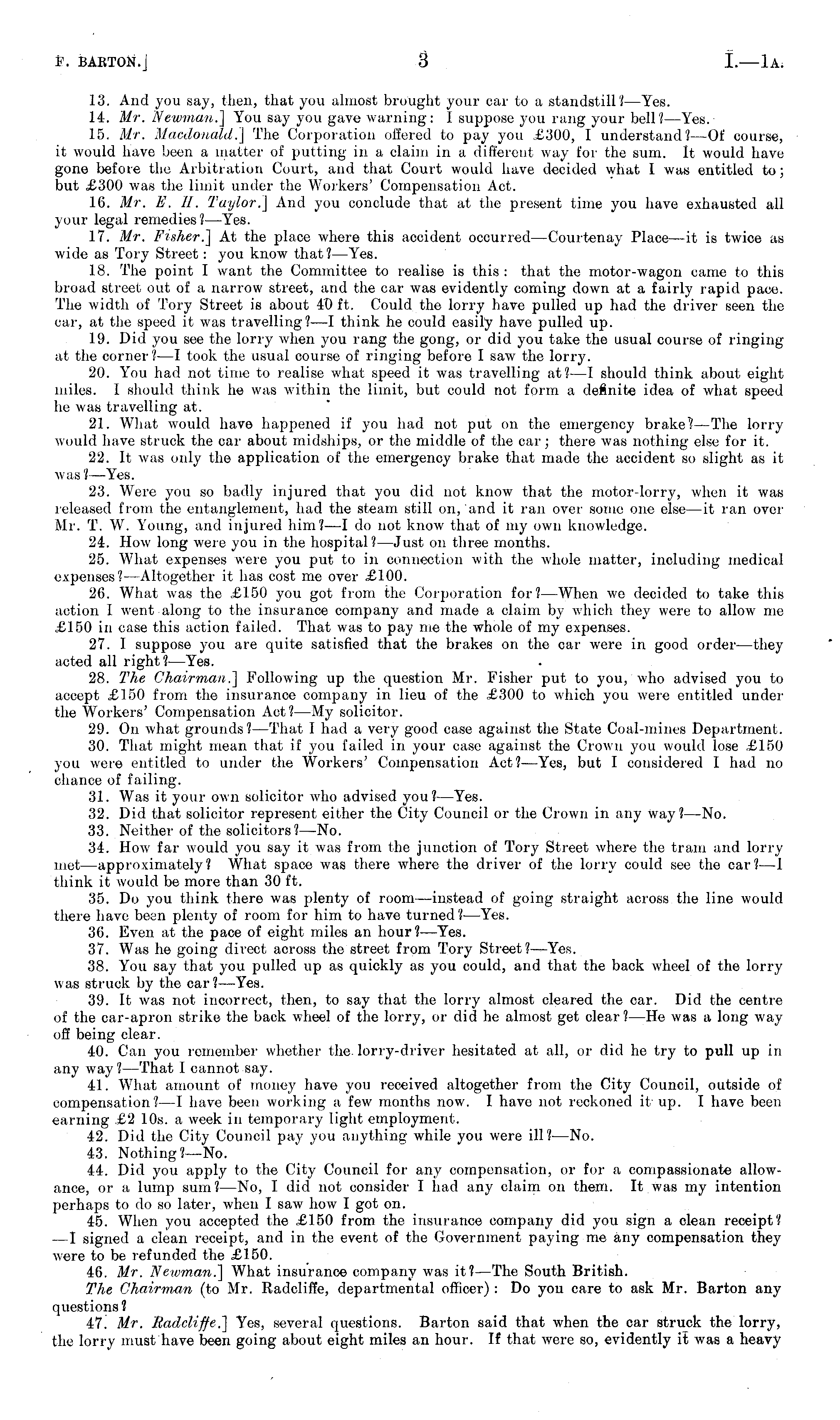 13. And you say, then, that you almost brought your car to a standstill? —Yes. 14. Mr. Newman.] You say you gave warning: 1 suppose you rang your bell? —Yes. 15. Mr. Macdonald.] The Corporation offered to pay you £300, I understand? —Of course, it would have been a matter of putting in a claim in a different way for the sum. It would have gone before the Arbitration Court, and that Court would have decided what 1 was entitled to; but £300 was the limit under the Workers' Compensation Act. IG. Mr. E. 11. Taylor.] And you conclude that at the present time you have exhausted all your legal remedies ?—Yes. 17. Mr. Fisher.] At the place where this accident occurred —Courtenay Place —it is twice as wide as Tory Street: you know that? —Yes. 18. The point I want the Committee to realise is this : that the motor-wagon came to this broad street out of a narrow street, and the car was evidently coming down at a fairly rapid pace. The width of Tory Street is about 40 ft. Could the lorry have pulled up had the driver seen the car, at the speed it was travelling? —I think he could easily have pulled up. 19. Did you see the lorry when you rang the gong, or did you take the usual course of ringing at the corner?—l took the usual course of ringing before I saw the lorry. 20. You had not time to realise wdiat speed it was travelling at?—l should think about eight miles. 1 should think he was within the limit, but could not form a definite idea of what speed he was travelling at. 21. What would have happened if you had not put on the emergency brake.* —The lorry would have struck the car about midships, or the middle of the car; there was nothing else for it. 22. It was only the application of the emergency brake that made the accident so slight as it was? —Yes. 23. Were you so badly injured that you did not know that the motor-lorry, when it was released from the entanglement, had the steam still on, and it ran over sonar one else—it ran over Mr. T. W. Young, and injured him?—l do not know that of my own knowledge. 24. How long were you in the hospital?— Just on three months. 25. What expenses were you put to in connection with the whole matter, including medical expenses? —Altogether it has cost me over £100. 2(i. What was the £150 you got from the Corporation for? —When we decided to take this action 1 went along to the insurance company and made a claim by which they were to allow me £150 in case this action failed. That was to pay me the whole of my expenses. 27. I suppose you are quite satisfied that the brakes on the car were in good order —they acted all right? —Yes. 28. The Chairman.] Following up the question Mr. Fisher put to you, who advised you to accept £150 from the insurance company in lieu of the £300 to which you were entitled under the Workers' Compensation Act? —My solicitor. 29. On what grounds?— That I had a very good case against the State Coal-mines Department. 30. That might mean that if you failed in your case against the Crown you would lose £150 you were entitled to under the Workers' Compensation Act?— Yes, but I considered 1 had no chance of failing. 31. Was it your own solicitor who advised you? —Yes. 32. Did that solicitor represent either the City Council or the Crown in any way?— No. 33. Neither of the solicitors?— No. 34. How far would you say it was from the junction of Tory Street where the tram and lorry met —approximately? What space was there where the driver of the lorry could see the car?—l think it would be more than 30 ft. 35. Do you think there was plenty of room—instead of going straight across the line would there have been plenty of room for him to have turned? —Yes. 36. Even at the pace of eight miles an hour?— Yes. 37. Was he going direct across the street from Tory Street? —Yes. 38. You say that you pulled up as quickly as you could, and that the back wheel of the lorry was struck by the car? —Yes. 39. It was not incorrect, then, to say that the lorry almost cleared the car. Did the centre of the car-apron strike the back wheel of the lorry, or did he almost get clear? —He was a long way off being clear. 40. Can you remember whether the lorry-driver hesitated at all, or did he try to pull up in any way? —That I cannot say. 41. What amount of money have you received altogether from the City Council, outside of compensation? —I have been working a few months now. I have not reckoned it up. I have been earning £2 10s. a week in temporary light employment. 42. Did the City Council pay you anything while you were ill? —No. 43. Nothing?~No. 44. Did you apply to the City Council for any compensation, or for a compassionate allowance, or a, lump sum? —No, I did not consider I had any claim on them. It was my intention perhaps to do so later, when I saw how I got on. 45. When you accepted the £150 from the insurance company did you sign a clean receipt? —I signed a clean receipt, and in the event of the Government paying me any compensation they were to be refunded the £150. 46. Mr. Newman.] What insurance company was it?— The South British. The Chairman (to Mr. Radcliffe, departmental officer) : Do you care to ask Mr. Barton any questions? 47. Mr. Radcliffe.] Yes, several questions. Barton said that when the car struck the lorry, the lorry must have been going about eight miles an hour. If that were so, evidently it was a heavy
