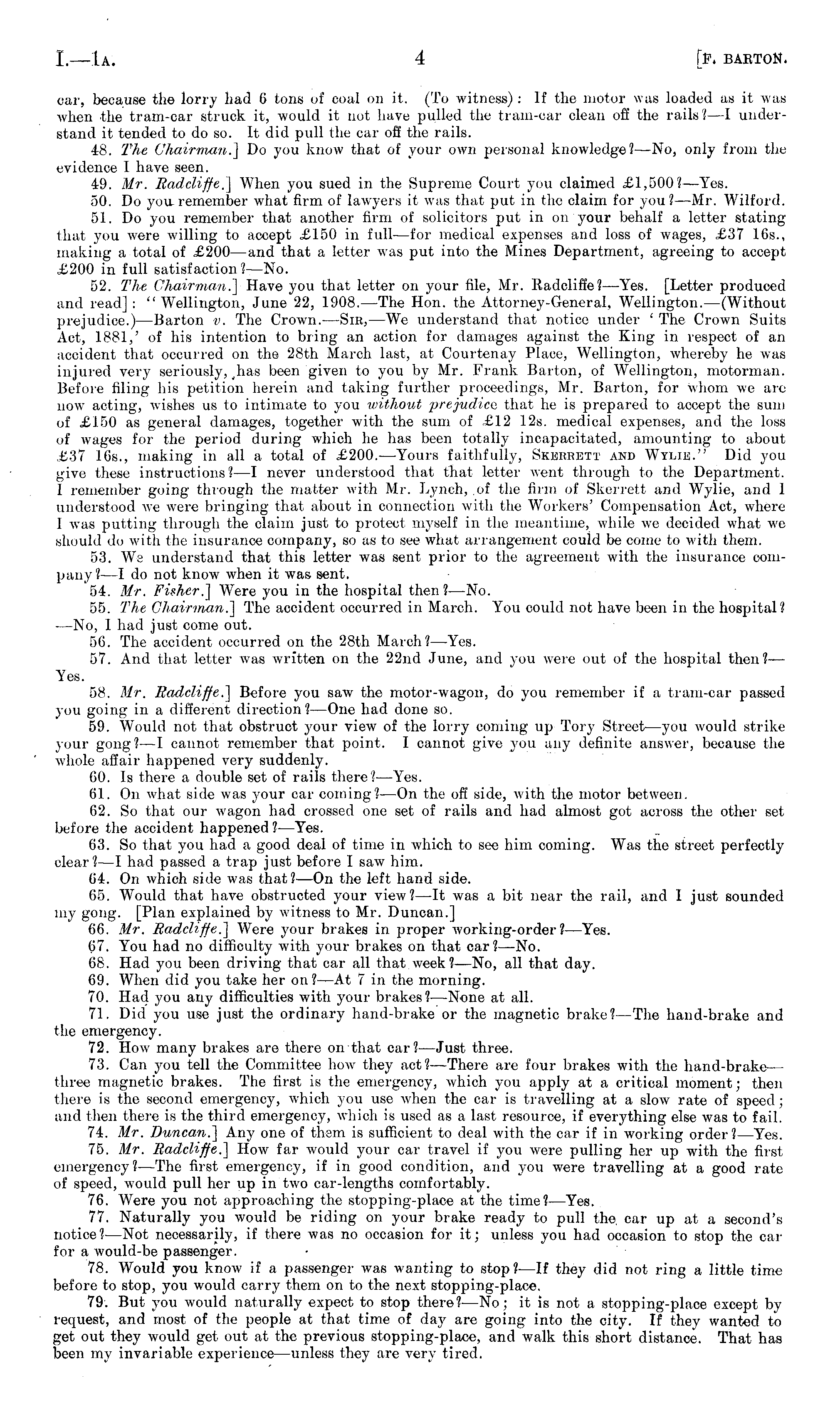 car, because the lorry had 6 tons of coal on it. (To witness) :If the motor was loaded as it was when the tram-car struck it, would it not have pulled the tram-car clean off the rails?—l understand it tended to do so. It did pull the car off the rails. 48. The Chairman.] Do you know that of your own personal knowledge?—No, only from the evidence I have seen. 49. Mr. Radcliffe.] When you sued in the Supreme Court you claimed £1,500? —Yes. 50. Do you remember what firm of lawyers it was that put in the claim for you?— Mr. Wilford. 51. Do you remember that another firm of solicitors put in on your behalf a letter stating that \'ou were willing to accept £150 in full—for medical expenses and loss of wages, £37 165., making a total of £200—and that a letter was put into the Mines Department, agreeing to accept .£2OO in full satisfaction? —No. 52. The Chairman.] Have you that letter on your file, Mr. Radcliffe?—Yes. [Letter produced and read] : "Wellington, June 22, 1908.—The Hon. the Attorney-General, Wellington.—(Without prejudice.)— Barton v. The Crown. —Sir, —We understand that notice under ' The Crown Suits Act, 1881,' of his intention to bring an action for damages against the King in respect of an accident that occurred on the 28th March last, at Courtenay Place, Wellington, whereby he was injured very seriously, has been given to you by Mr. Frank Barton, of Wellington, motorman. Before filing his petition herein and taking further proceedings, Mr. Barton, for whom we are now acting, wishes us to intimate to j'ou without prejudice lhal he is prepared to accept the sum of £J. r >o as general damages, together with the sum of £12 12s. medical expenses, and the loss of wages for the period during which he has been totally incapacitated, amounting to about Z'47 165., making in all a total of £200.—Yours faithfully, Skerrett and Wylie." Did you give these instructions? —I never understood that that letter went through to the Department. 1 remember going through the matter with Mr. Lynch, .of the firm of Skerrctt and Wylie, and I understood we were bringing that about in connection with the Workers' Compensation Act, where 1 was putting through the claim just to protect myself in the meantime, while we decided what we should do with the insurance company, so as to see what arrangement could be come to with them. 53. Ws understand that this letter was sent prior to the agreement with the insurance company?—l do not know when it was sent. 54. Mr. Fisher.] Were you in the hospital then? —No. 55. The Chairman.] The accident occurred in March. You could not have been in the hospital? No, I had just come out. 56. The accident occurred on the 28th March?— Yes. 57. And that letter was written on the 22nd June, and you were out of the hospital then? — Yes. 58. Mr. Radcliffe.] Before you saw the motor-wagon, do you remember if a tram-car passed you going in a different direction? —One had done so. 59. Would not that obstruct your view of the lorry coming up Tory Street —you would strike your gong?—l cannot remember that point. I cannot give you any definite answer, because the whole a flail- happened very suddenly. 60. Is there a double set of rails there?— Yes. 61. On what side was jour ear coming? —On the off side, with the motor between. 62. So that our wagon had crossed one set of rails and had almost got across the other set before the accident happened? —Yes. 63. So that you had a good deal of time in which to see him coming. Was the street perfectly clear? —I had passed a trap just before I saw him. 64. On which side was that? —On the left hand side. 65. Would that have obstructed your view? —It was a bit near the rail, and 1 just sounded my gong. [Plan explained by witness to Mr. Duncan.] 66. Mr. Radcliffe.] Were your brakes in proper working-order?— Yes. 67. You had no difficulty with your brakes on that car? —No. 68. Had you been driving that car all that week?—No, all that day. 69. When did you take her on?—At 7 in the morning. 70. Had you any difficulties with your brakes?— None at all. 71. Did you use just the ordinary hand-brake or the magnetic brake? —The hand-brake and the emergency. 72. How many brakes are there on that car?— Just three. 73. Can you tell the Committee how they act?— There are four brakes with the hand-brake— three magnetic brakes. The first is the emergency, which you apply at a critical moment; then there is the second emergency, which you use when the car is travelling at a slow rate of speed ; and then there is the third emergency, which is used as a last resource, if everything else was to fail. 74. Mr. Duncan.] Any one of them is sufficient to deal with the car if in working order?— Yes. 75. Mr. Radcliffe.] How far would your car travel if you were pulling her up with the first emergency?— The first emergency, if in good condition, and you were travelling at a good rate of speed, would pull her up in two car-lengths comfortably. 76. Were you not approaching the stopping-place at the time? —Yes. 77. Naturally you would be riding on your brake ready to pull the. car up at a second's notice?— Not necessarily, if there was no occasion for it; unless you had occasion to stop the ear for a would-be passenger. 78. Would you know if a passenger was wanting to stop?—lf they did not ring a little time before to stop, you would carry them on to the next stopping-place. 79. But you would naturally expect to stop there?—No ; it is not a stopping-place except by request, and most of the people at that time of day are going into the city. If they wanted to get out they would get out at the previous stopping-place, and walk this short distance. That has been my invariable experience—unless they arc very tired.