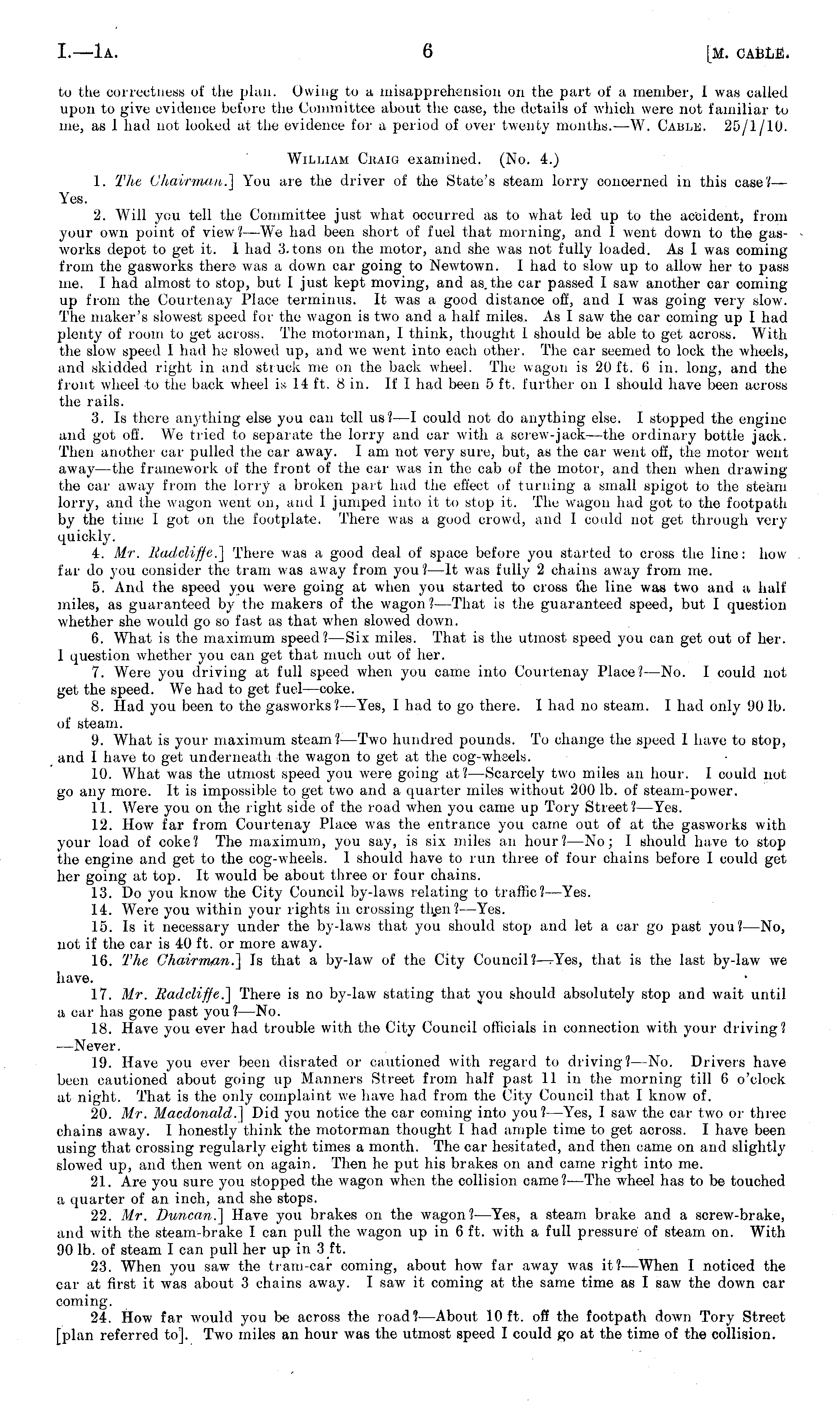 to the correctness of the plan. Owing to a misapprehension on the part of a member, 1 was called upon to give evidence before the Committee about the case, the details of which were not familiar to me, as 1 had not looked ai the evidence for a period of over twenty months. —W. Cable. 25/1/10. William Craig examined. (No. 4.) 1. The Chairman.] You are the driver of the State's steam lorry concerned in this case?— Yes. 2. Will you tell the Committee just what occurred as to what led up to the accident, from your own point of view?—We had been short of fuel that morning, and 1 went down to the gasworks depot to get it. 1 had 3.tons on the motor, and she was not fully loaded. As 1 was coming from the gasworks there was a down car going to Newtown. 1 had to slow up to allow her to pass me. I had almost to stop, but I just kept moving, and as.the ear passed I saw another car coming up from the Courtenay Place terminus. It was a good distance off, and I was going very slow. The maker's slowest speed for the wagon is two and a half miles. As I saw the car coming up I had plenty of room to get across. The motorman, I think, thought 1 should be able to get across. With the slow speed 1 had he slowed up, and we went into each other. The car seemed to lock the wheels, and skidded right in and sti uck me on the back wheel. The wagon is 20 ft. 6 in. long, and the front wheel to the back wheel is 14 ft. 8 in. If I had been 5 ft. further on 1 should have been across the rails. 3. Is there anything else you can tell us? —I could not do anything else. I stopped the engine and got off. We tried to separate the lorry and car with a. screw-jack—the ordinary bottle jack. Then another car pulled the car away. lam not very sure, but, as the car went off, the motor went away —the framework of the front of the car was in the cab of the motor, and then when drawing Ihe oar away from the lorry a broken part had the effect of turning a small spigot to the steam lorry, and the wagon went on, and 1 jumped into it to stop it. The wagon had got to the footpath by the time 1 got on the footplate. There was a good crowd, and I could not get through very quickly. 4. Mr. Radcliffe.] There was a good deal of space before you started to cross the line: how far do you consider the tram was away from you? —It was fully 2 chains away from me. 5. And the speed you were going at when you started to cross the line was two and a hali miles, as guaranteed by the makers of the w agon I —That is the guaranteed speed, but I question whether she would go so fast as that when slowed down. 6. What is the maximum speed? —Six miles. That is the utmost speed you can get out of her. 1 question whether you can get that much out of her. 7. Were you driving at full speed when you came into Courtenay Place?— No. I could not get the speed. We had to get fuel—coke. 8. Had you been to the gasworks? —Yes, 1 had to go there. I had no steam. I had only 90 lb. of steam. 9. What is your maximum steam?— Two hundred pounds. To change the speed I have to stop, and 1 have to get underneath the wagon to get at the cog-wheels. 10. What was the utmost speed you were going at? —Scarcely two miles an hour. I could not go any more. It is impossible to get two and a quarter miles without 200 lb. of steam-power. 11. Were you on the right side of the road when you came up Tory Street? —Yes. 12. How far from Courtenay Place was the entrance you came out of at the gasworks with your load of coke? The maximum, you say, is six miles an hour?—No; I should have to stop the engine and get to the cog-wheels. I should have to run three of four chains before I could got her going at top. It would be about three or four chains. 13. Do you know the City Council by-laws relating to traffic?— Yes. 14. Were you within your rights in crossing tlien? —Yes. 15. Is it necessary under the by-laws that you should stop and let a car go past you?—No, not if the car is 40 ft. or more away. 16. The Chairman.] Is that a by-law of the City Council?—Y'es, (hat is the last by-law we have. 17. Mr. Radcliffe.] There is no by-law stating that you should absolutely stop and wait until a car has gone past you?— No. 18. Have you ever had trouble with the City Council officials in connection with your driving? —Never. 19. Have you ever been disrated or cautioned with regard to driving? —No. Drivers have been cautioned about going up Manners Street from half past 11 in the morning till 6 o'clock at night. That is the only complaint we have had from the City Council that I know of. 20. Mr. Macdonald.] Did you notice the car coming into you?— Yes, I saw the car two or three chains away. I honestly think the motorman thought I had ample time to get across. I have been using that crossing regularly eight times a month. The car hesitated, and then came on and slightly slowed up, and then went on again. Then he put his brakes on and came right into me. 21. Are you sure you stopped the wagon when the collision came?— The wheel has to be touched a quarter of an inch, and she stops. 22. Mr. Duncan.] Have you brakes on the wagon?— Yes, a steam brake and a screw-brake, and with the steam-brake I can pull the wagon up in 6 ft. with a full pressure of steam on. With 90 lb. of steam I can pull her up in 3 ft. 23. When you saw the tram-car coming, about how far away was it?— When I noticed the car at first it was about 3 chains away. I saw it coming at the same time as I saw the down car coming. 24. How far would you be across the road? —About 10ft. off the footpath down Tory Street [plan referred to]. Two miles an hour was the utmost speed I could go at the time of the collision.