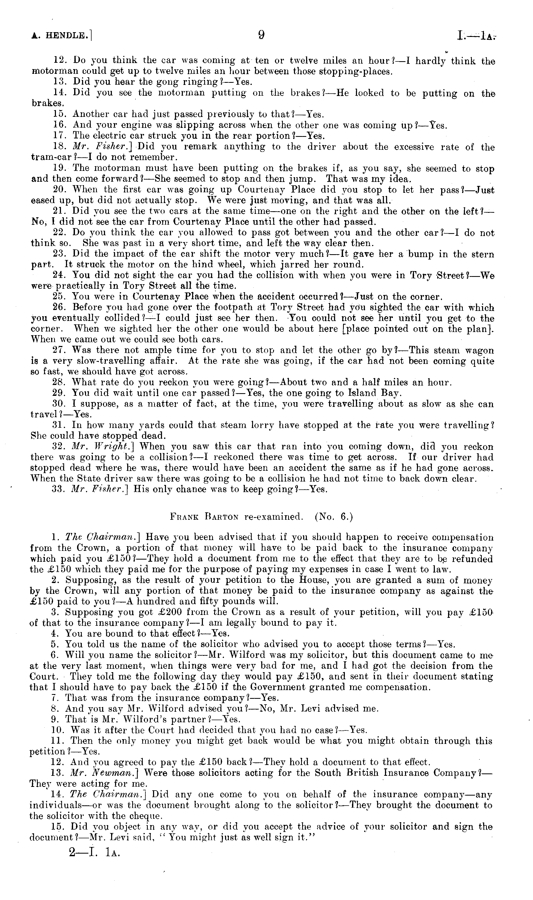 12. Do you think the car was coming at ten or twelve miles an hour?—l hardly think the motorman could get up to twelve miles an hour between those stopping-places. 13. Did you hear the gong ringing?—Y T es. 14. Did you see the motorman putting on the brakes?—He looked to be putting on the brakes. 15. Another car had just passed previously to that? —Yes. 16. And your engine was slipping across when the other one was coming up?— Yes. 17. The electric car struck you in the rear portion? —Yes. 18. Mr. Fisher.] Did you remark anything to the driver about the excessive rate of the tram-car?—l do not remember. 19. The motorman must have been putting on the brakes if, as you say, she seemed to stop and then come forward?— She seemed to stop and then jump. That was my idea. 20. When the first car was going up Courtenay Place did you stop to let her pass?— Just eased up, but did not actually stop. We were just moving, and that was all. 21. Did you see the two cars at the same time —one on the right and the other on the left?— No, I did not see the car from Courtenay Place until the other had passed. 22. Do you think the car you allowed to pass got between you and the other car?—l do not think so. She was past in a very short time, and left the way clear then. 23. Did the impact of the car shift the motor very much? —It gave her a bump in the stern part. It struck the motor on the hind wheel, which jarred her round. 24. You did not sight the car you had the collision with when you were in Tory Street?—We were practically in Tory Street all the time. 25. You were in Courtenay Place when the accident occurred? —Just on the corner. 26. Before you had gone over the footpath at Tory Street had you sighted the car with which you eventually collided?—l could just see her then. -You could not see her until you get to the corner. When we sighted her the other one would be about here [place pointed out on the plan]. When we came out we could see both cars. 27. Was there not ample time for you to stop and let the other go by?— This steam wagon is a very slow-travelling affair. At the rate she was going, if the car had not been coming quite so fast, we should have got across. 28. What rate do you reckon you were going? —About two and a half miles an hour. 29. You did wait until one car passed?— Yes, the one going to Island Bay. 30. I suppose, as a matter of fact, at the time, you were travelling about as slow as she can travel?— Yes. 31. In how many yards could that steam lorry have stopped at the rate you were travelling? She could have stopped dead. 32. Mr. Wright.] When you saw this car that ran into you coming down, did you reckon there was going to be a collision?—l reckoned there was time to get across. If our driver had stopped dead where he was, there would have been an accident the same as if he had gone across. When the State driver saw- there was going to be a collision he had not time to back down clear. 33. Mr. Fisher.] His only chance was to keep going? —Yes. Frank Barton re-examined. (Xo. 6.) 1. The Chairman.] Have you been advised that if you should happen to receive compensation from the Crown, a portion of that money will have to be paid back to the insurance company which paid you £150?— They hold a document from me to the effect that they are to be refunded the £150 which they paid me for the purpose of paying my expenses in case I went to law. 2. Supposing, as the result of your petition to the House, you are granted a sum of money by the Crown, will any portion of that money be paid to the insurance company as against the £150 paid to you?—A hundred and fifty pounds will. 3. Supposing you got £200 from the Crown as a result of your petition, will you pay .£l5O of that to the insurance company? —I am legally bound to pay it. 4. You are bound to that effect? —Yes. 5. You told us the name of the solicitor who advised you to accept those terms?— Yes. 6. Will you name the solicitor?— Mr. Wilford was my solicitor, but this document came to me at the very last moment, when things were very bad for me, and I had got the decision from the Court! They told me the following day they would pay £150, and sent in their document stating that I should have to pay back the £150 if the Government granted me compensation. 7. That was from the insurance company?— Yes. 8. And you say Mr. Wilford advised you?—No, Mr. Levi advised me. 9. That is Mr. Wilford's partner?— Yes. 10. Was it after the Court had decided that you had no case?—-Yes. 11. Then the only money you might get back would be what you might obtain through this petition ?—Yes. 12. And you agreed to pay the £150 back?— They hold a document to that effect. 13. Mr. Newman.] Were those solicitors acting for the South British Insurance Company?— They were acting for me. 14. The Chairman.] Did any one come to you on behalf of the insurance company —any individuals —or was the document brought along to the solicitor? —They brought the document to the solicitor with the cheque. 15. Did you object in any way, or did you accept the advice of your solicitor and sign the document?— Mr. Levi said, " You might just as well sign it." 2—l. la.