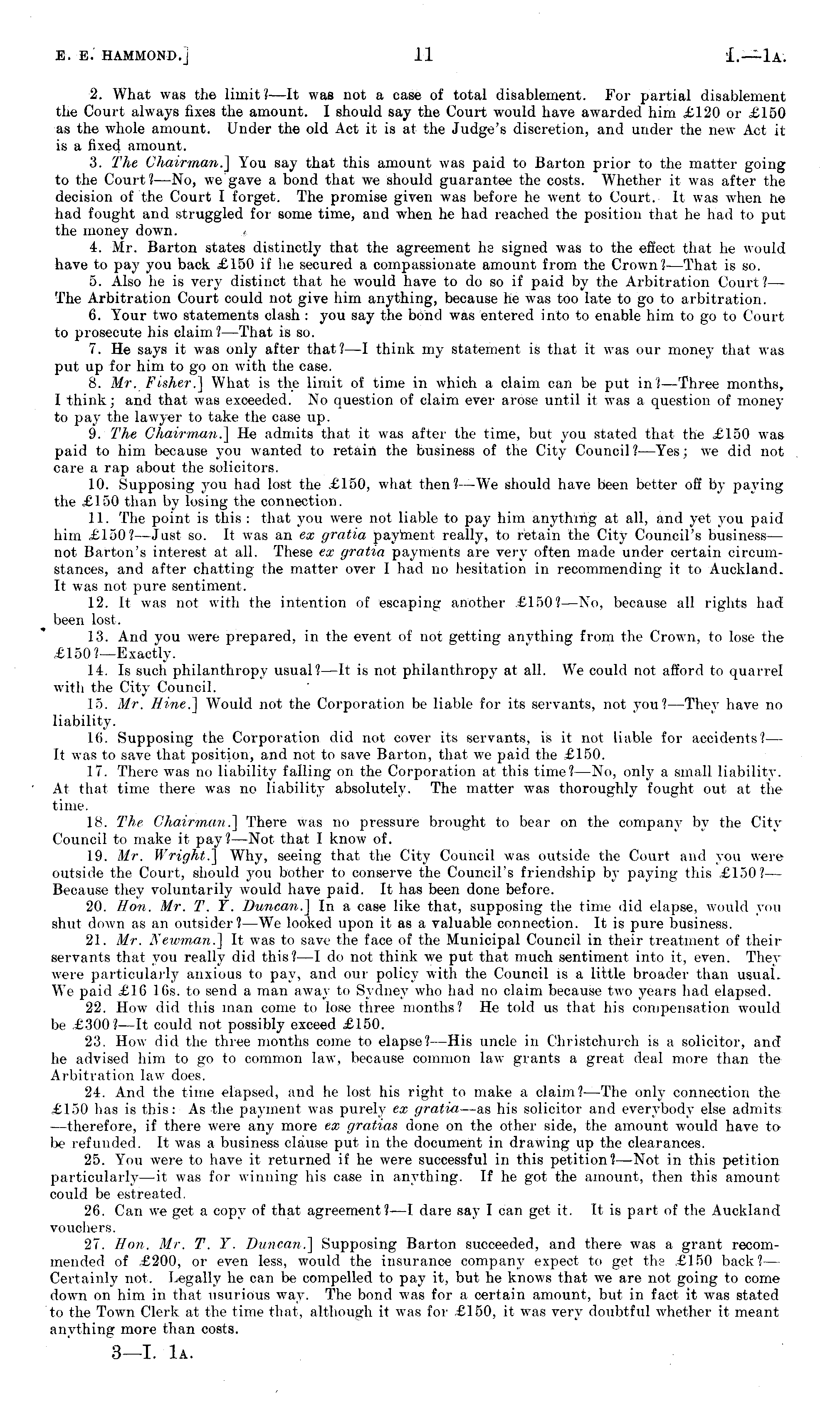 2. What was the limit? —It was not a case of total disablement. For partial disablemen the Court always fixes the amount. I should say the Court would have awarded him £120 or £15' as the whole amount. Under the old Act it is at the Judge's discretion, and under the new Act i is a fixed amount. 3. The Chawman.] You say that this amount was paid to Barton prior to the matter goiii| to the Court? —No, we gave a bond that we should guarantee the costs. Whether it was after th decision of the Court I forget. The promise given was before he went to Court. It was when h had fought and struggled for some time, and when he had reached the position that he had to pu the money down. 4. Mr. Barton states distinctly that the agreement h3 signed was to the effect that he wouli have to pay you back £150 if he secured a compassionate amount from the Crown?— That is so. 5. Also he is very distinct that he would have to do so if paid by the Arbitration Court ?— The Arbitration Court could not give him anything, because he was too late to go to arbitration. 6. Your two statements clash : you say the bond was entered into to enable him to go to Cour to prosecute his claim? —That is so. 7. He says it was only after that?—l think my statement is that it was our money that wa put up for him to go on with the case. H. Mr. Fisher.] What is the limit of time in which a claim can be put in?— Three months I think; and that was exceeded. No question of claim ever arose until it was a question of mone l to pay the lawyer to take the case up. 9. The Chairman.] He admits that it was after the time, but you stated that the £150 wa paid to him because you wanted to retain the business of the City Council ?—Yes; we did no care a rap about the solicitors. 10. Supposing you had lost the .£l5O, what then? —We should have been better off by pa vim the £150 than by losing the connection. 11. The point is this : that you were not liable to pay him anything at all, and yet 3*ou paic him £150?— Just so. It was an ex gratia payment really, to retain the City Council's business— not Barton's interest at all. These ex gratia payments are very often made under certain circum stances, and after chatting the matter over I had no hesitation in recommending it to Auckland It was not pure sentiment. 12. It was not with the intention of escaping another £150?— No, because all rights hac been lost. 13 , . And you were prepared, in the event of not getting anything from the Crown, to lose the £150?— Exactly. 14. Is such philanthropy usual? —It is not philanthropy at all. We could not afford to quarre witli the City Council. l."i. Mr. Mine.] Would not the Corporation be liable for its servants, not you? —They have m liability. Hi. Supposing the Corporation did not cover its servants, is it not liable for accidents?— It was to save that position, and not to save Barton, that we paid the £150. 17. There was no liability falling on the Corporation at this time?—No, only a .small liability At thtit time there was no liability absolutely. The matter was thoroughly fought out at th< time. 18. The Chairman.] There was no pressure brought to bear on the company by the Citj Council to make it pay?— Not that I know of. 19. Mr. Wright.] Why, seeing that the City Council was outside the Court and you wen outside the Court, should j-ou bother to conserve the Council's friendship by paying this £150?— Because they voluntarily would have paid. It has been done before. 20. Hon. Mr. T. Y. Duncan.] In a case like that, supposing the time did elapse, would vni shut down as an outsider? —We looked upon it as a valuable connection. It is pure business. 21. Mr. Newman.] It was to save the face of the Municipal Council in their treatment of their servants that you really did this?—l do not think we put that much sentiment into it, even. They were particularly anxious to pay, and our policy with the Council is a little broader than usual. We paid £16 lGs. to send a man away to Sydney who had no claim because two years had elapsed. 22. How did this man come to lose three months? He told us that his compensation would be £300?— It could not possibly exceed £150. 23. How did the three months come to elapse?— His uncle in Christchurch is a solicitor, and he advised him to go to common law, because common law grants a great deal more than the Arbitration law does. 24. And the time elapsed, and he lost his right to make a claim? —The only connection the £150 has is this: As the payment was purely ex gratia —as his solicitor and everybody else admits —therefore, if there were any more ex gratias done on the other side, the amount would have to l>e refunded. It was a business clause put in the document in drawing up the clearances. 25. You were to have it returned if he were successful in this petition?— Not in this petition particularly —it was for winning his case in anything. If he got the amount, then this amount could be estreated. 26. Can we get a copy of that agreement?—l dare say I can get it. It is part of the Auckland vouchers. 27. Hon. Mr. T. Y. Duncan.] Supposing Barton succeeded, and there was a grant recommended of £200, or even less, would the insurance company expect to get the £150 back?— Certainly not. Legally he can be compelled to pay it, but he knows that we are not going to come down on him in that usurious way. The bond was for a certain amount, but in fact it was stated to the Town Clerk at the time that, although it was for £150, it was very doubtful whether it meant anything more than costs. 3—l. lα.