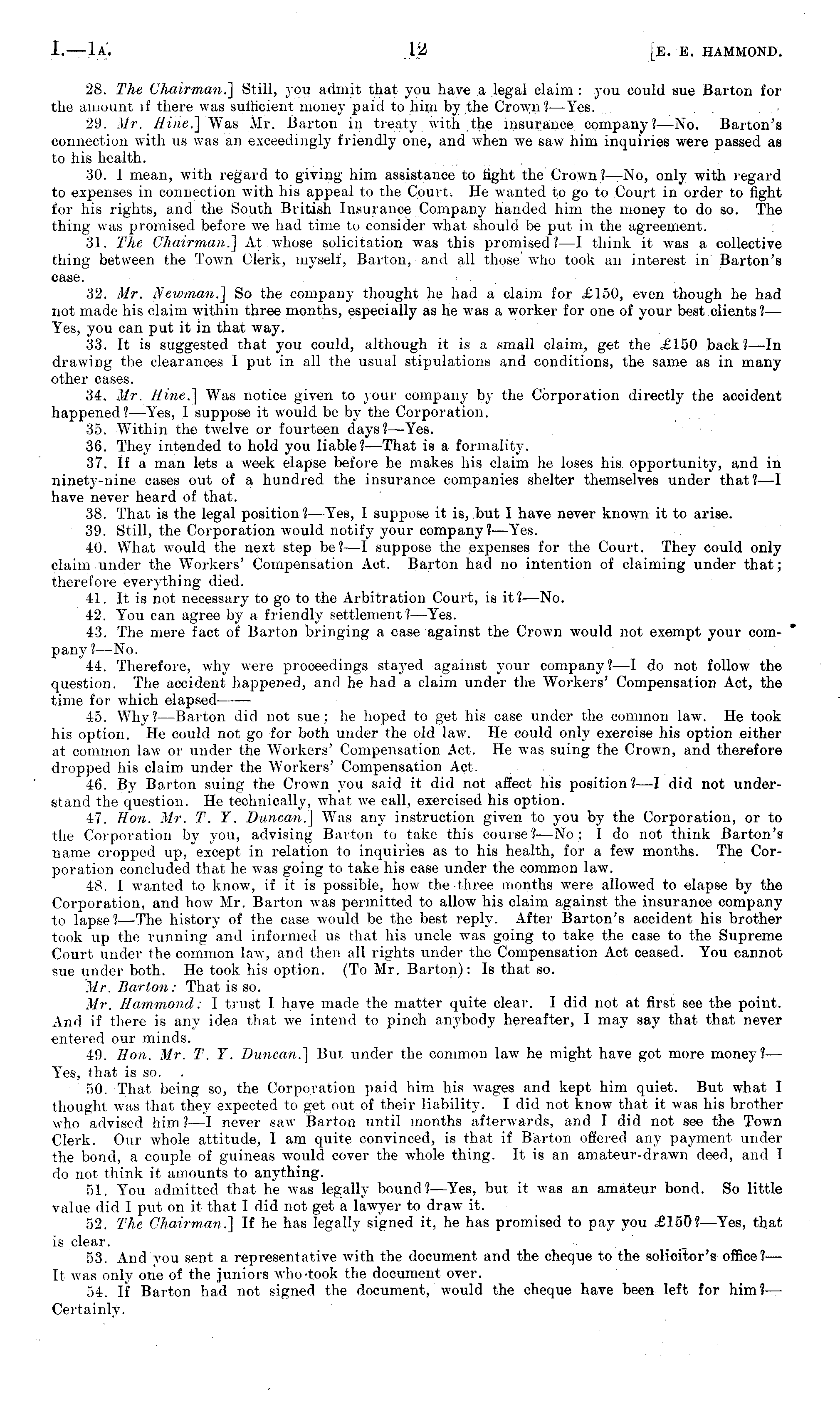28. The Chairman.] Still, you admit that you have a legal claim : you could sue Barton for the amount if there was sufficient money paid to him by the Crown ! —Yes. 29. Mr, Hine.] Was Mr. Barton in treaty with the insurance company?— No. Barton's connection with us was an exceedingly friendly one, and when we saw him inquiries were passed as to his health. 30. I mean, with regard to giving him assistance to fight the Crown?—No, only with regard to expenses in connection with his appeal to the Court. He wanted to go to Court in order to fight for his rights, and the South British Insurance Company handed him the money to do so. The thing was promised before we had time to consider what should be put in the agreement. 31. The Chairman.] At whose solicitation was this promised?—l think it was a collective thing between the Town Clerk, myself, Barton, and all those who took an interest in Barton's case. 32. Mr. Newman.] So the company thought he had a claim for £150, even though he had not made his claim within three months, especially as he was a worker for one of your best clients?— Yes, you can put it in that way. 33. It is suggested that you could, although it is a small claim, get the £150 back? —In drawing the clearances I put in all the usual stipulations and conditions, the same as in many other cases. 34. Mr. lline.] Was notice given to your company by the Corporation directly the accident happened? —Yes, I suppose it would be by the Corporation. 35. Within the twelve or fourteen days? —Yes. 36. They intended to hold you liable? —That is a formality. 37. If a man lets a week elapse before he makes his claim he loses his opportunity, and in ninety-nine cases out of a hundred the insurance companies shelter themselves under that? —I have never heard of that. 38. That is the legal position?— Yes, I suppose it is, but I have never known it to arise. 39. Still, the Corporation would notify your company?— Yes. 40. What would the next step be?—l suppose the expenses for the Court. They could only claim under the Workers' Compensation Act. Barton had no intention of claiming under that; therefore everything died. 41. It is not necessary to go to the -Arbitration Court, is it?— No. 42. You can agree by a friendly settlement? —Yes. 43. The mere fact of Barton bringing a case against the Crown would not exempt your company?— No. 44. Therefore, why were proceedings stayed against your company?—l do not follow the question. The accident happened, and he had a claim under the Workers' Compensation Act, the time for which elapsed 45. Why?— Barton did not sue; he hoped to get his case under the common law. He took his option. He could not go for both under the old law. He could only exercise his option either tit common law or under the Workers' Compensation Act. He was suing the Crown, and therefore dropped his claim under the Workers' Compensation Act. 46. By Barton suing the Crown you said it did not affect his position?—l did not understand the question. He technically, what we call, exercised his option. 47. Hon. Mr. T. Y. Was any instruction given to you by the Corporation, or to the Corporation by you, advising Barton to take this course?—No; I do not think Barton's name cropped up, except in relation to inquiries as to his health, for a few months. The Corporation concluded that he was going to take his case under the common law. 48. I wanted to know, if it is possible, how the three months were allowed to elapse by the Corporation, and how Mr. Barton was permitted to allow his claim against the insurance company to lapse?— The history of the case would be the best reply. After Barton's accident his brother took up the running and informed us that his uncle was going to take the case to the Supreme Court under the common law, and then all rights under the Compensation Act ceased. You cannot sue under both. He took his option. (To Mr. Barton): Is that so. Mr. Barton: That is so. Mr. Hammond: I trust I have made the matter quite clear. I did not at first see the point. And if there is any idea that we intend to pinch anybody hereafter, I may say that that never entered our minds. 49. Hon. Mr. T. Y. Duncan.] But under the common law he might have got more money?— Yes, that is so. 50. That being so, the Corporation paid him his wages and kept him quiet. But what I thought was that they expected to get out of their liability. I did not know that it was his brother who advised him?—l never saw Barton until months afterwards, and I did not see the Town Clerk. Our whole attitude, I am quite convinced, is that if Barton offered any payment under the bond, a couple of guineas would cover the whole thing. It is an amateur-drawn deed, and I do not think if amounts to anything. 51. You admitted that he was legally bound? —Yes, but it was an amateur bond. So little value tlid I put on it that I did not get a lawyer to draw it. 52. The Chairman.] If he has legally signed it, he has promised to pay you £150?— Yes, that is clear. 53. And you sent a representative with the document and the cheque to the solicitor's office? — It was only one of the juniors who-took the document over. 54. If Barton had not signed the document, would the cheque have been left for him?— Certainly.