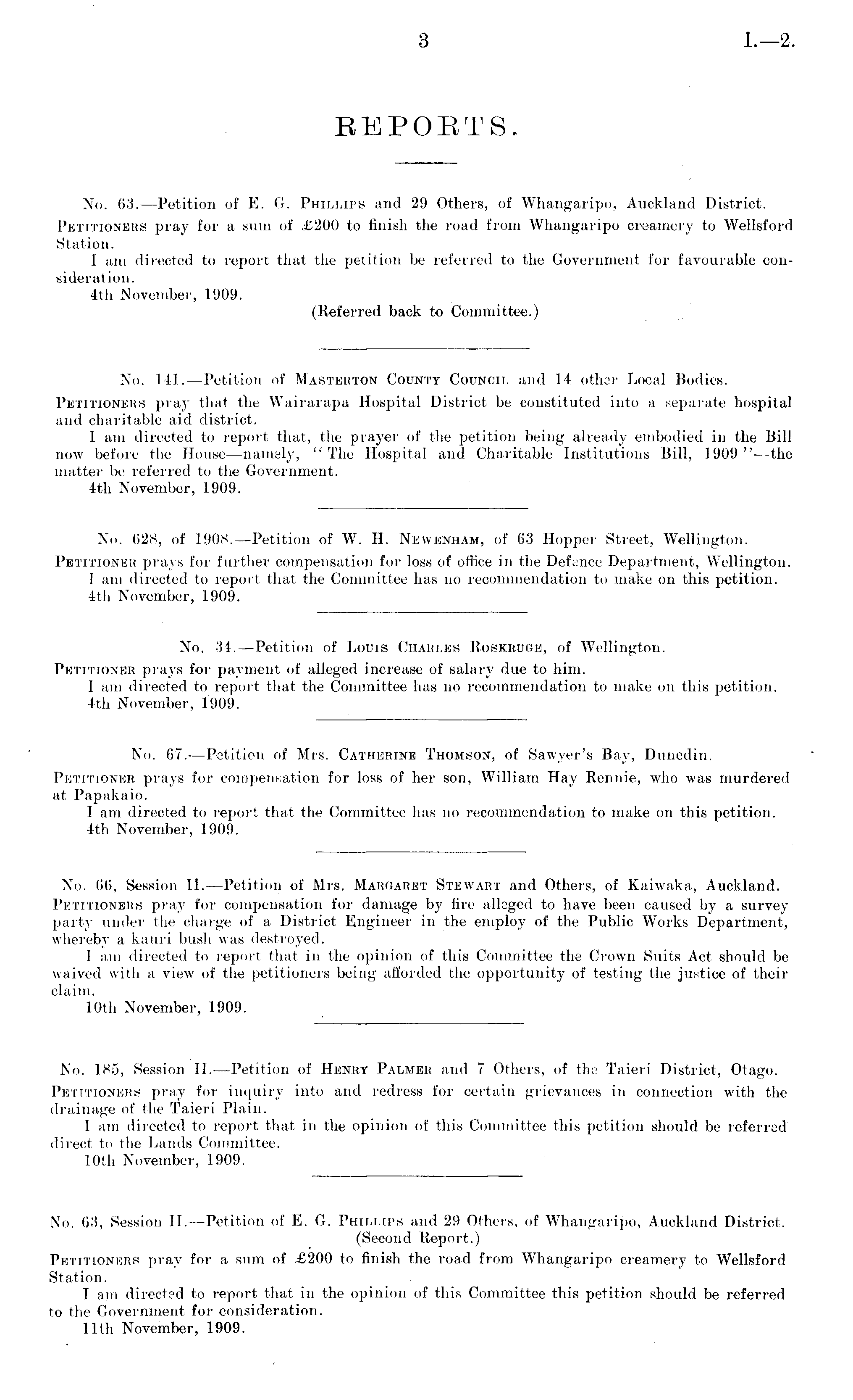 No. 63. —Petition of E. G. Phillips and 29 Others, of Whangaripo, Auckland District. PETITIONERS pray for a sum of £200 to finish the road from Whangaripo creamery to Wellsford Station. 1 am directed to report that the petition be referred to the Government for favourable consideration. 4th November, 1909. (Referred back to Committee.) No. 141.—Petition of Masterton County Council and 14 other Local Bodies. Petitioners pray that the Wairarapa Hospital District be constituted into a separate hospital and charitable aid district. 1 am directed to report that, the prayer of the petition being already embodied in the Bill now before the House—namely, " The Hospital and Charitable Institutions Bill, 1909 " —the matter be referred to the Government. 4th November, 1909. No. 628, of 1908.—Petition of W. H. Newenham, of 03 Hopper Street, Wellington. Petitioner prays for further compensation for loss of office in the Defence Department, Wellington. 1 am directed to report that the Committee has no recommendation to make on this petition. 4th November, 1909. No. 34.—Petition of Louis Chahi.es Roskruge, of Wellington. Petitionee prays for payment of alleged increase of salary due to him. I am directed to report that the Committee has no recommendation to make on this petition. 4th November, 1909. No. 67.—Petition of Mrs. Catherine Thomson, of Sawyer's Bay, Dunedin. Petitioner prays for compensation for loss of her son, William Hay Rennie, who was murdered at Papakaio. I am directed to report that the Committee has no recommendation to make on this petition. 4th November, 1909. No. (Hi, Session ll.—Petition of Mrs. Margaret Stewart and Others, of Kaiwaka, Auckland. Petitioners pray for compensation for damage by fire alleged to have been caused by a survey party under the charge of a District Engineer in the employ of the Public Works Department, whereby a kauri bush was destroyed. I am directed to report that in the opinion of this Committee the Crown Suits Act should be waived with a view of the petitioners being afforded the opportunity of testing the justice of their claim. 10th November, 1909. No. ISS, Session II. —Petition of Henry Palmer and 7 Others, of the Taieri District, Otago. PETITIONERS pray for inquiry into and redress for certain grievances in connection with the drainage of the Taieri Plain. I am directed to report that in the opinion of this Committee this petition should be referred direct to the Lands Committee. loth November, 1909. No. 63, Session ll.—Petition of E. G. Phillips and 2!) Others, of Whangaripo, Auckland District. (Second Report.) Petitioners pray far a sum of £200 to finish the road from Whangaripo creamery to Wellsford Station. T am directed to report that in the opinion of this Committee this petition should be referred to the Government for consideration. 11th November, 1909.